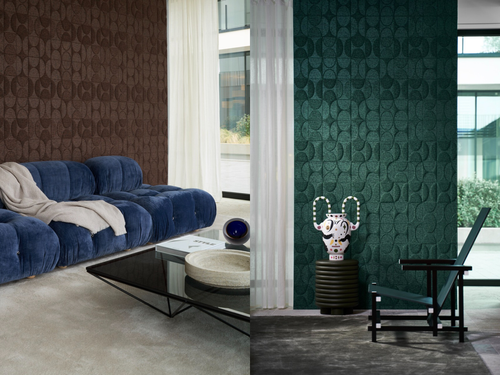 首先「Icons 魅力巨星」系列大量運用幾何結構作為設計骨架。方格、弧線、模組化的排列,看似理性而秩序分明,卻因材質的介入而產生溫度。光線在啞光與亮面之間遊走,陰影在凹凸之間停留,使牆面隨著一天的時間而不斷變化,彷彿呼吸一般。「Curve 弧形」的存在,像是一段被放慢的旋律。弦月般的弧形浮雕,結合立體絨毛材質,使牆面呈現出柔軟而內斂的節奏。它並不急著吸引目光,卻在不經意間,讓人感受到一種復古而安定的情緒,特別適合需要沉澱與思考的空間。「Shagreen 鯊魚森林」則將靈感取自珍稀皮革的有機結構。細膩卻不過度修飾的紋理,在牆面上展現出一種時尚而冷靜的氣質。當啞光與光澤交錯出現,空間的層次便隨之被拉開,顯得克制而高雅。