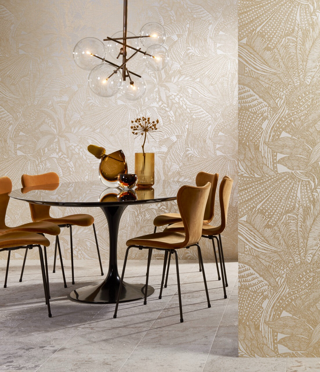 再者,在「Platinum 白金世界」的設計中,金屬不再只是冰冷與距離的象徵。經過風化效果處理的方格式樣,使每一個單元都彷彿承載著時間的痕跡。那是一種被歲月磨平稜角後的溫柔,當光線落下,牆面浮現出低調的光澤,為空間注入一種安靜卻堅定的力量。「Symbiosis 共生之牆」則更像一場夢境。植物、羽毛與藤蔓交織而成的圖像,在柔和金屬色調與明顯光澤之間游移,帶來曖昧而迷人的視覺感受。它既不完全屬於自然,也不全然來自人工,而是在兩者之間找到一種平衡,喚醒人們對未知與探索的渴望。