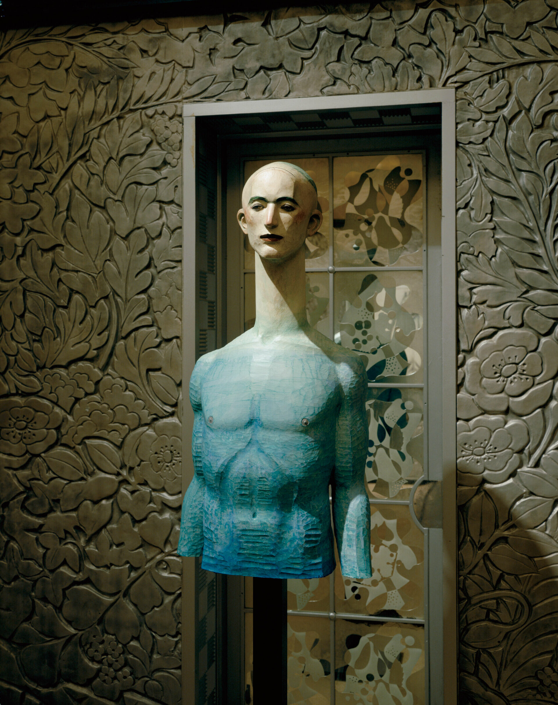 舟越桂 Katsura FUNAKOSHI《A Green Lake Within Myself 我內心的綠湖》Painted camphor wood and marble 彩繪樟木和大理石,103.5 x 54 x 28.3 cm,2008