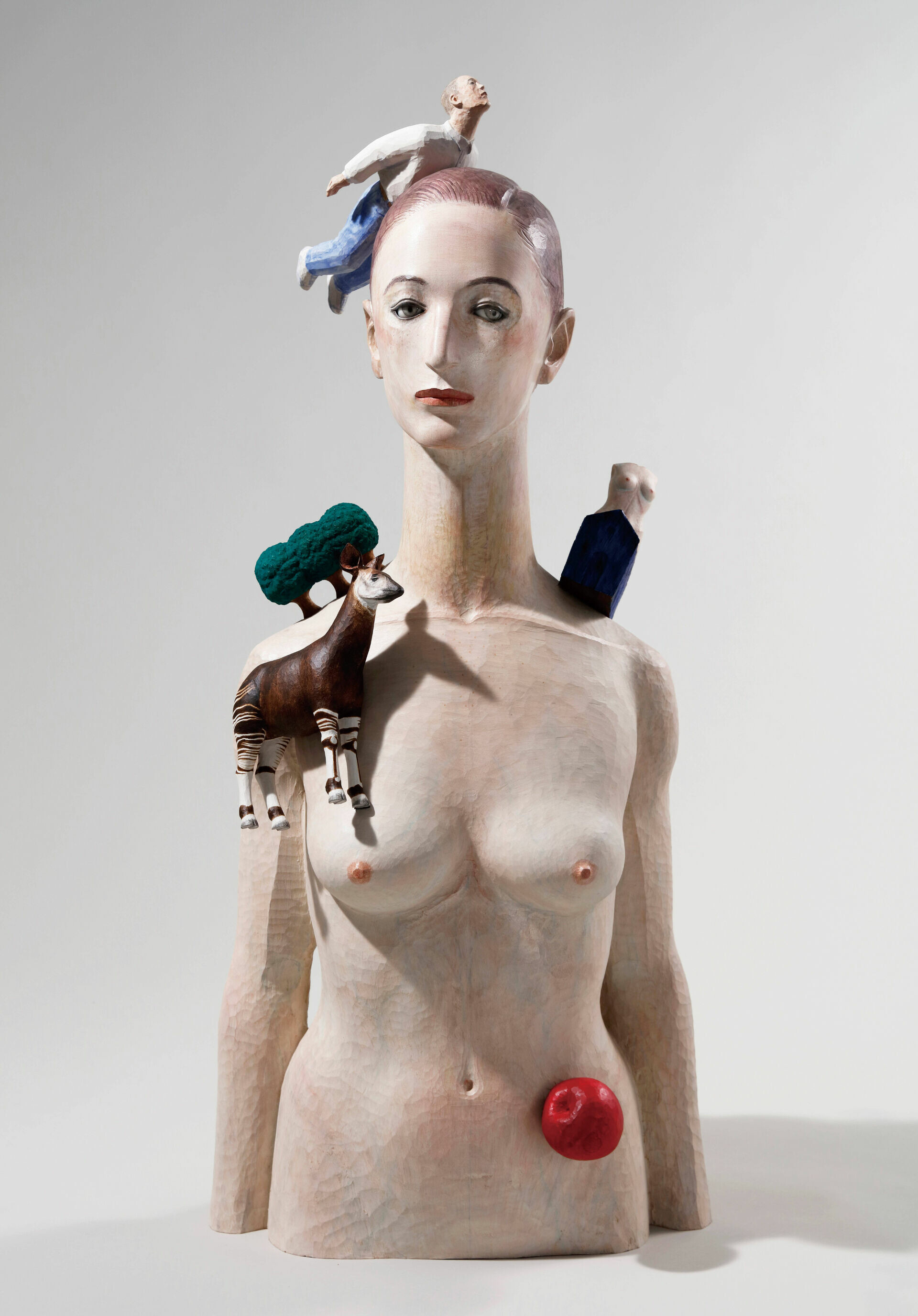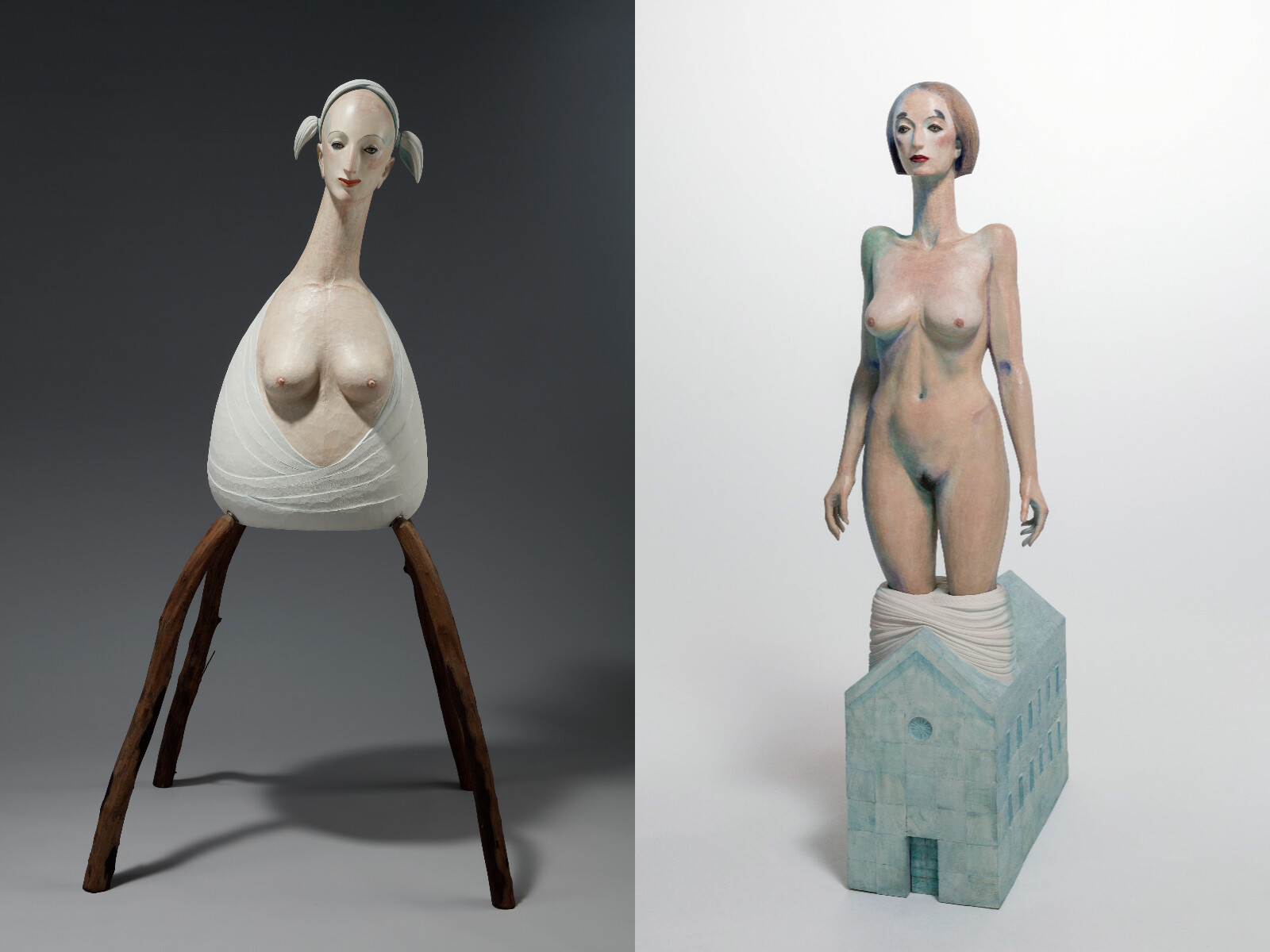 (左) 舟越桂 Katsura FUNAKOSHI《To Forgive the Sea 原諒大海(直譯)》Painted camphor wood, marble and miscellaneous tree 彩繪樟木、大理石和各種木材,187.5 x 102 x 82 cm,2016,Courtesy Nishimura Gallery;(右) 舟越桂 Katsura FUNAKOSHI《Curious Forest 好奇的森林(直譯)》Painted camphor wood and marble 彩繪樟木、大理石,203 x 59 x 90 cm,2014, Photo Courtesy to Tomoki IMAI