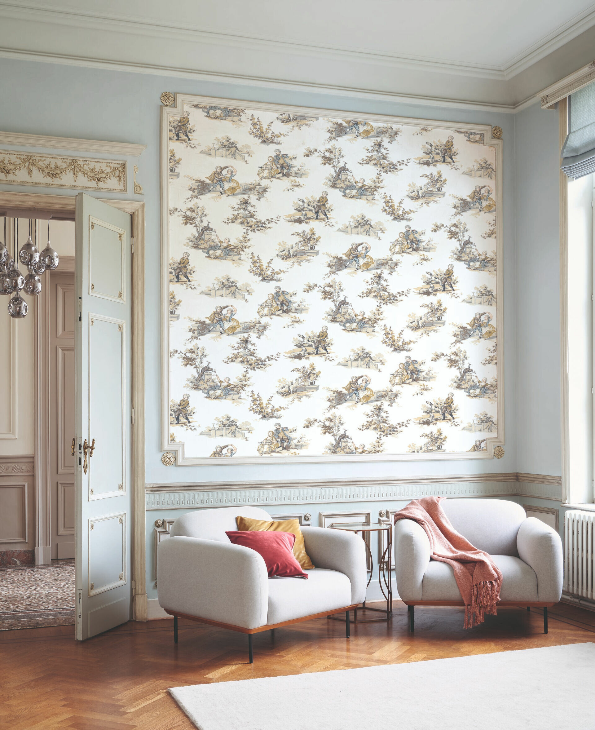 在歐洲紡織史上,「茹伊印花 Toile de Jouy」是一段優雅的章節。其名源於法國巴黎西南的 Jouy-en-Josas,當時由 Christophe‑Philippe Oberkampf 創立的印刷工場,開創了印花棉布的傳奇。印花的圖案常以淡雅的單色敘事風景或細緻植物為主,背景常為米白或淺灰,而主體為深藍、紫羅蘭、紅赭。法國居家裝飾品牌 Casadeco 於此傳統基礎之上,推出「茹伊印花之美(二)Les Belles Toiles de Jouy 2」這一系列壁紙與布藝,意在讓古典再次於現代空間中綻放。100 %無紡壁紙與協調布料,為這個具標誌性的設計帶來優雅重塑。這一系列,正是向歷史與時光致敬,也是從經典出發的啟程。