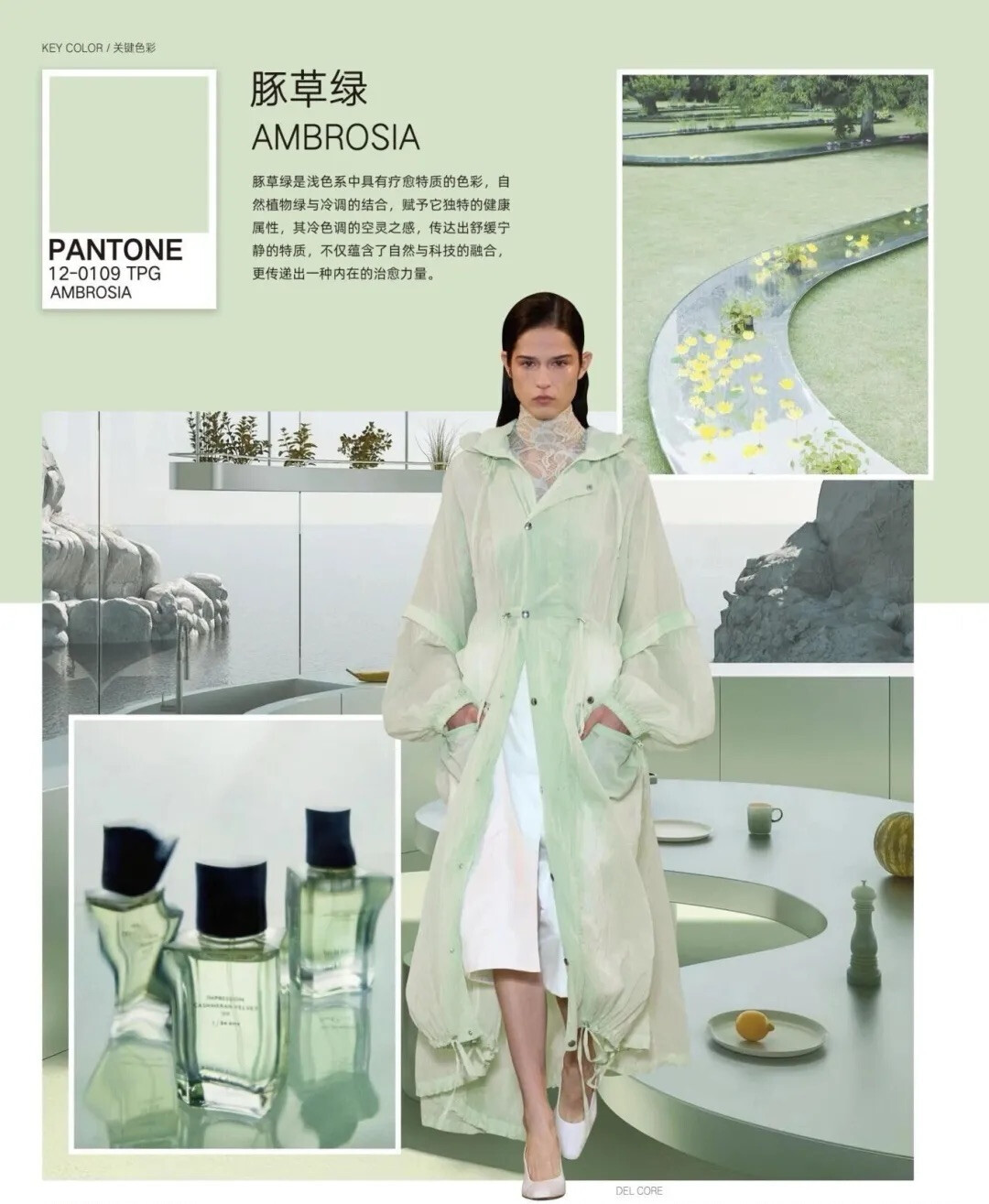豚草綠作為自然植物的清新代表,融入新中式設計,將療癒的特質延伸至空間布置與材質選擇中。它的淡雅冷調,能夠平衡視覺焦點,使空間呈現自然、舒緩的氣息。畫面粉則突破了傳統粉色的甜膩,低飽和灰調削弱色彩的張力,結合哑光質感與暖光黃點綴,賦予居家或穿搭更多層次,猶如可露麗脆殼下柔軟內餡的豐富口感。這種色彩的組合,不僅保留了法式甜點的浪漫氣息,也帶來現代家居設計的生活感和適配性。