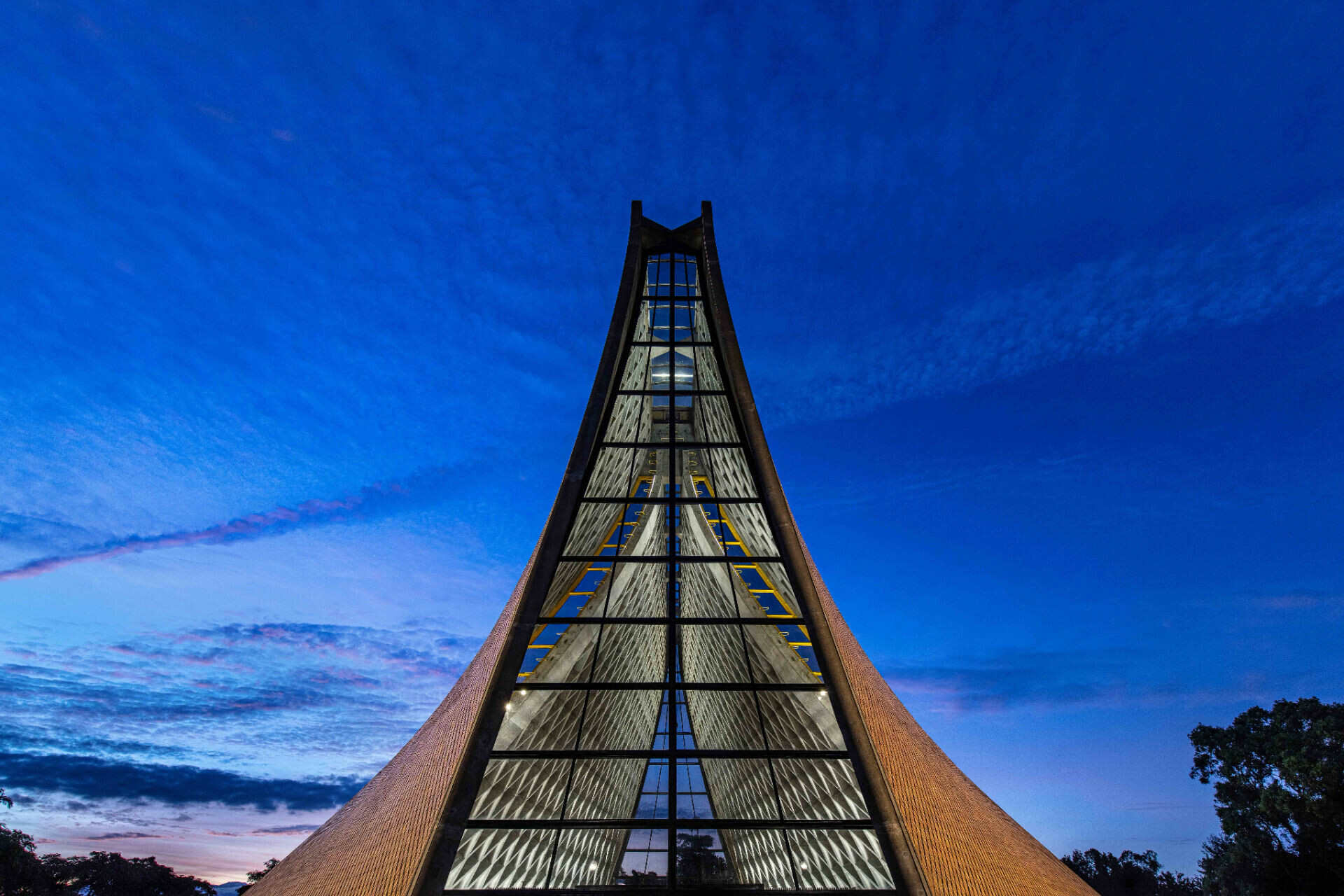 此外,歷史建築向來是最考驗光環境設計的場域。今年入圍的三件老建築 ——「路思義教堂」、「臺灣文學糧倉」、「國立歷史博物館」—— 皆以細膩光線敘述時間的紋理。首先「路思義教堂」的弧面線條在光下更顯純粹,如同被時間雕琢的雕塑,被光悄然托起。修復後的人工光以近似自然天光的方式介入,不急著宣示存在,而是沿著曲面輕柔滑落,使教堂在白晝與夜晚呈現兩種同樣動人的表情,展現如祈禱般安寧的神性。如此細膩的光不張揚,卻帶來近似祈禱的安寧,也讓經典建築在時代更迭中持續被理解,使走近的人得以在光影間共享片刻純淨的靈性。