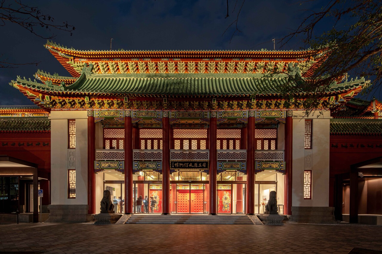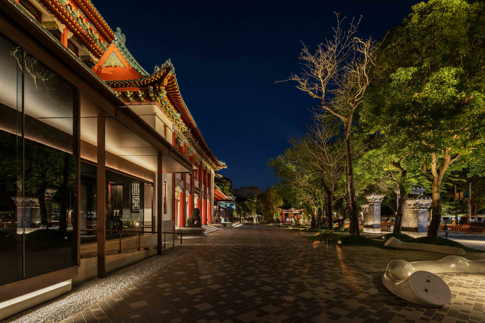 再來的「臺灣文學糧倉」則在新舊之間找到對話的方式。磚造牆、木桁架、格子窗與模組化照明並存,西側引入自然光、東側重新整理動線,使光在室內如書頁間流動,讓文學得以以另一種形式居住於空間之中。此外,「國立歷史博物館」在修復後的光之語彙更加成熟。屋脊、斗拱、彩繪與紅牆綠瓦,皆在暖光勾邊下展現立體層次;玻璃迴廊與輕鋼坡道則以冷光描繪現代感。新舊交織,使博物館如同植物園旁的一盞含蓄燈籠——不炫目,卻溫暖。這些光影並非華麗,而是深刻。它們引導我們凝視歷史,也在歷史裡照見當代。