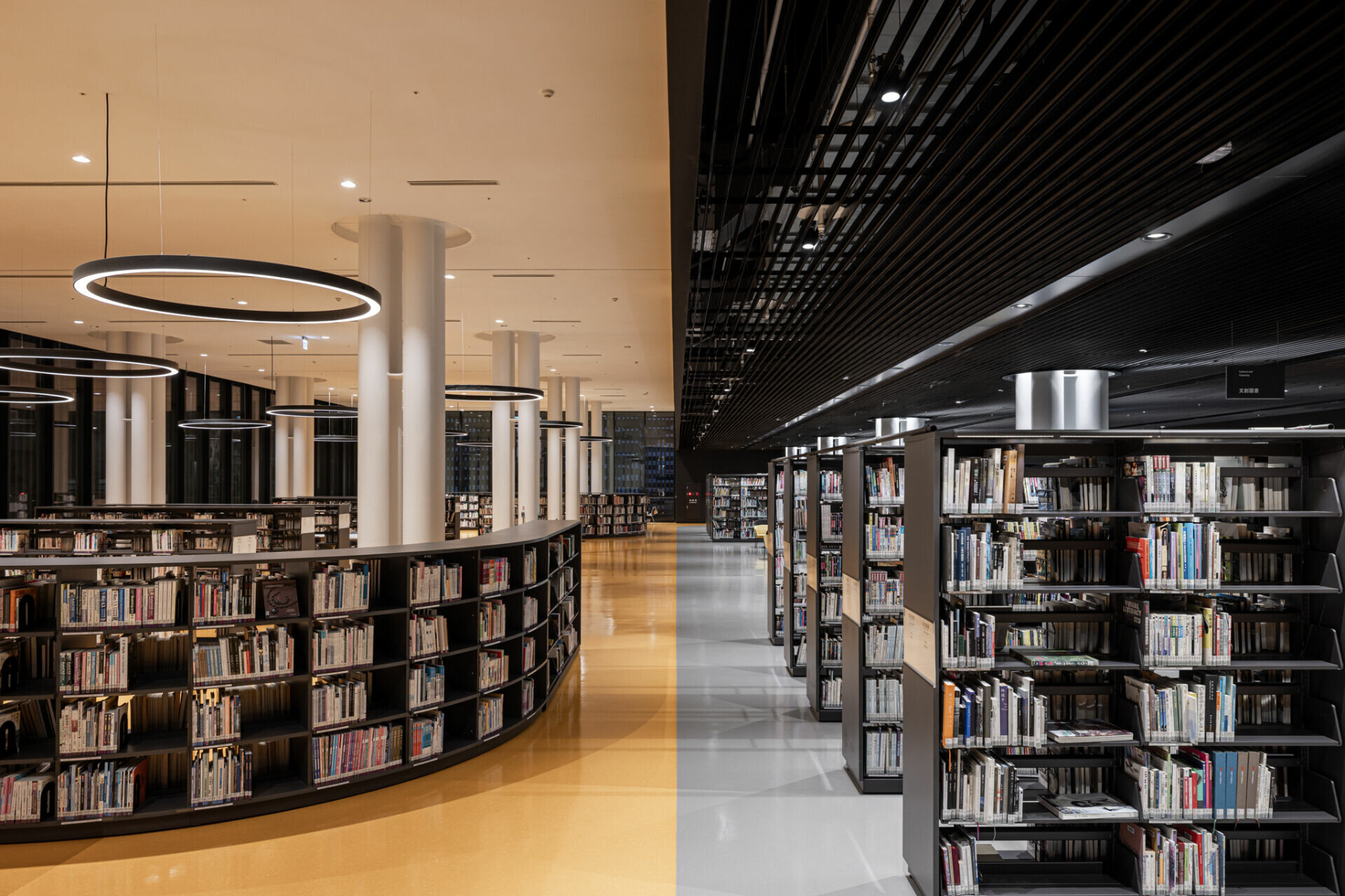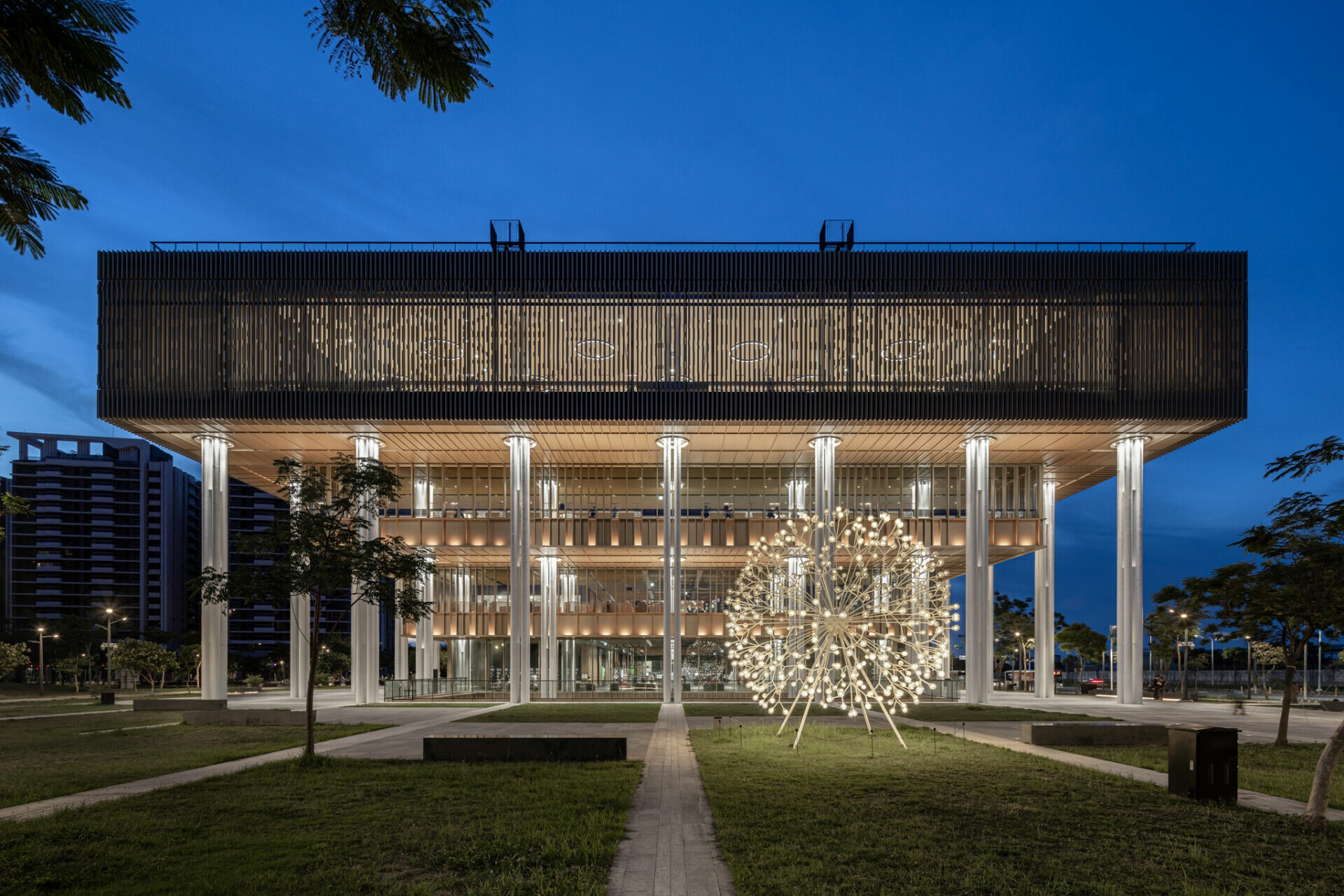 「臺南市立圖書館」以逐層退縮的量體、象徵竹林意象的圓柱立面,以及承載城市記憶的屋頂窗花,構築出一座結合歷史韻味與現代語彙的當代文化場域。白日裡,光線穿透格柵細縫,輕柔灑落在書牆與閱讀座位之間,形成隨時間變化的光影節奏,使讀者在光的流動中感受空間的呼吸;午後的斜陽進入館內,更讓層層光斑如水波般漫延,為閱讀增添一分溫度。而當夜幕降臨,屋頂窗花的光從建築高處緩緩外溢,沿著退縮的立面形成柔和的光瀑,彷彿建築本身在夜色裡輕聲吟唱,延續白日的文化能量。於此,光不僅照亮書頁,也照亮城市的想像,使閱讀成為台南夜晚最溫暖、最有生命力的風景之一。