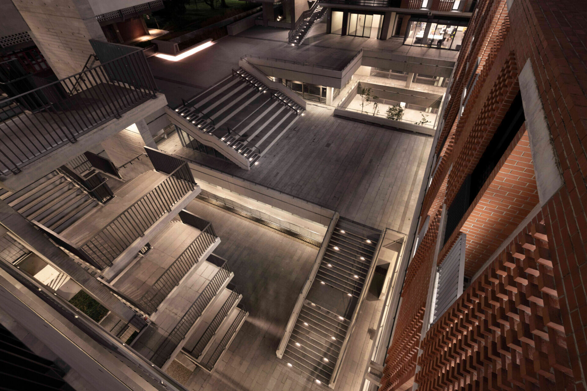 另一方面,「臺灣大學人文館」與「臺南市立圖書館」兩件作品,代表今年決選中最具典雅底蘊與深層思考的文教場館設計,也象徵光如何在知識的海洋中擔任引路者。歷時 17 年完工的臺大人文館,如同一首由空間與光共同譜寫的長詩。建築以四合院語彙回應校園歷史脈絡,白日裡,在古蹟群的背景中顯得格外沉穩,光線沿著立面、階梯與內院漫步,猶如翻閱一冊緩慢展開的人文史書。夜幕降臨後,照明設計化作空間的靈魂,大階梯、空橋、垂直樓梯與廊道被一條柔和的光之河串聯,使走入其中的人彷彿踏上了一座以光書寫的立體城市。