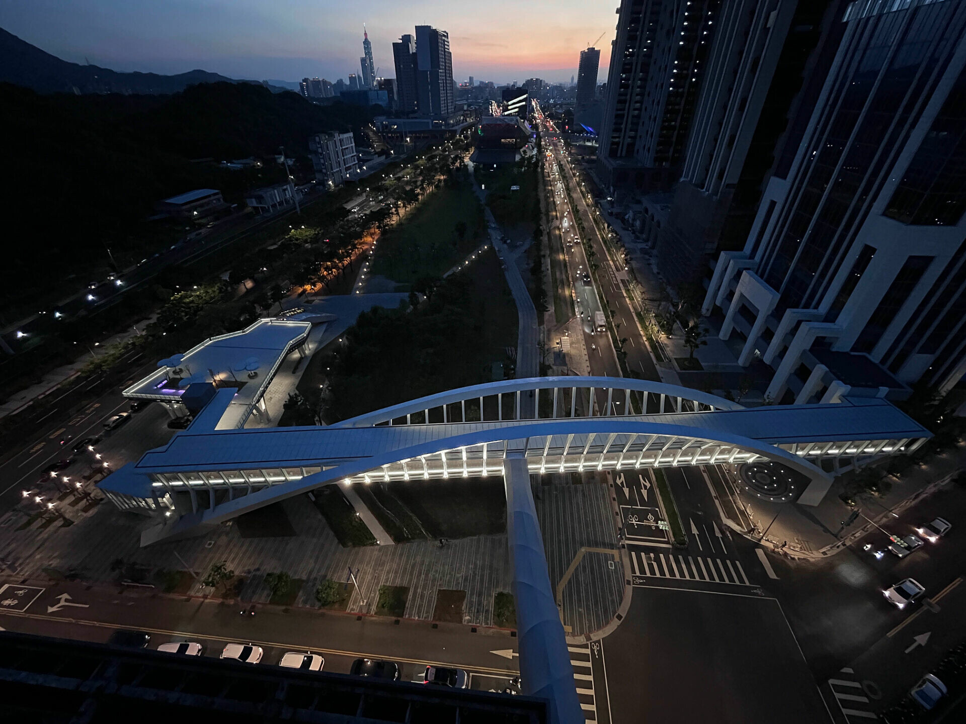 再來是「南港立體連通平台」與「BRUN TIANMU」兩件作品,展現了城市光線的另一種姿態 —— 不強調宏偉與劇場式的張力,而是更貼近人心、更接近日常生活節奏的城市光語。南港立體連通平台以「行走的人」為核心思考,讓光在城市中扮演最體貼的陪伴者。燈具被巧妙隱藏在橋體內部、欄杆邊緣與階梯縫隙中,以間接照明引導視線與步伐,讓行人不必被刺眼光源干擾,也不需擔心燈具突兀外露影響安全。夜色降臨後,平台化為一條溫柔而安定的光帶,在南港的都市紋理間悄悄伸展,使夜間移動成為一種不慌不忙、安心而舒適的旅程。城市在這裡不再冰冷,而是多了一份關懷與溫度。