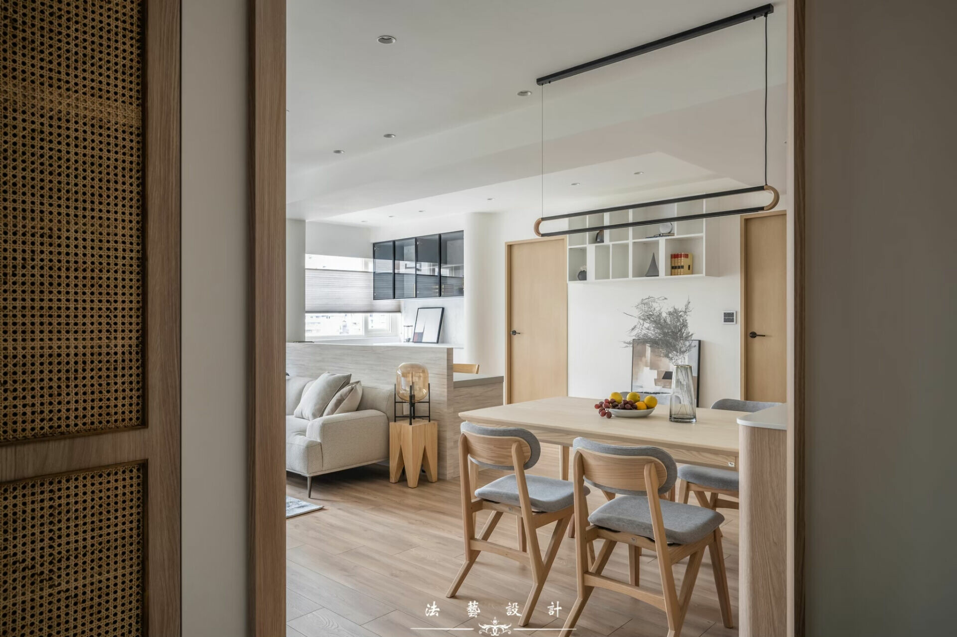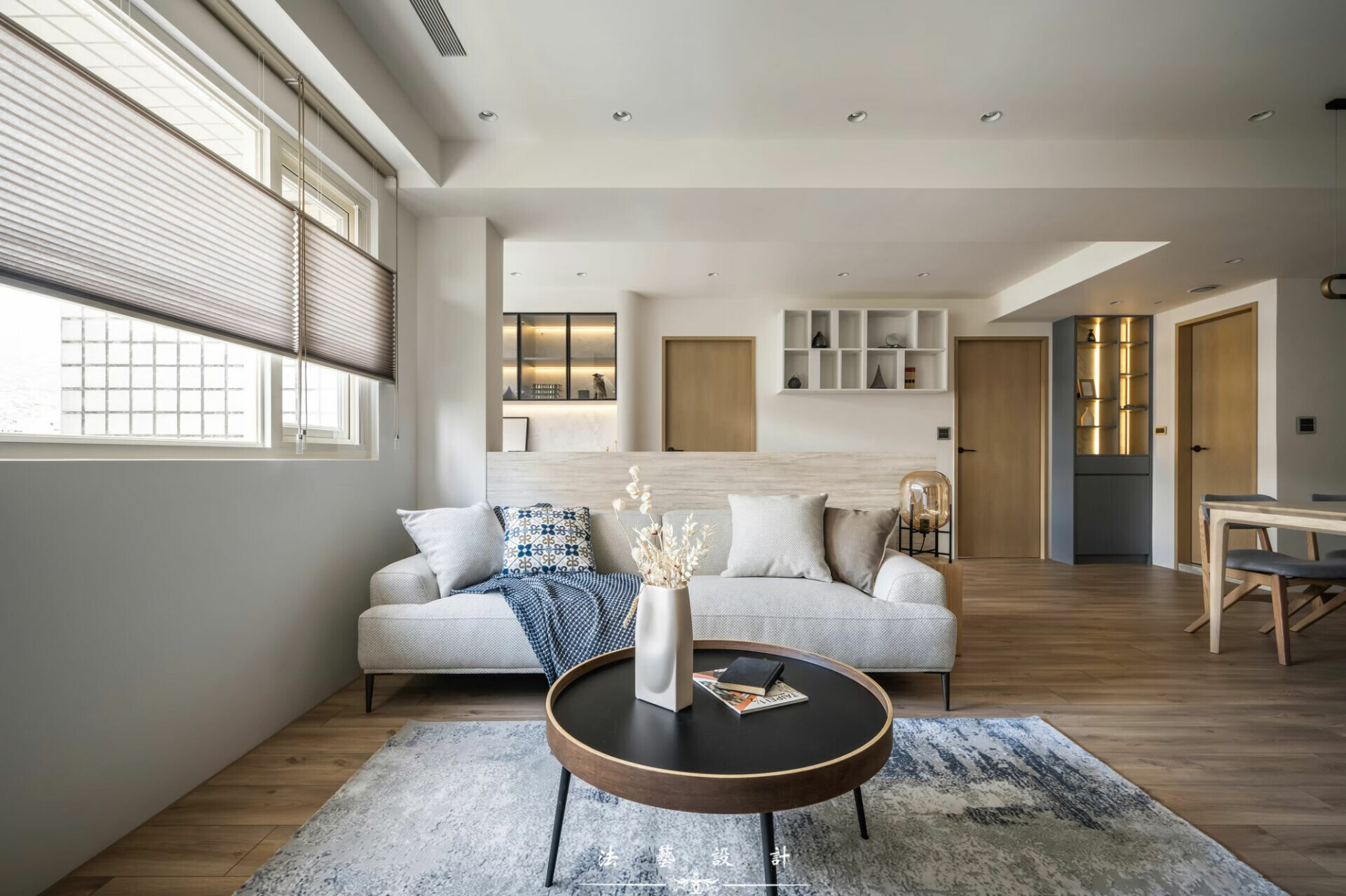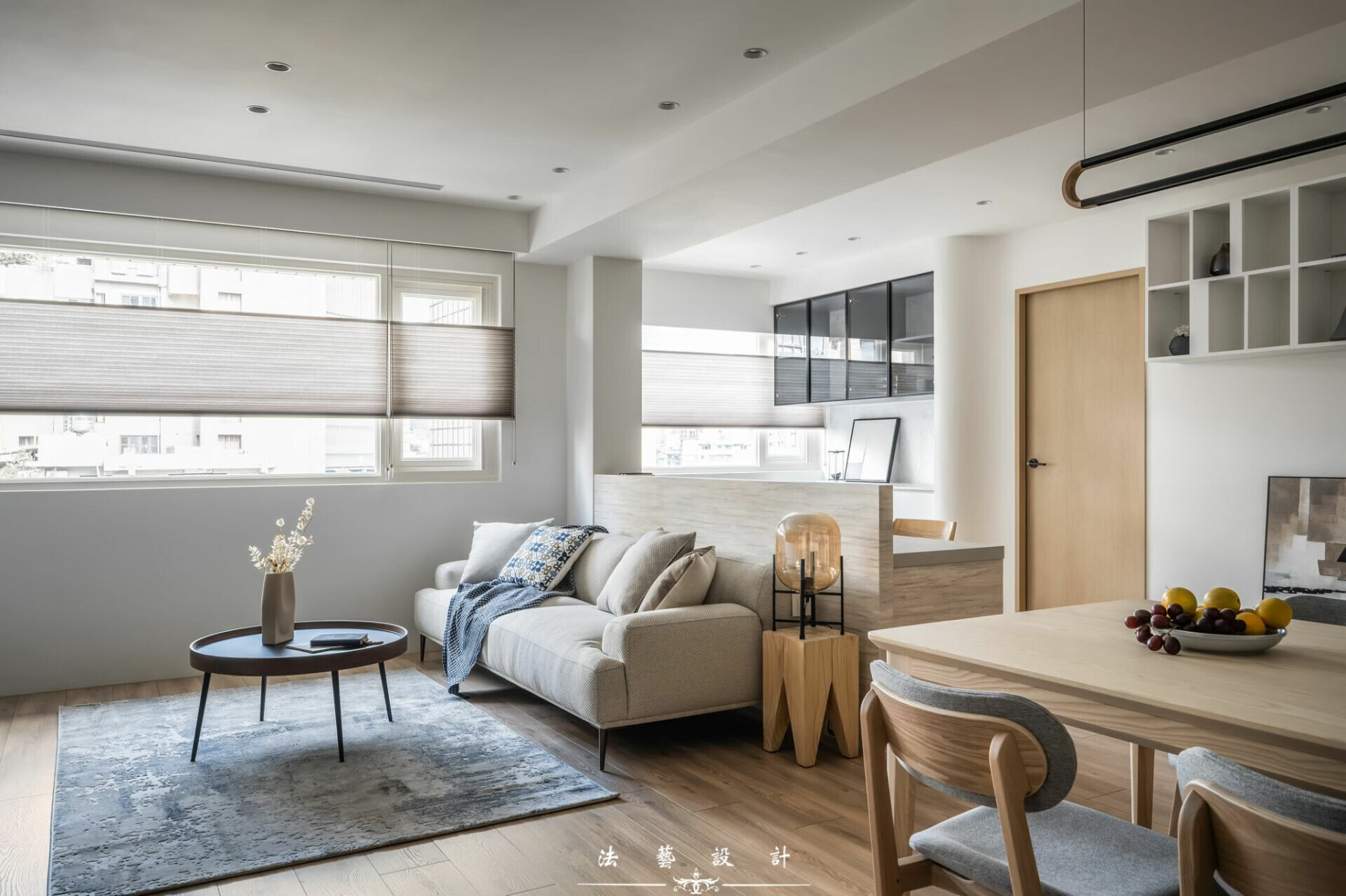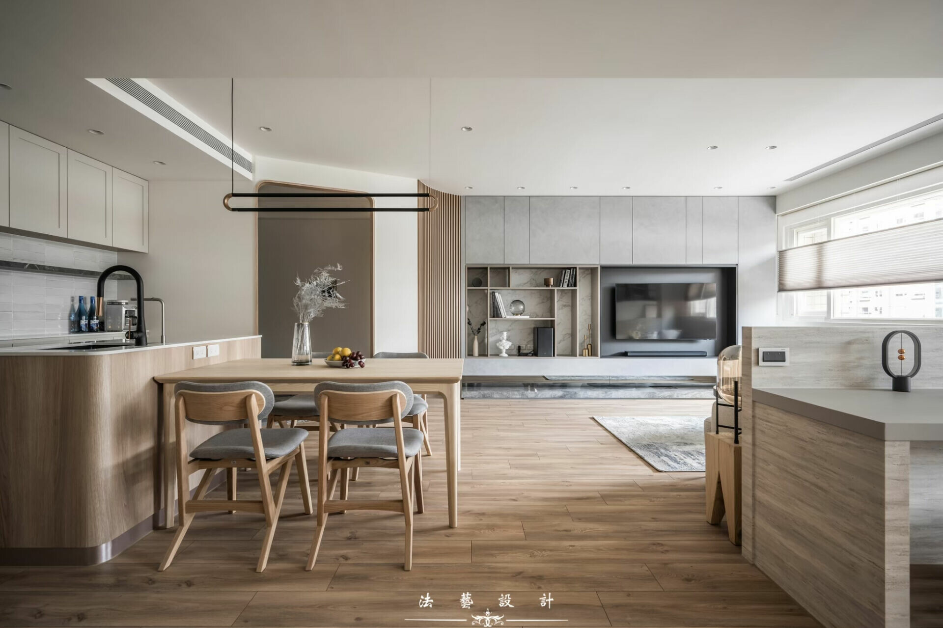 然而,客廳與餐廳之間的窗景,是整個空間最富詩意的段落。風琴簾的蜂巢結構,隨著光線伸縮,像是在演奏一首屬於春天的法式風琴曲。光不再只是照明,而是一種節奏,一種被「拉開」與「收起」的生活韻律。淺灰色沙發後方,是開放式書房。沒有實牆,卻有界線;沒有阻隔,卻保有安靜。這樣的設計,像是悄悄拆除家人之間那道無形的牆,讓視線、對話與情感得以自由流通。光線在此被引入、被分享,閱讀與陪伴同時發生。空間不再只是功能的堆疊,而是一種關係的編織。