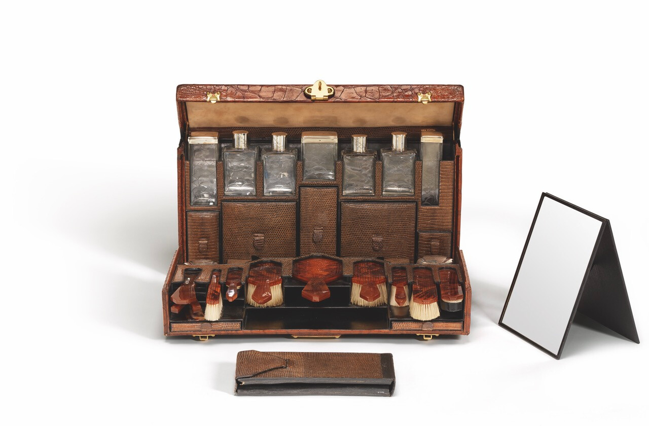 當我們接下來進入《裝飾藝術宣言》空間,便被幾何線條、金屬光澤與柔韌皮革所環繞。那是一場視覺的交響:矩形、斜線、弧形交錯;光與影在銅質拉絲與鏡面金屬之間彈奏。從汽車行李箱到晚宴包,從大型衣櫥箱到精緻皮件,每一件作品都是一種幾何的宣告,也是對未來的向往。這些設計不僅有形,更有節奏感,如同爵士樂的節拍在物件之間跳躍。它們打破華麗與實用的隔閡,讓器物自有態度。當觀者的目光在精準的線條中遊走,彷彿能感受那一代設計師對秩序與節奏的深情。