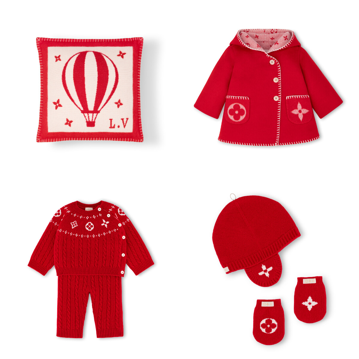 路易威登在其首個嬰兒系列中特別推出全新膠囊系列,(左上至右下)BALLOON CUSHION 熱氣球抱枕 - 紅 、雙面大衣、JACQUARD KNITTED SET RED 紅色針織衣、Peruvian 帽子連指手套套裝。