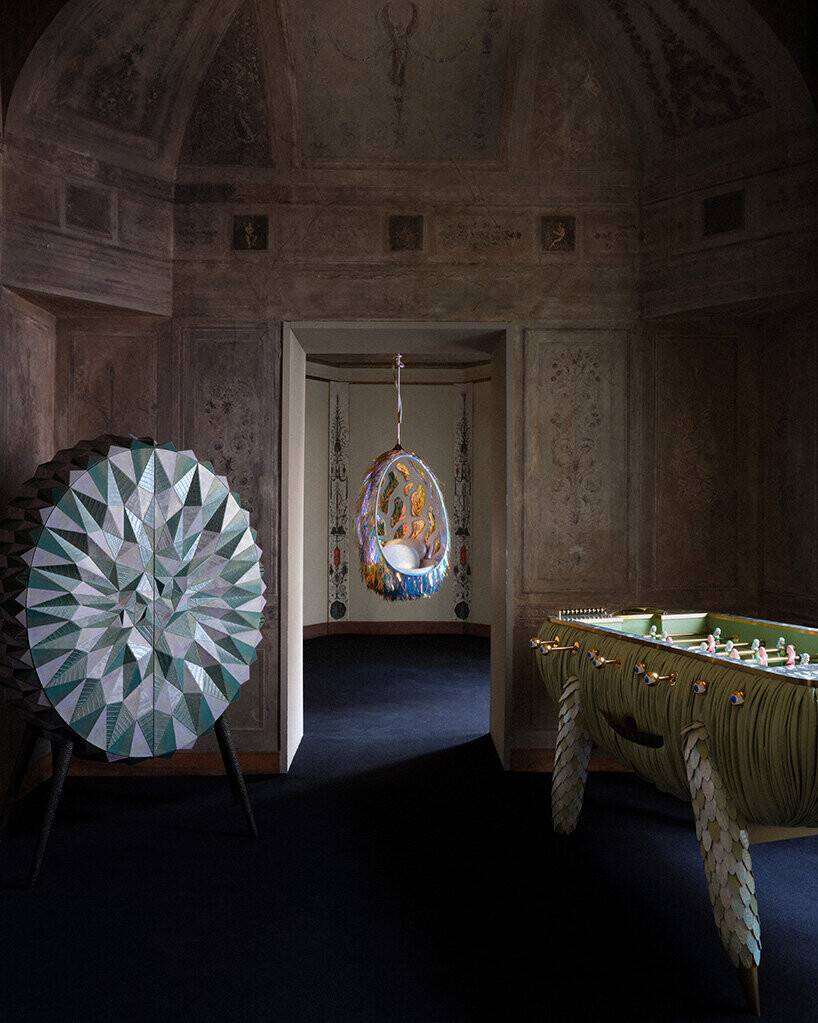 The Boudoir 廳展示了兩件非凡作品,為空間注入了水生綠色調:一件是鑲嵌著珍稀皮革細工的「Cabinet Kaléidoscope 萬花筒櫃」,另一件是由 Estudio Campana 創作,設計獨特、棲息著美人魚的非凡「Baby-foot 嬰兒足球桌」,與它們並列展出的是新款 Cocoon Dichroic 吊椅