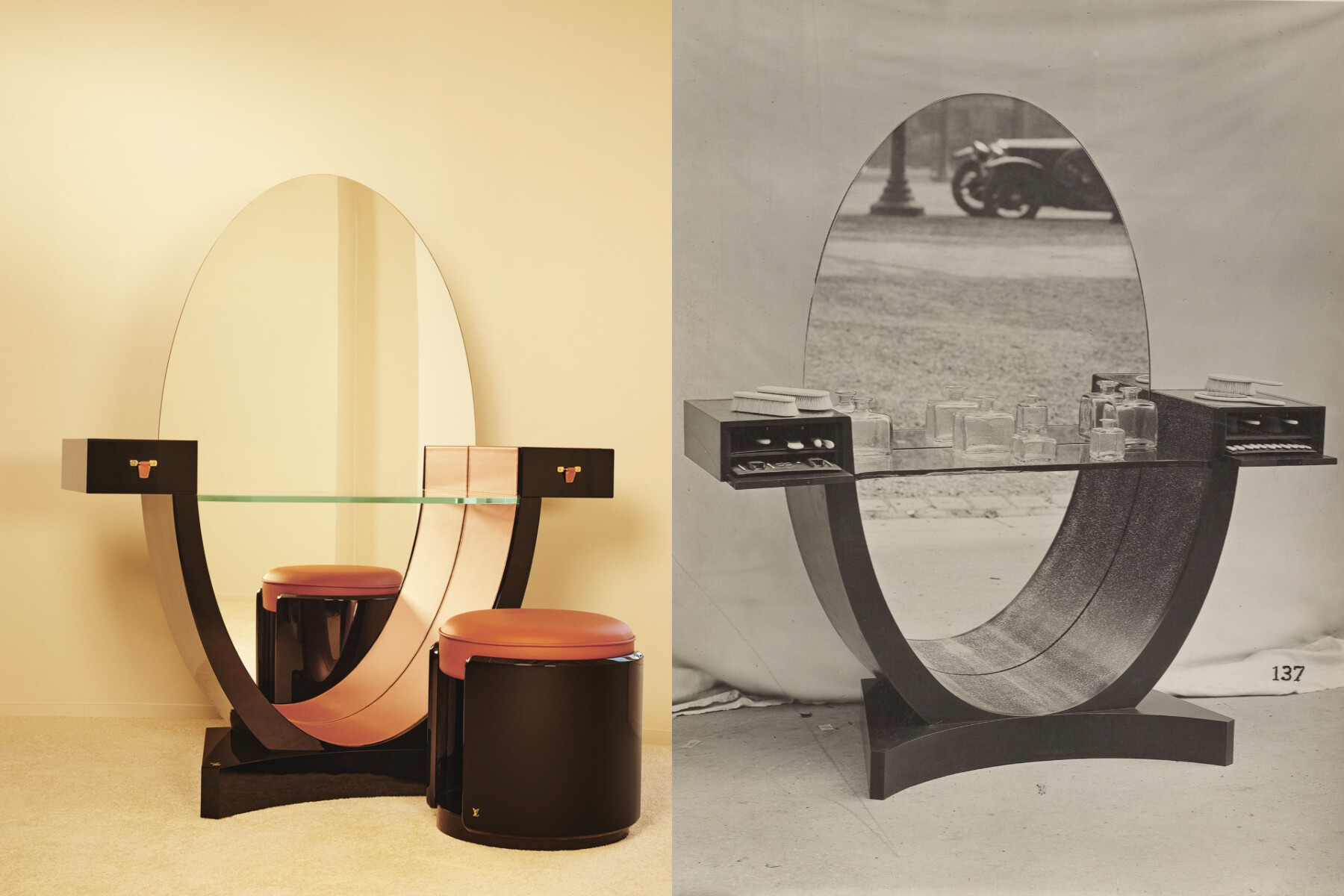 由藝術家皮耶.勒格蘭(Pierre Legrain)於 1921 年設計的圓拱形梳妝台是路易威登的首款家具(右),如今以亮漆木材和 Nomade 皮革創意煥新(左),展示融合線條與功能的不朽設計理念