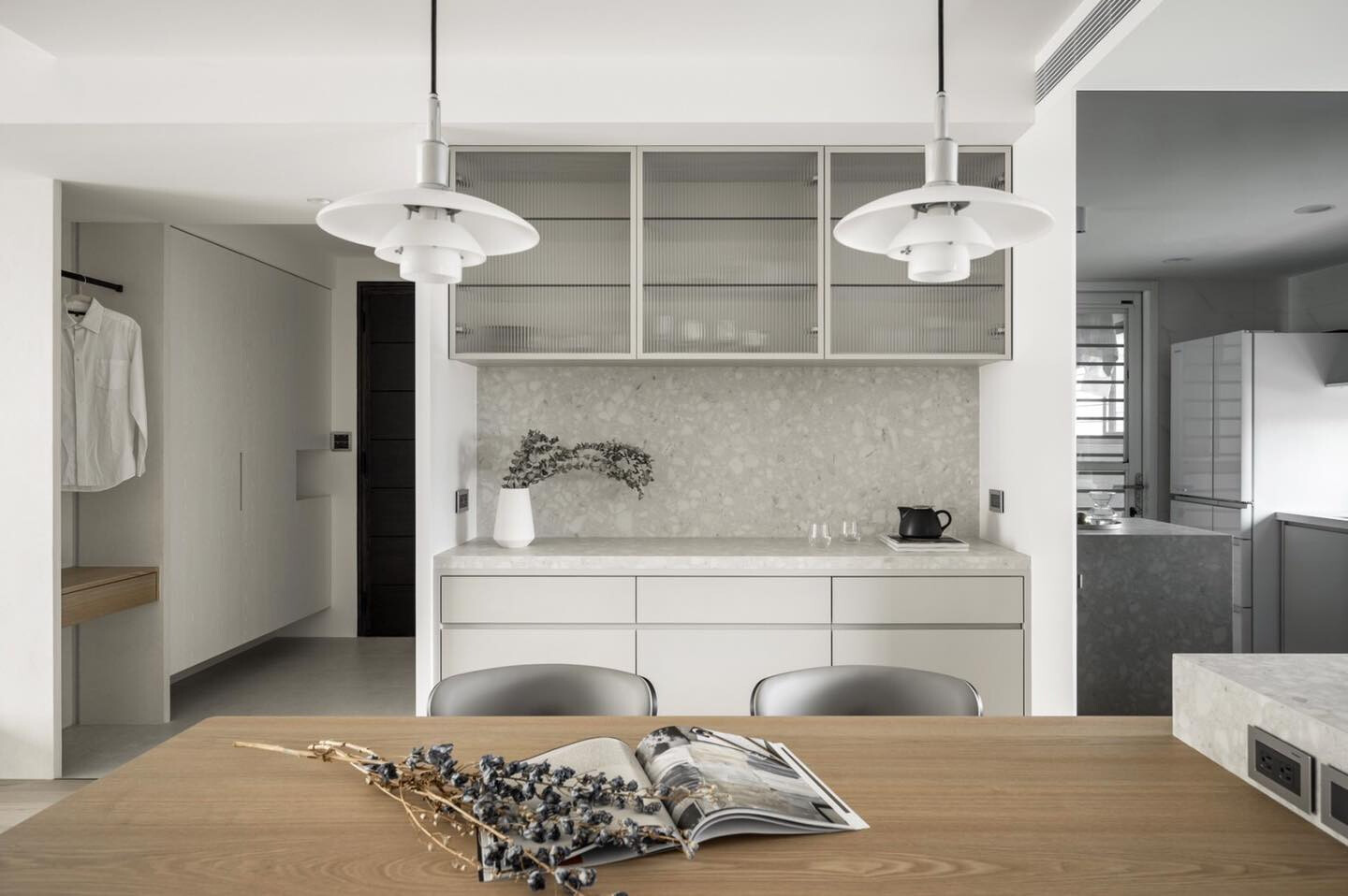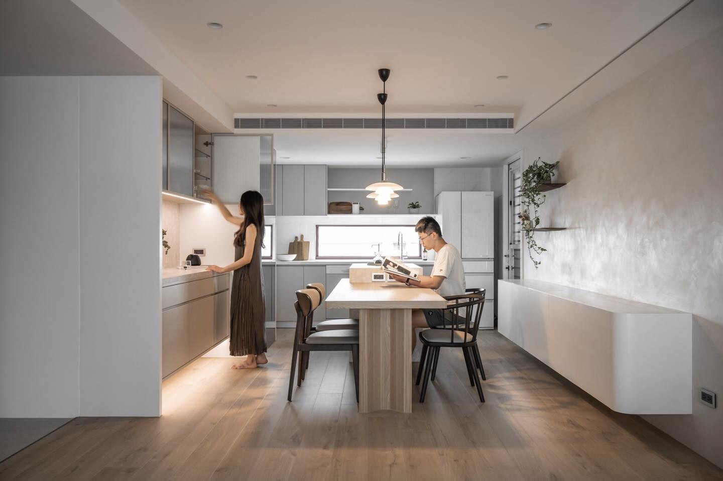 白,在此並非單一色彩,而是一種包容光線的狀態。設計團隊選擇以米灰與柔白為主調,讓空間保有足夠的留白,使視覺得以休息,心緒得以沉澱。窗簾在其中扮演關鍵角色,透光而不透明的質地,讓光線進入卻不侵擾,為有序的機能配置注入輕盈的呼吸感。這樣的白,不追求冷冽的極簡,而是帶著溫度的純淨。它與木質的自然紋理相互映襯,柔化結構線條,使空間在理性規劃中仍保有人文氣息。光影隨時間推移而改變,白色牆面成為一天之中最誠實的紀錄者,默默標記著生活的流動。
