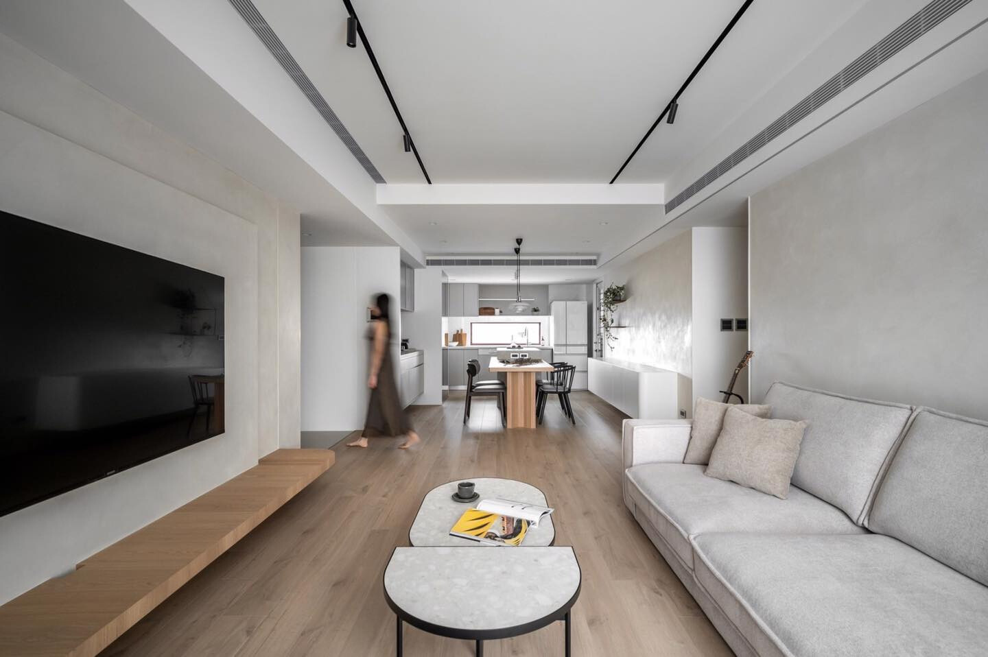空間的開放,來自於對生活型態的重新理解。設計不再受制於傳統格局的劃分,而是以功能聯動作為出發點,重新解讀空間語言。公共與私領域之間的界線被柔化,動線在光影與窗簾的引導下自然展開,使居住行為得以順勢而行。材質的選擇刻意避免過度堆疊,捨去厚重與繁複,只留下真正必要的存在。大面積的手作塗料牆面,在光線洗禮下呈現細膩層次,彷彿為空間譜寫一首緩慢而安定的樂章。這裡沒有喧囂的設計語彙,只有讓人願意停留的平靜,邀請居住者將生活的痕跡慢慢鋪陳其中。