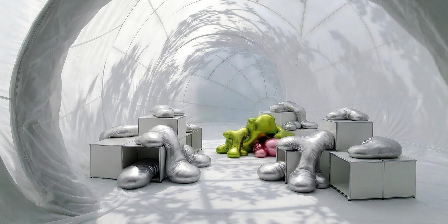這項名為「真實的復興」(Renaissance of the Real)的裝置藝術,是國際知名的挪威建築事務所 Snøhetta 與瑞士家具品牌 USM 在 2026 年米蘭設計週期間,於米蘭羅瓦蒂基金會(Fondazione Luigi Rovati)花園共同打造的跨界場域。設計團隊巧妙地將 USM 標誌性的 Haller 鋼管構架轉化為建築骨架,與受壓收縮、隨風膨脹的半透明白色織物膜交織在一起。這種硬朗金屬線條與柔軟氣體體積的強烈對比,不僅模糊了室內外的界線,更打破了家具與建築的傳統分野。參觀者穿梭於綠意環繞的開放框架後進入室內,會感受到光線、聲學與氣味共同營造的感官洗滌。內部空間佈置了模仿外部格柵的模塊化座椅,並隨處點綴著如液體般流淌、帶有金屬質感的不規則充氣物,其重力感與有機形態誘發觸摸慾望。此外,展場內每日舉辦的黑膠聽賞會,透過類比音頻進一步強化了實體存在感。這是一場關於感知與身體對話的實驗,讓觀者在米蘭設計週的喧囂中,重新聚焦於當下的感官體驗與人際互動。