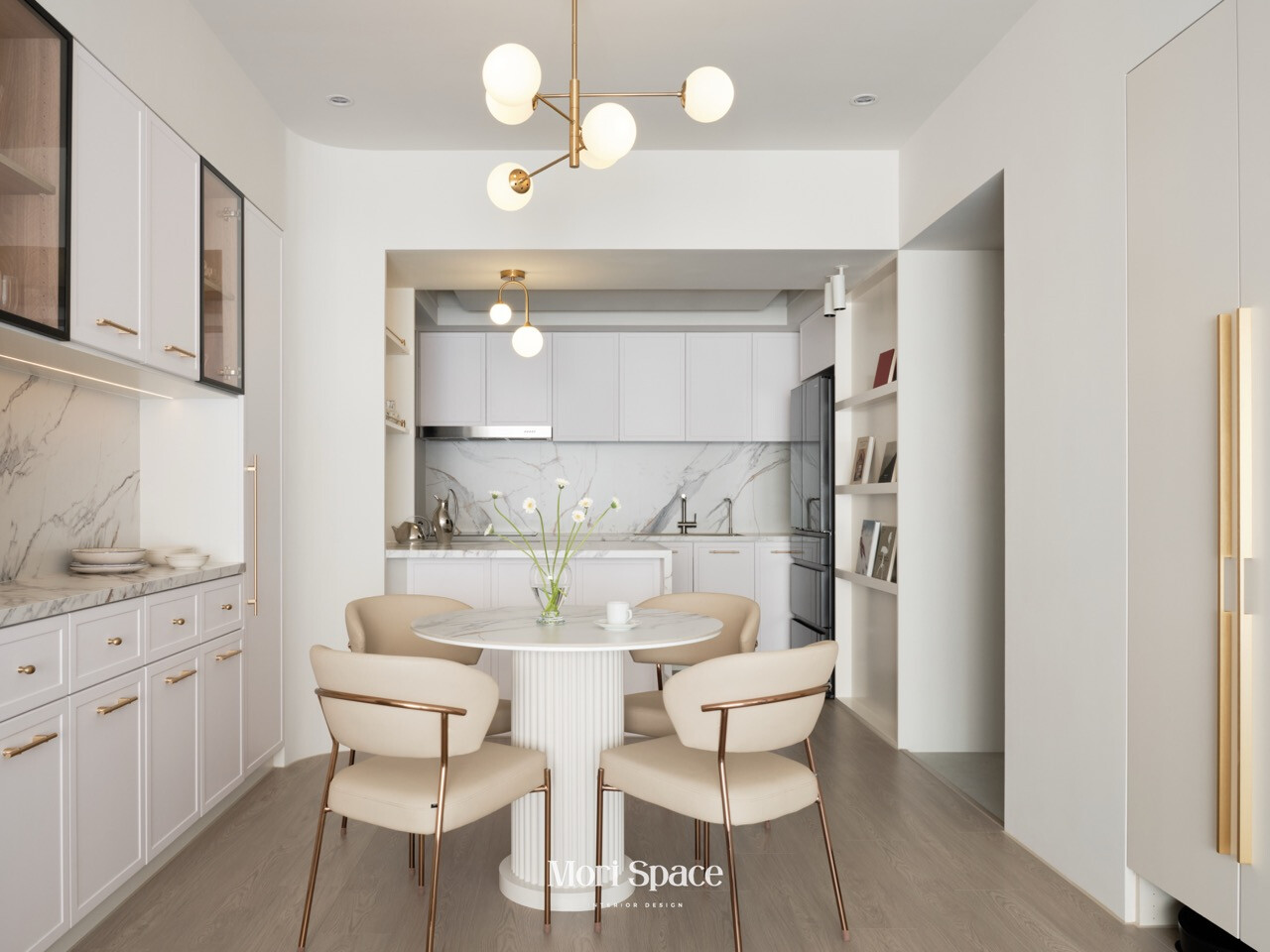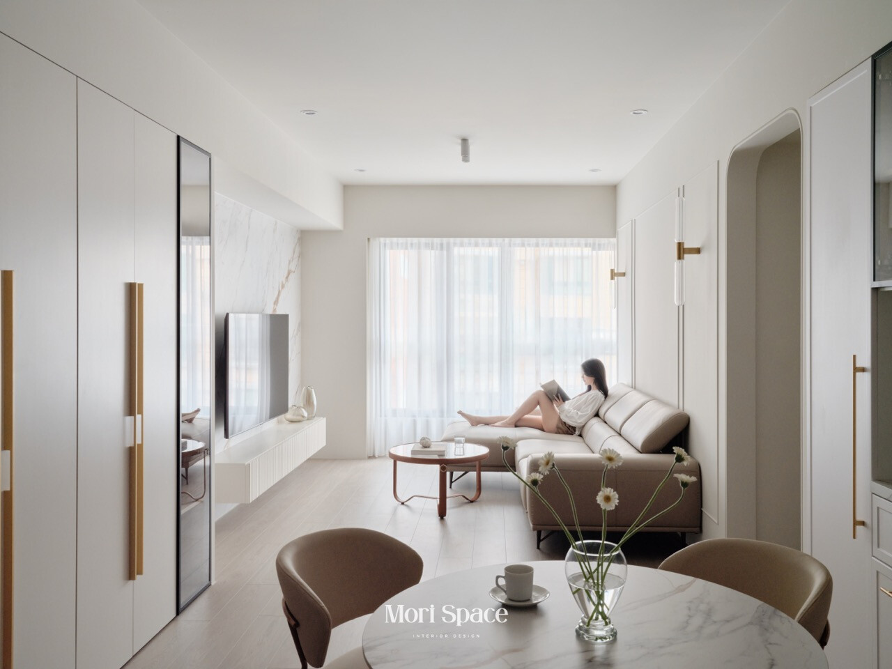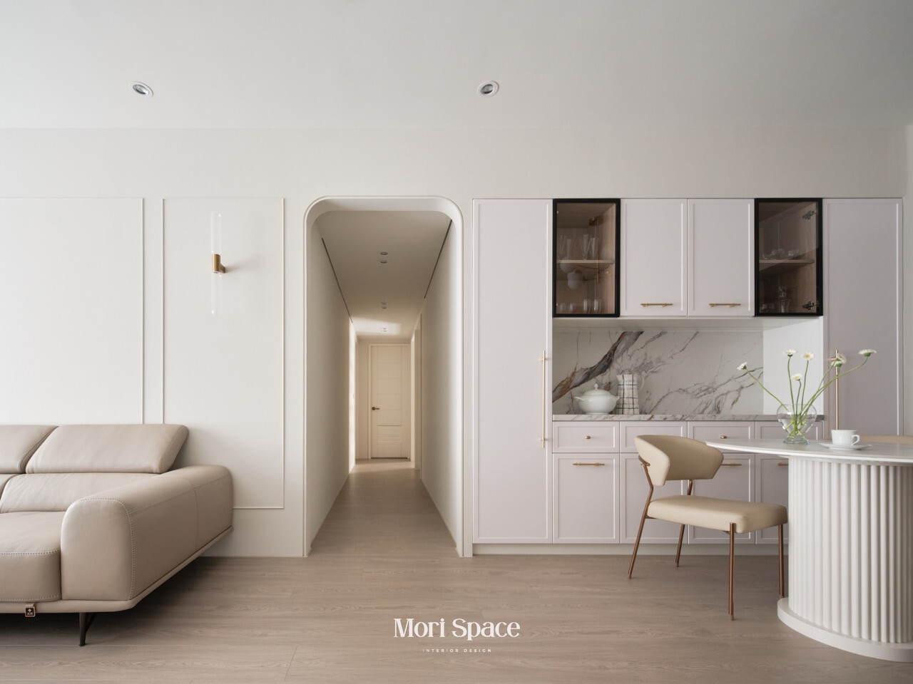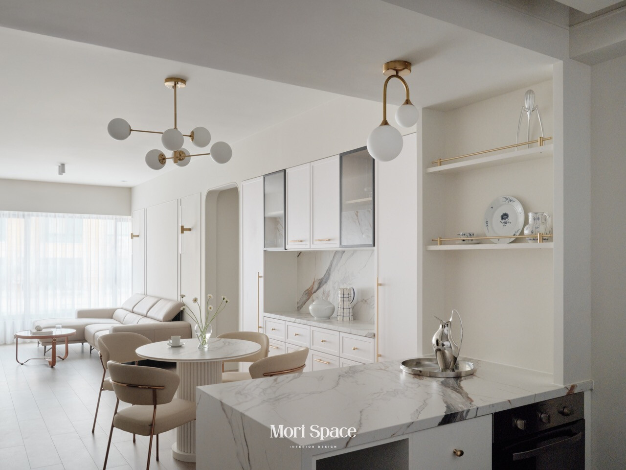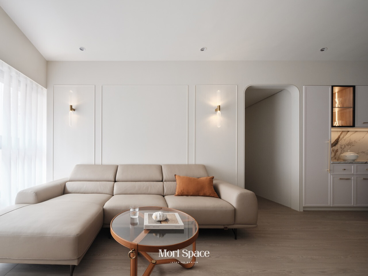 然而在這個家中,窗簾從不試圖成為主角,卻在每個細節中默默支撐著生活的節奏。它懂得退居幕後,讓光線、家具與材質成為空間的重心;也懂得在需要時適度刷存在感,為生活保留一段柔軟而安全的距離。客廳裡,純白與奶油色調交織出溫潤柔和的氛圍,窗簾的輕透質地使光線在牆面上慢慢鋪展,弧形門框所延伸的視線,讓空間顯得更加寬敞而平靜。廚房中,大理石紋理在自然光下呈現細膩層次,金屬細節則低調地映射光影,窗飾的配置使這個高度機能性的空間,依然保有從容與舒適。