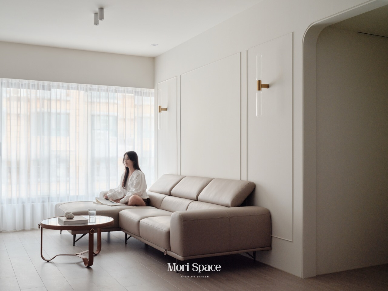 再者,整體空間以柔白、奶油色與淺木色為主要基調,這樣的色彩選擇,讓窗簾能自然地融入牆面與立面結構之中,而不顯突兀。森創在窗簾與牆面交界處的處理格外細膩,透過隱藏式軌道與乾淨的收邊方式,使窗簾在視覺上如同牆面延伸的一部分,維持整體的純淨感。在這樣的配置下,光線成為空間中最具層次的元素。當窗簾半掩,牆面呈現柔和的陰影變化;當窗簾完全拉開,空間則回到明亮而通透的狀態。即使沒有多餘裝飾,留白牆面依然保有豐富表情,讓簡約不流於單薄,而是耐看且長久。