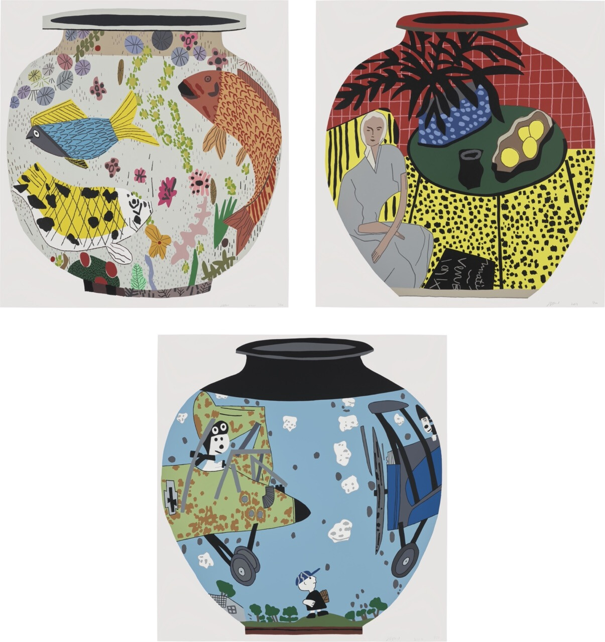Jonas Wood《魚盆》;《馬蒂斯盆 4》;《史努比盆》,2019至2020年作,估價:400,000-600,000港元