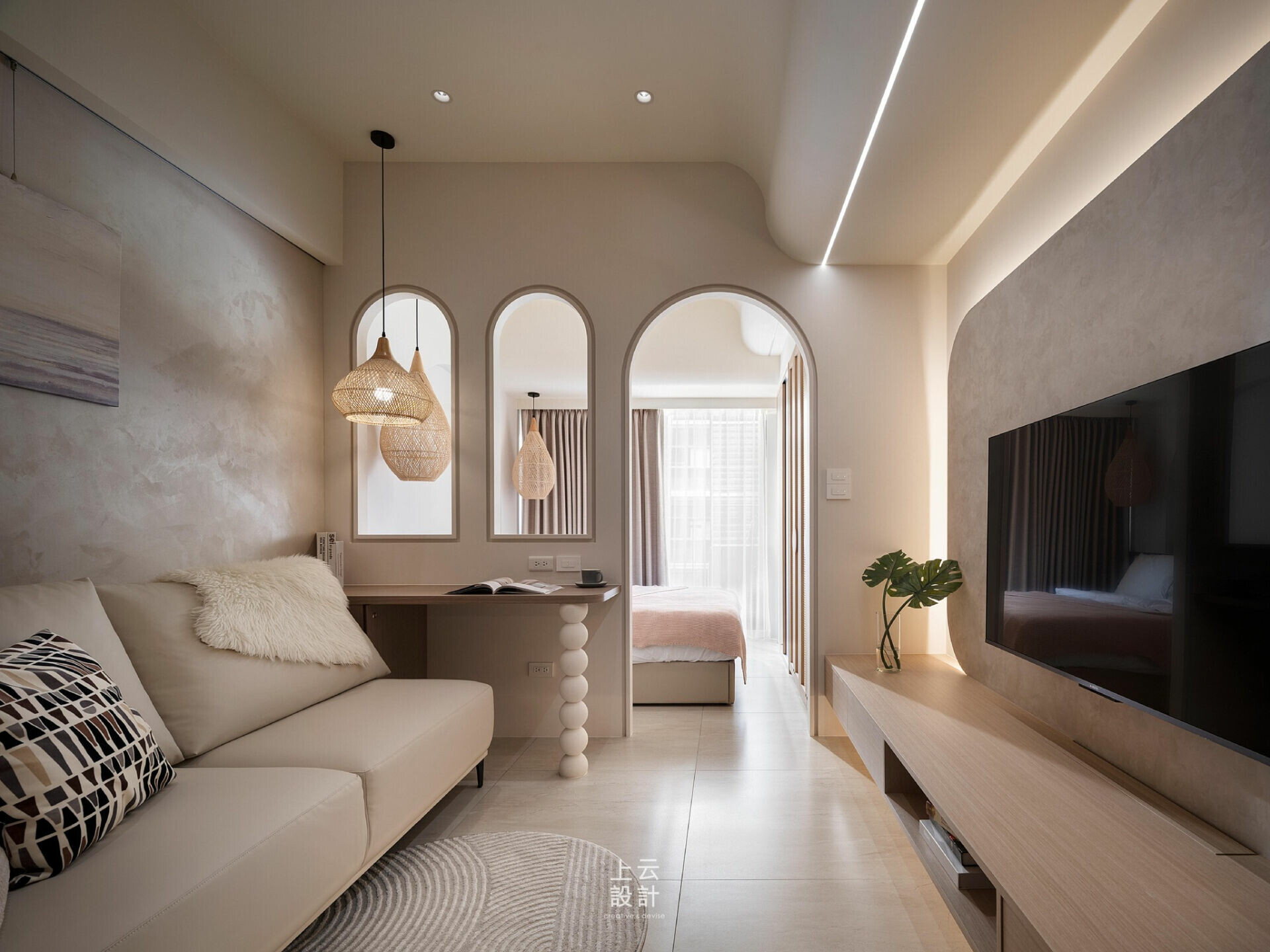 然而,在這個家中,拱形不是裝飾語彙,而是一種情緒設計。第一道拱門,位於玄關與客廳之間。它像是一個過濾器,將城市的急促留在門外。穿過它,彷彿卸下了一身看不見的鎧甲,提醒自己:「現在,已經回到自己的世界裡了。」第二道拱門,連結客廳與臥室,是公共與私密之間的過渡。它讓動與靜之間不再突兀,而是循序漸進地轉換。每一次經過,都是從喧囂回到安靜的一次小小儀式。第三道拱門,則通往陽台,是光線進來的方向,也是家的心跳。日光透過門洞傾灑而入,讓空氣、光與時間在此交會,提醒人們:生活其實不需要太多,只要有光、有空氣、有自己的節奏,就已足夠。