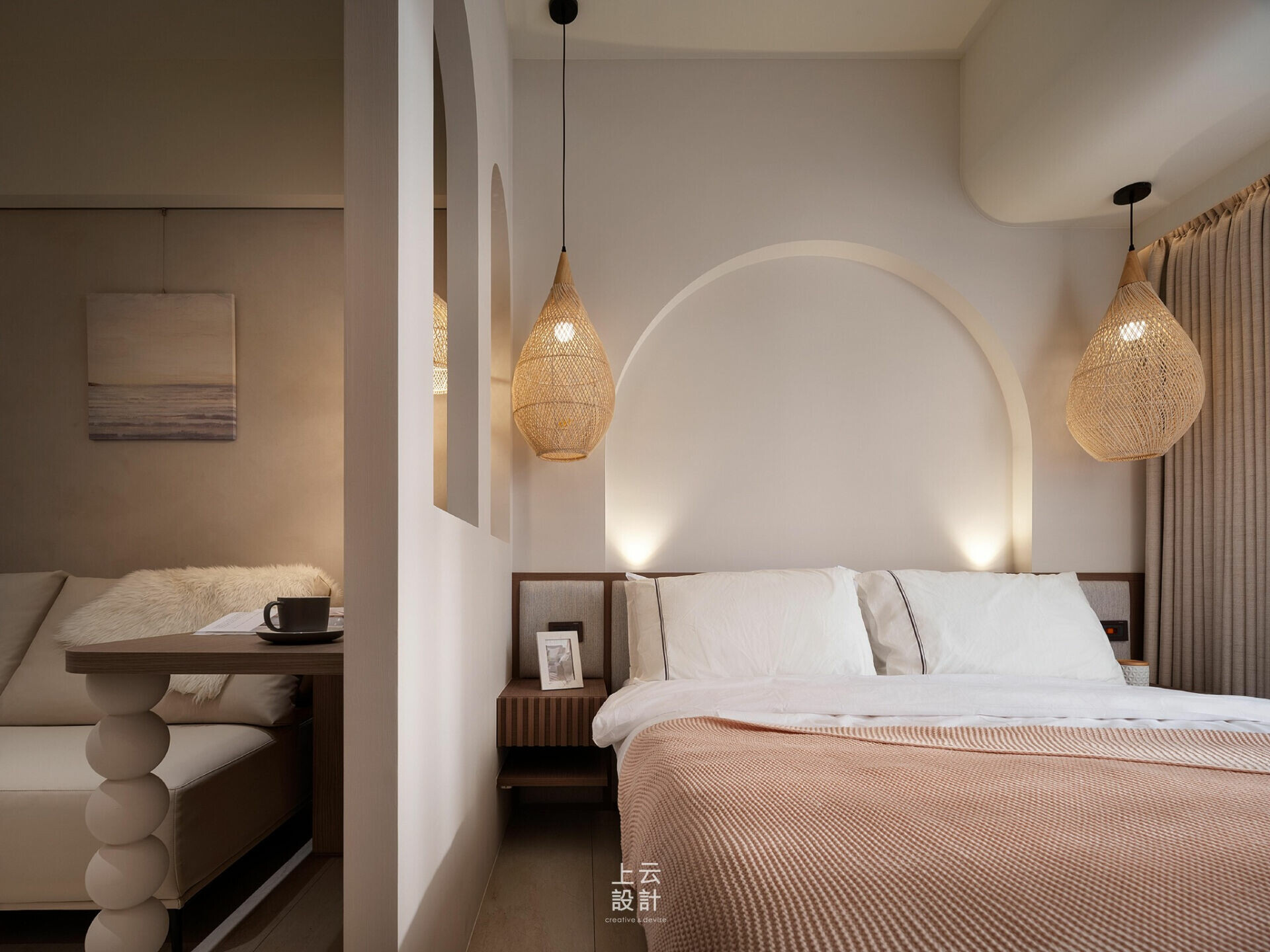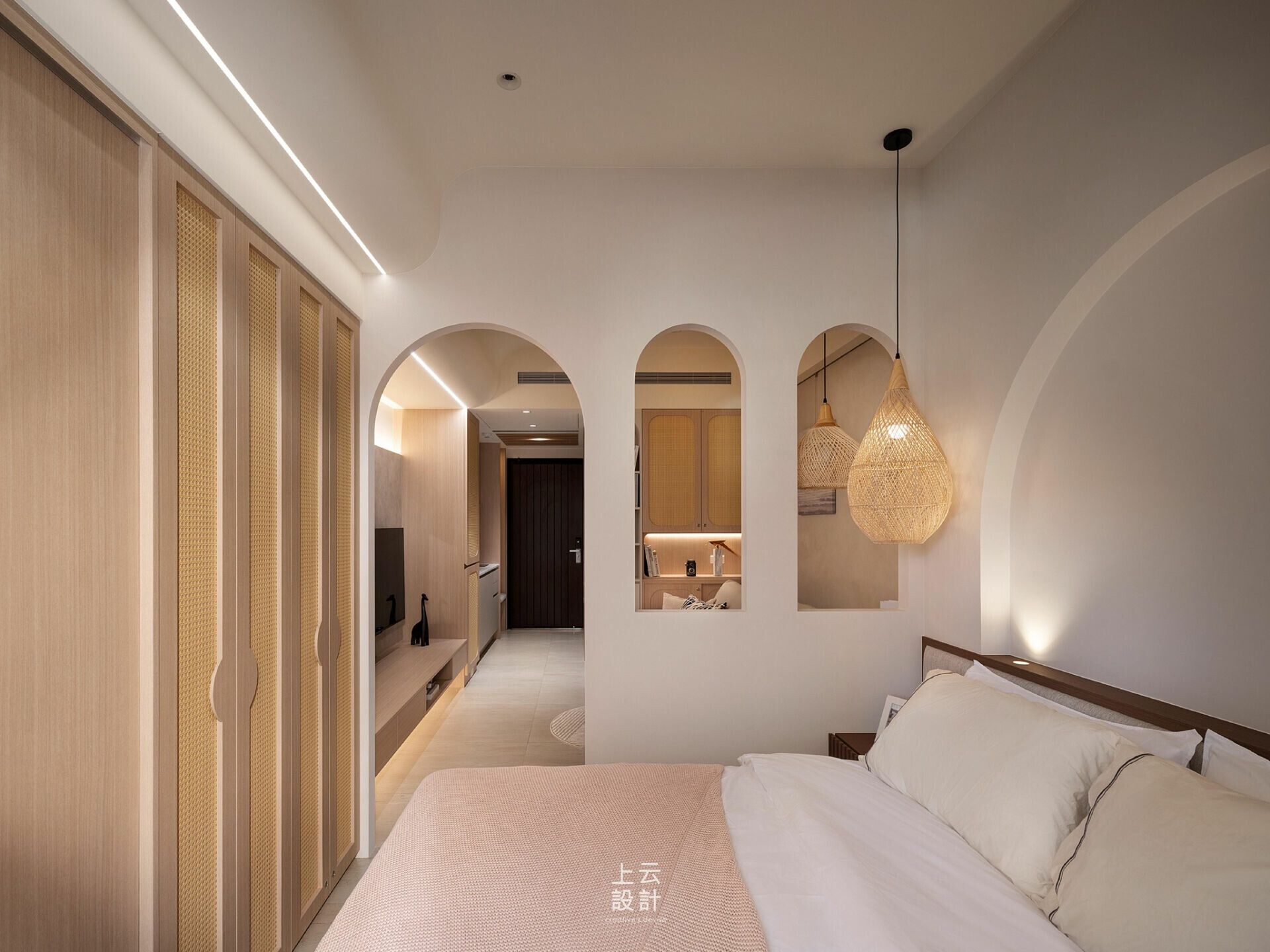 臥室,是整個空間情緒最安靜的一段。床頭弧形牆搭配垂墜燈光,光暈緩緩落下,如同熱帶島嶼夜晚的靜謐包覆。整合式衣櫃延續藤編門片語彙,不僅提升透氣性,也讓材質語言保持一致。從燈光到材質、從尺度到層次,設計不試圖創造戲劇性,而是讓人能安心休息、安心做夢。這裡不需要過多言語,本身就是一處生活的避風港。