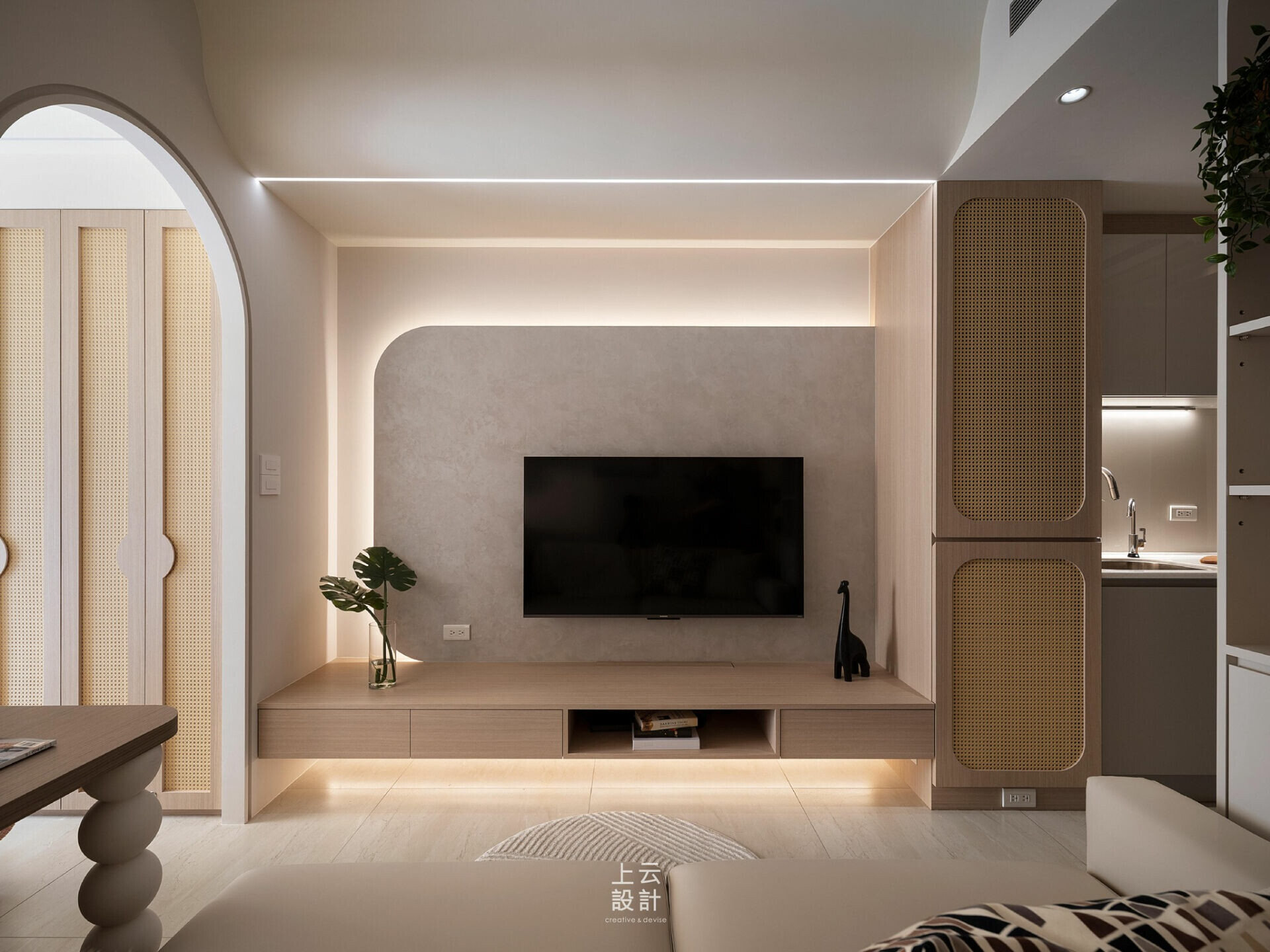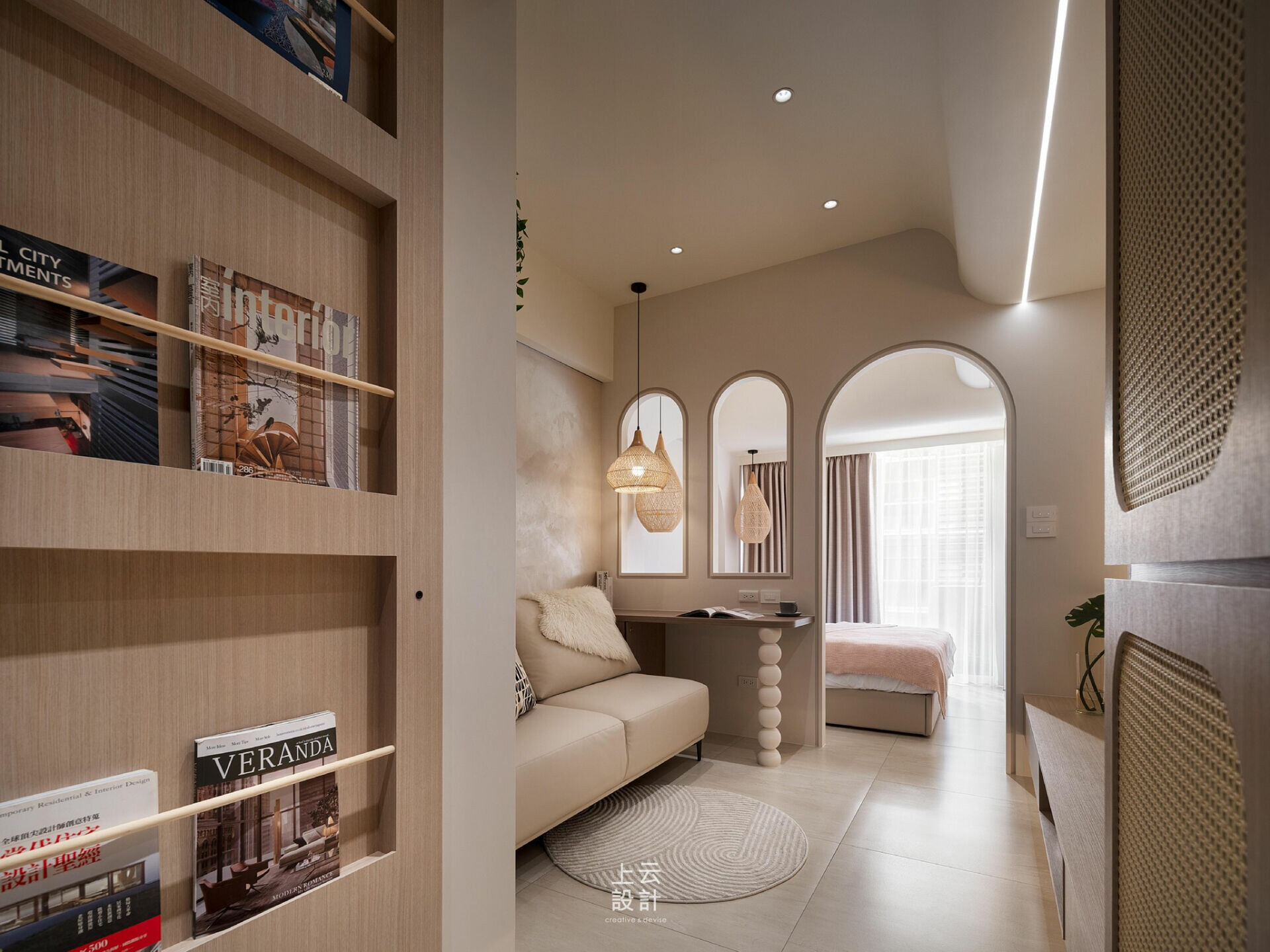 三道拱門的排列,如同一段日常旅程的縮影,從社會回到自己,從任務回到心,從匆忙回到緩慢。除此之外,真正成熟的設計,往往讓機能退居幕後。全室運用低彩度霧面材質與自然木皮,協調空間的色溫與觸感,藤編櫃體、編織燈飾與弧形語彙,形成一致而溫柔的視覺語言。櫃體設計講求比例俐落,讓機能被妥善收納,而非外顯展示。電視牆採懸浮設計,降低量體壓迫感,搭配間接光源,柔化立面,也優化夜間氛圍。衛浴空間則以乾濕分離、懸空洗手台與藏鏡櫃維持清爽線條,轉角特別規劃開放式書報展示牆,讓閱讀成為生活裡自然而然的一部分。這些看似低調的安排,實則精準回應了居住者的節奏,讓生活在無形中被安放。