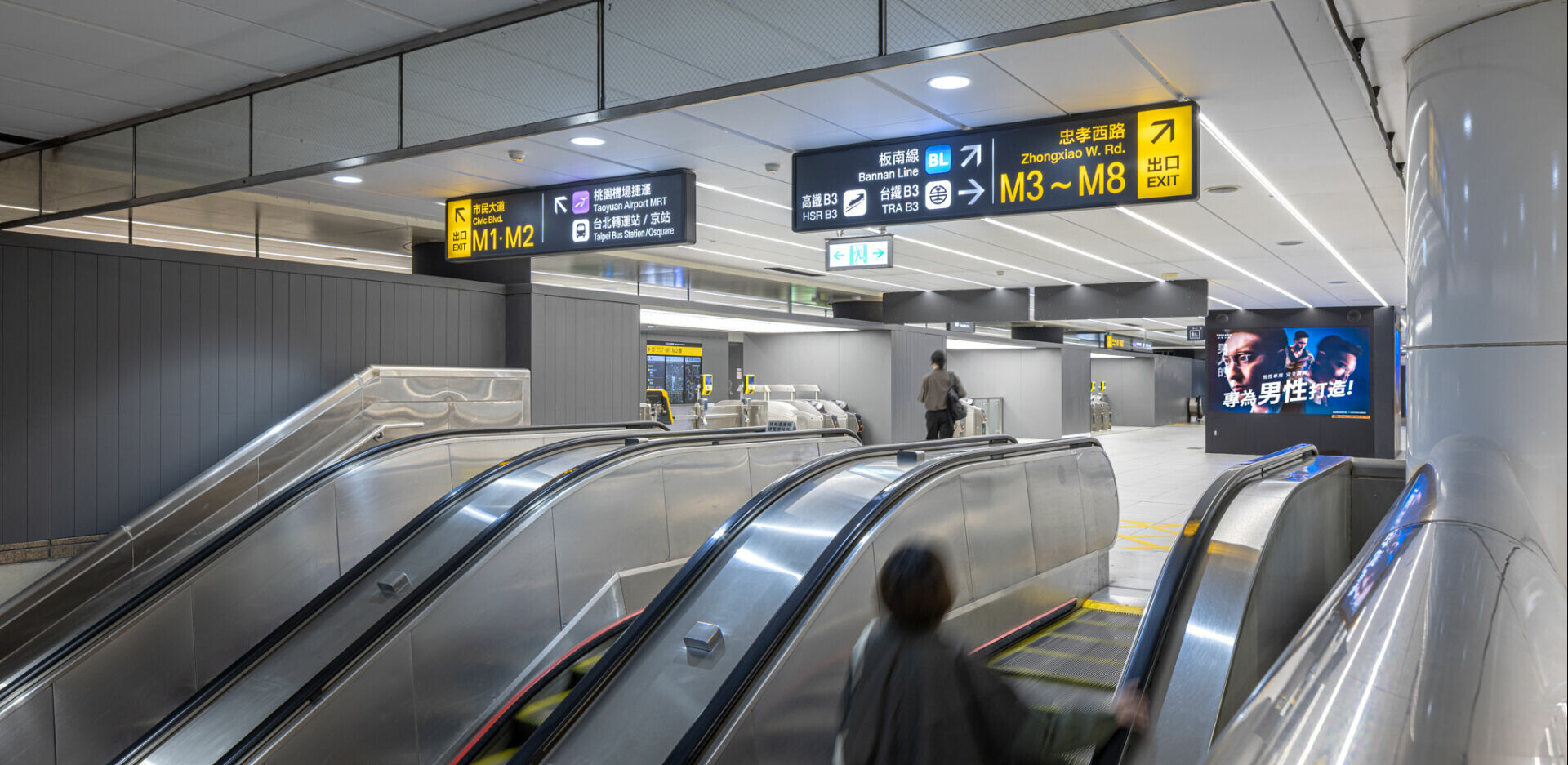 另一方面,在人流最密集的 B3 層,指標的重要性被重新定義。設計團隊依據實際流量,刻意引導非轉乘旅客分流,讓空間壓力得以被重新分配。箭頭的方向、位置與高度皆經過細緻調整,使尋路成為一件直覺而不費力的事。同步導入的,是台北捷運於 2023 年更新的指標準則,以及通用設計字體。這不僅是視覺風格的更新,更是一種價值選擇——讓不同年齡、不同能力的使用者,都能在同一空間中被平等對待。
