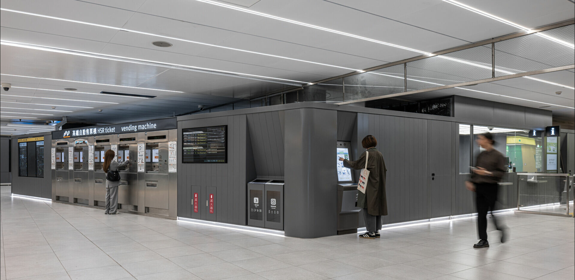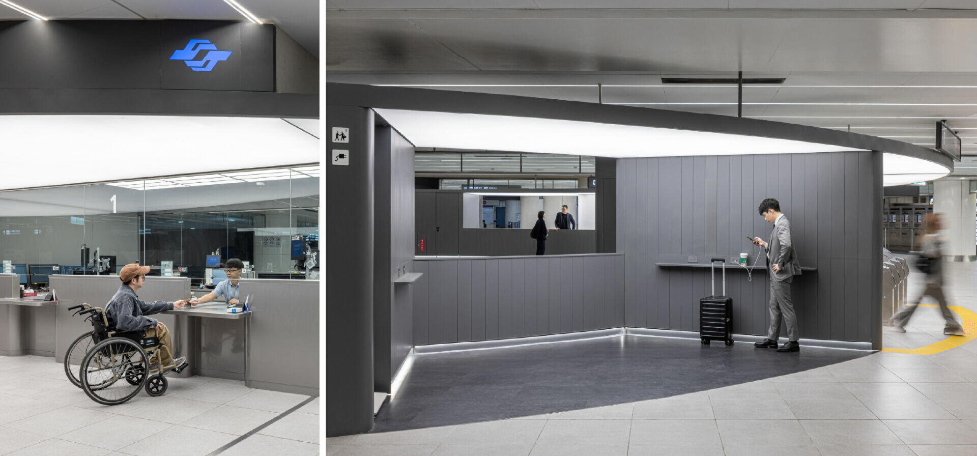 首先,延續「捷運中山站再設計」的核心精神,設計團隊再次以「服務盒」作為回應複雜需求的空間語彙。然而,台北車站的條件更為嚴苛,也更為真實。圓弧,於是成為關鍵。這些圓弧形的服務盒不只是造型選擇,而是一種對既有結構的溫和回應。它們包覆部分圓柱,柔化原本銳利而壓迫的邊界,讓空間不再以阻擋為主體,而是轉向引導。服務被整合進這些發光的盒體之中,詢問、儲藏、商業、會面、充電、垃圾收納與數位指標不再彼此競逐,而是在同一個清楚可辨的系統裡各就其位。在這裡,光不只是照明,而是一種宣告:有光的地方,就有服務。當功能被收納、界面被統一,空間開始恢復自我說明的能力。