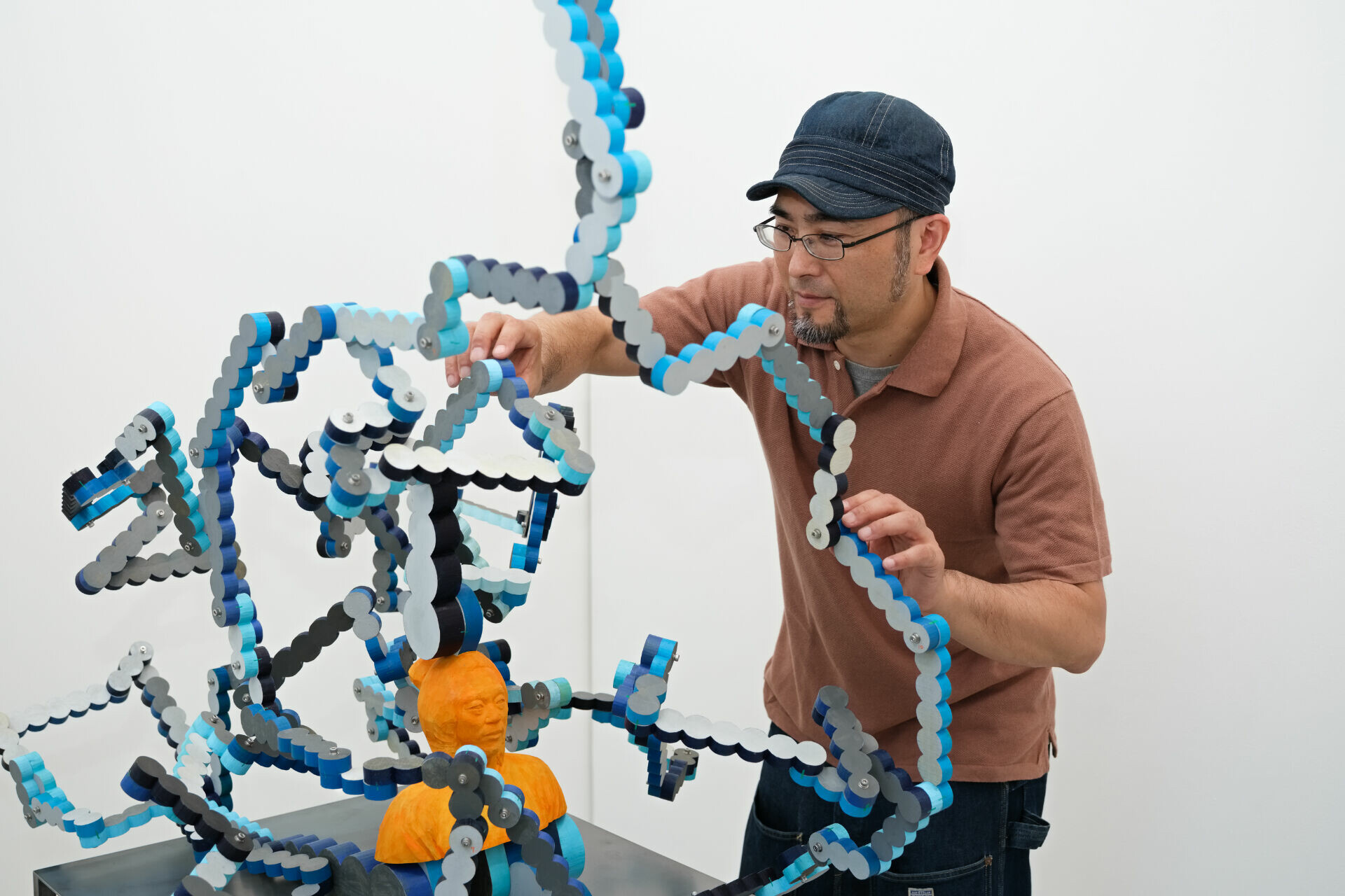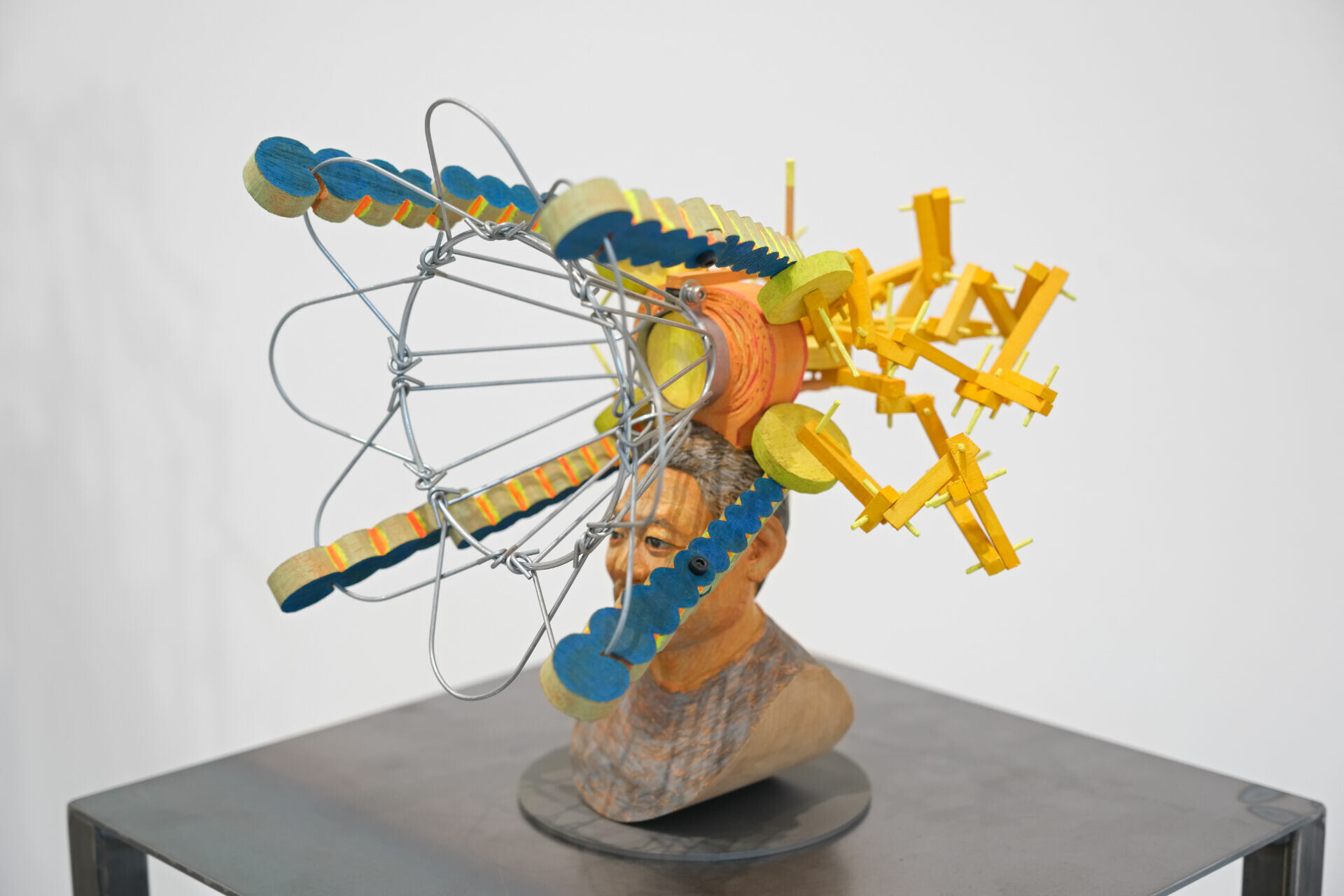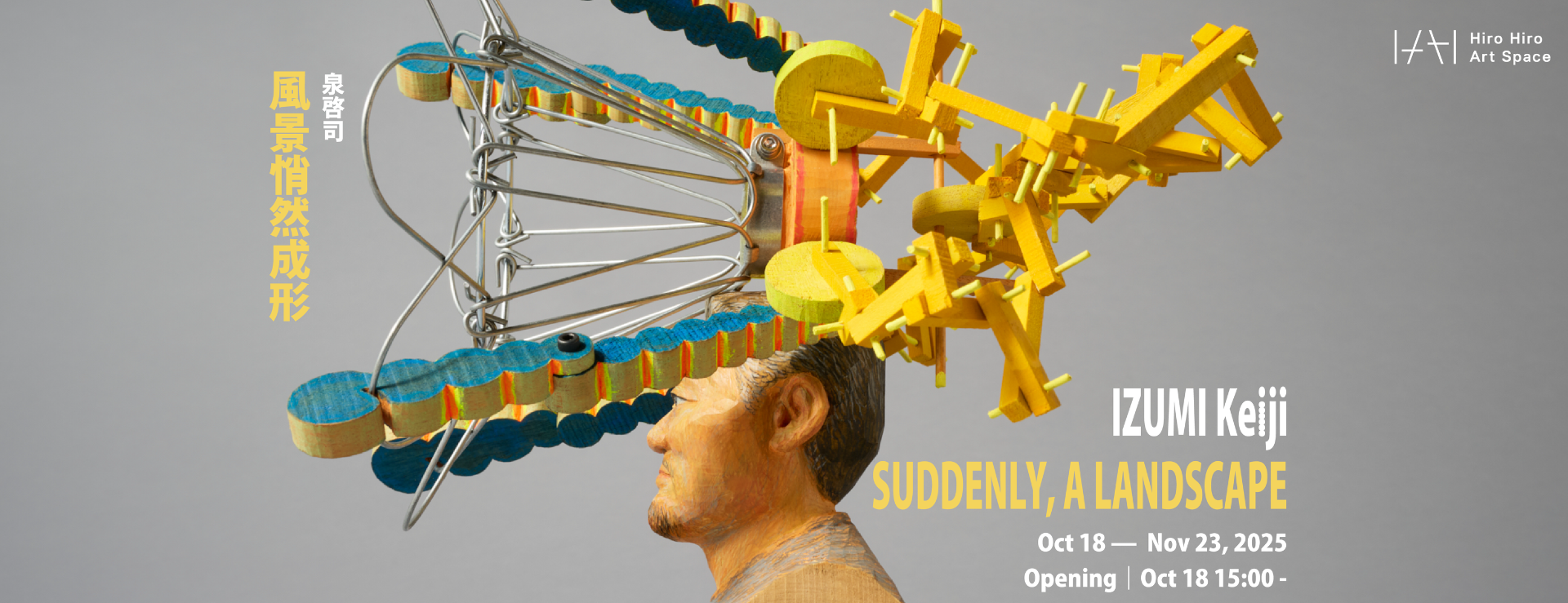 與宮島的光之宇宙相呼應,在中正區的 Hiro Hiro Art Space,泉啓司以木為語言,雕刻出「風景悄然成形」。他的作品總以人物為起點,卻不意在肖像,而是追問「人是什麼?」這個哲學命題。泉啓司從一塊塊木頭開始,分割、打磨、組裝,如同建築師般構築人與思想的結構。他將幾何零件串聯,使木雕能轉動、呼吸、改變形態。那是思想的流動、情感的擴散,也是一場對「自我與世界契合」的尋覓。