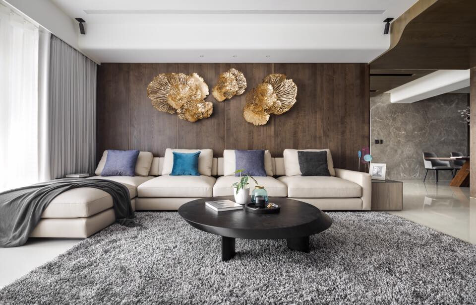 在公共空間中,築川設計善用光的流動與材質的節奏。客廳電視牆以米黃大理石鋪敘,搭配溫潤的木質色調,構築出靜謐與大器並存的氛圍。沙發背牆上懸掛的金色飾品,不只是裝飾,更是設計語彙中的韻腳,為整體空間注入優美的現代底蘊。面對原結構中的大樑問題,設計師巧妙以木質延伸包覆,緩解壓迫感,使天花板的線條過渡自然。整體空間因此在層層細節中顯得流暢而平衡 —— 從客廳延伸至餐廚區,設計不強調區隔,而是以光線與材質作為界定,讓家的情感自然蔓延。