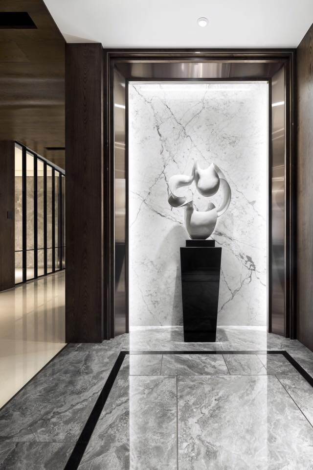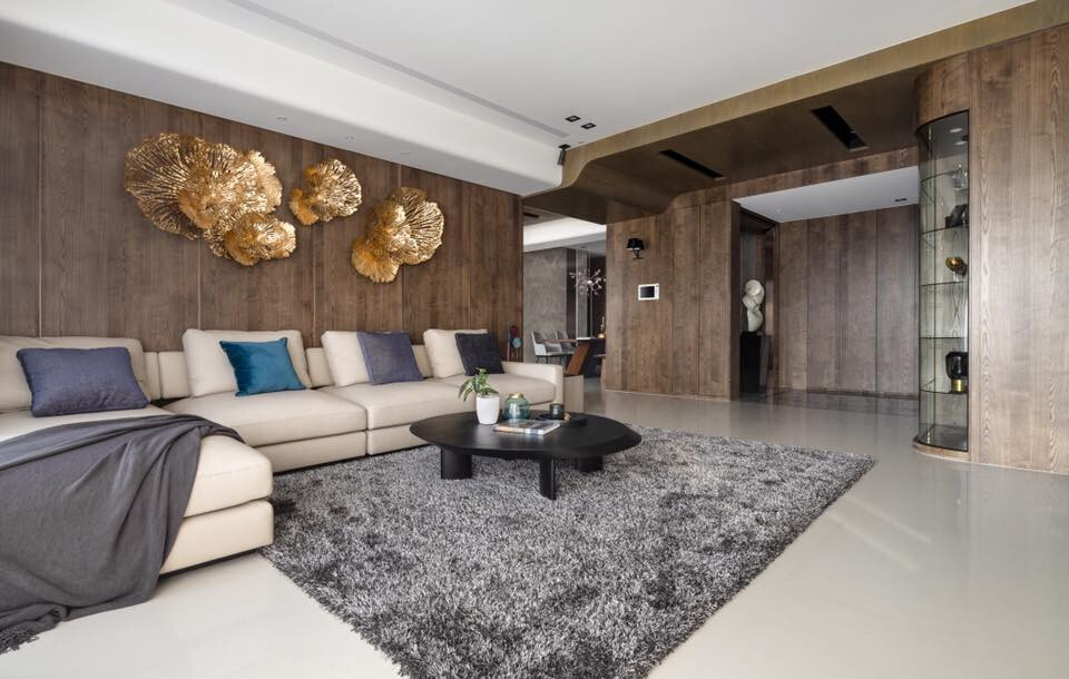進門之際,空間的氣韻便悄然流動。玄關牆面以小雕刻白大理石搭配鍍鈦板,質地之間的光影互映,映出低調卻不失華麗的氣場。設計師以端景藝品作畫龍點睛之筆,使整體進門視覺展現大器的尺度與節奏。展示櫃以木皮與弧面玻璃構成,木紋的肌理與玻璃的通透互相映照,柔化了材質的剛性,也讓空間在細節中展露溫度。這樣的轉折,彷彿是一場序曲 —— 石的堅定、木的溫潤、金屬的光澤,交織出家的第一道呼吸。