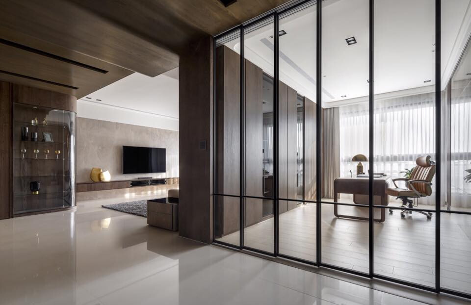 另一方面,書房,是屋主最私密的精神場域。設計師以安格拉大理石結合鍍鈦飾條,讓材質的冷暖對比產生一種沉靜的張力。通透的玻璃拉門既劃出界線,又讓光線自由穿梭,形成開放與私密之間的巧妙平衡。這裡不僅是工作的場所,更像是一個「心的書房」。餐廚區以木格柵規劃,木質的暖色調映襯著柔和燈光,締造沉穩且舒適的用餐氛圍。這裡是家庭情感的核心,烹飪、交談、笑聲在空間中流轉,成為兩代共居的溫柔連結。臥室作為私領域的最終章,則以寧靜沉穩的色調鋪陳。設計師以柔和線條與簡約造型,勾勒出屬於居住者的氣息——那是屬於女性的柔軟與自信,既能容納夢,也能承接生活的重量。