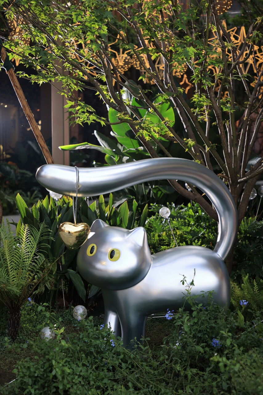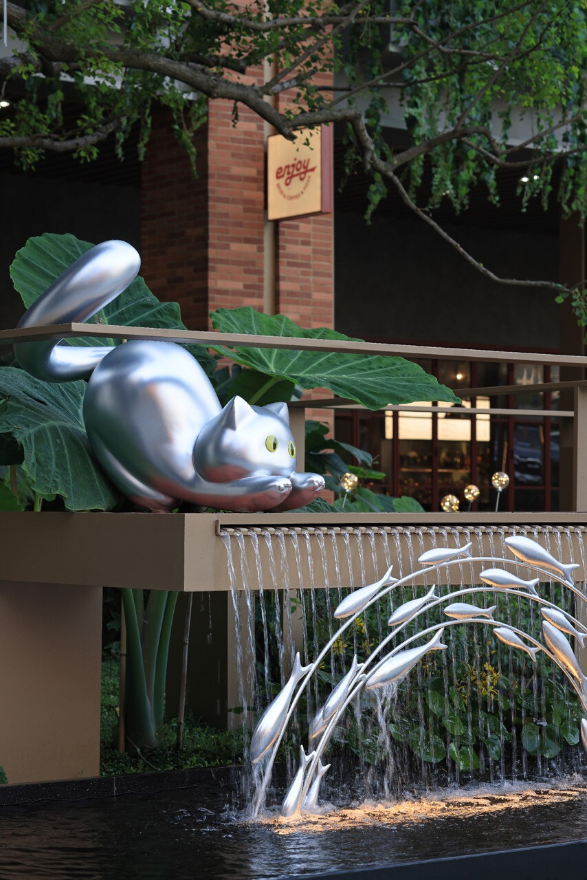 再者,重慶之丘的靈魂,藏在一隻隻輕盈的貓影之中。宇合光年為此創作了獨特的形象塑造 —— 以貓為主角的情景雕塑,描繪牠們在街區中的一日生活。貓咪或蜷臥午後的陽光下,或與魚共戲於溪畔,或在林間嬉鬧,構成一幅幅生活剪影。這些雕塑不只是裝飾,而是情感的媒介。牠們分散於街角、長椅與水景旁,讓人於行走間產生意外的愉悅。以不鏽鋼與樹脂打造的質感,映照城市的光影,也折射出人們對生活的想像。宇合光年用這樣的手法,讓空間不再是冷峻的結構,而成為可以被擁抱的場所。透過「貓」這一柔軟的形象,連結起人與城市的溫度——如同重慶的山與霧,真實而富於情感。
