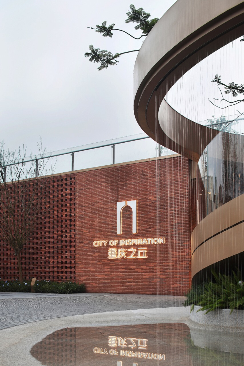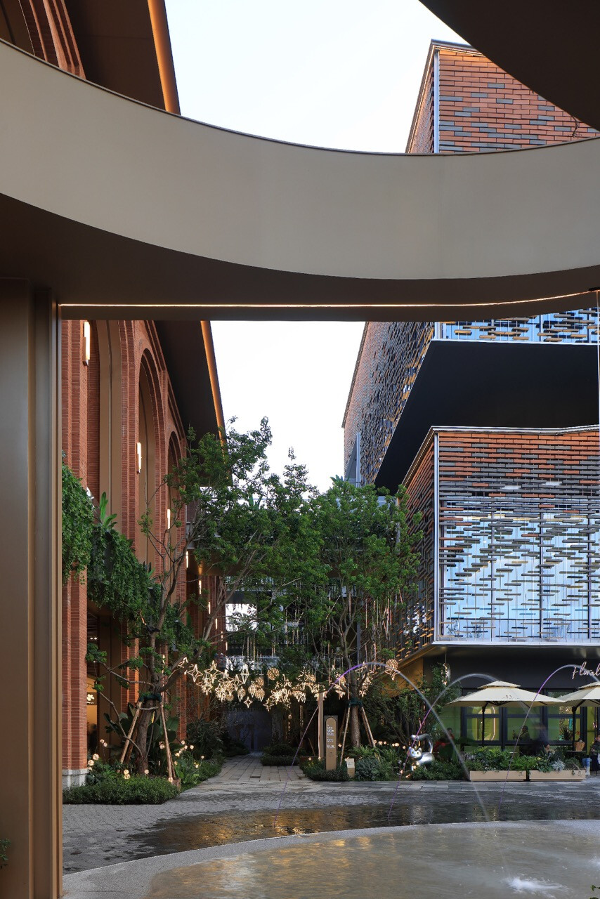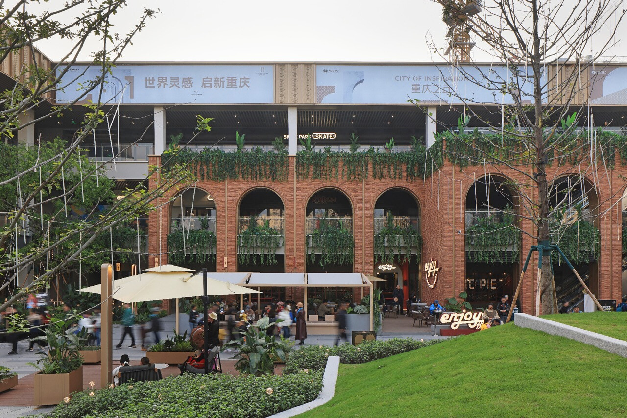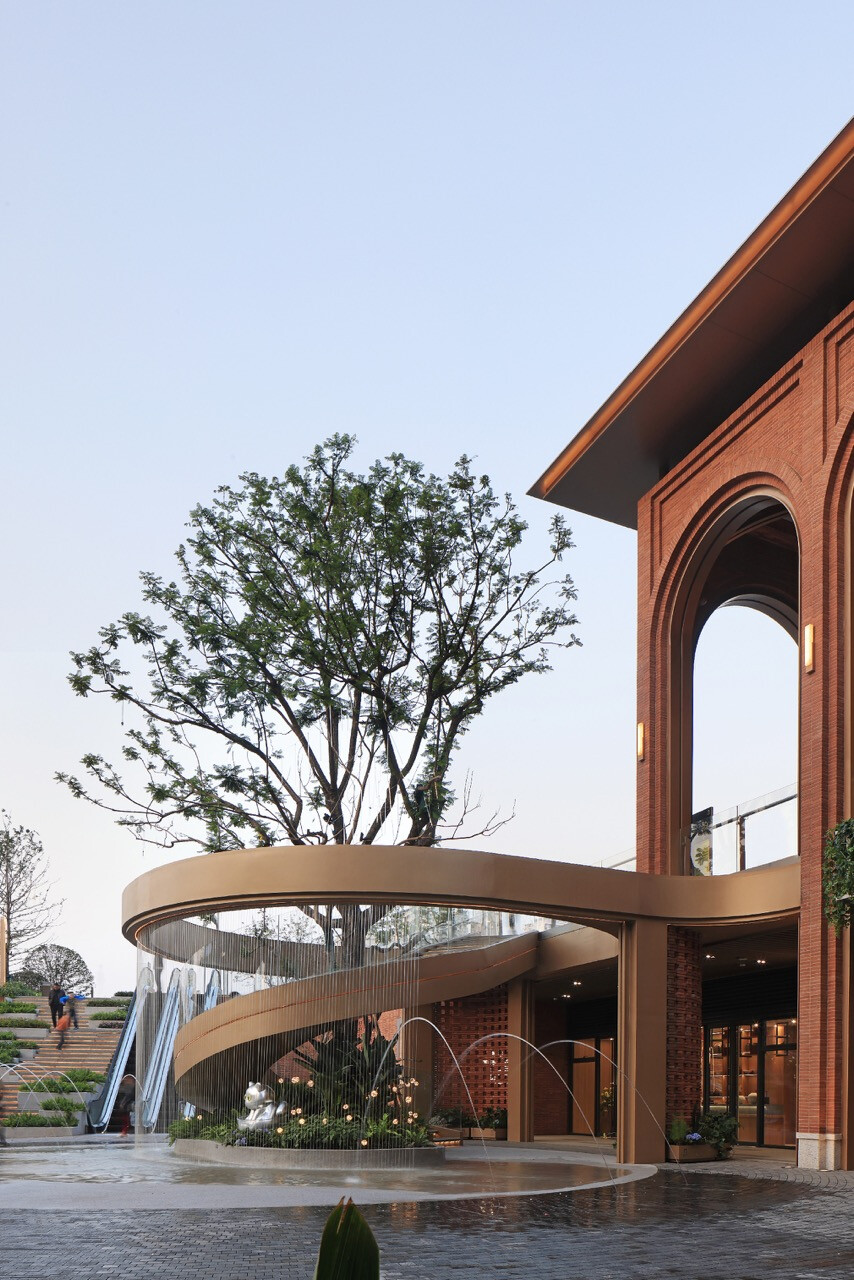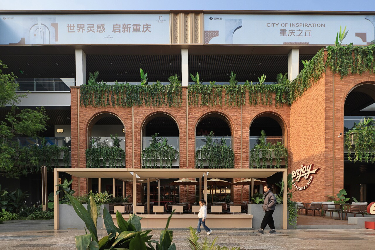 山水縱橫的重慶,總是以坡地延伸出生活的層次感。當「重慶之丘」於悅來海派美學生活街區誕生,它不只是建築的一隅,更是一場以記憶為線索的文化復興。宇合光年深入這座城市的歷史脈絡,以“寓舊於新”的設計語彙,把海派的精緻與重慶的厚度交織成新的城市語言。紅磚的肌理,映照著舊時碼頭的煙火;玻璃與金屬的光澤,則折射出現代城市的節奏。設計師不追求單一的形式,而是讓材質之間的對話成為一種時代的共鳴。沿街外牆的拱形與金屬網交錯,若隱若現,如霧中山影,既延續建築原貌,又注入當代精神。