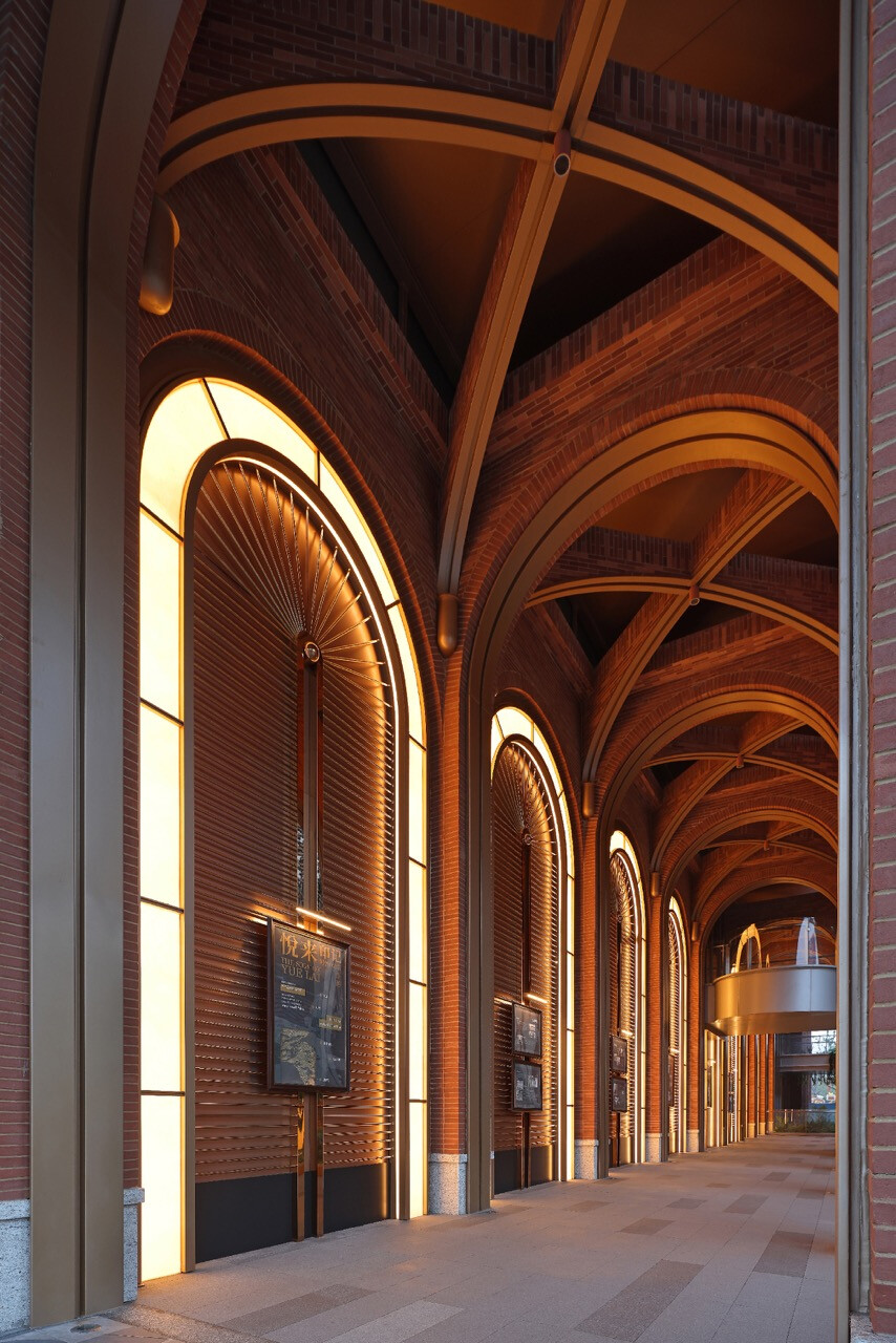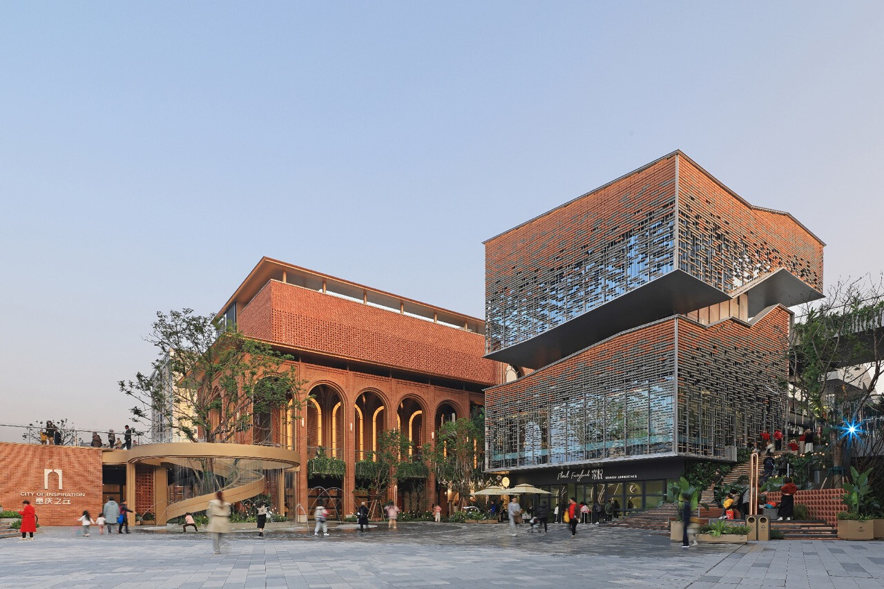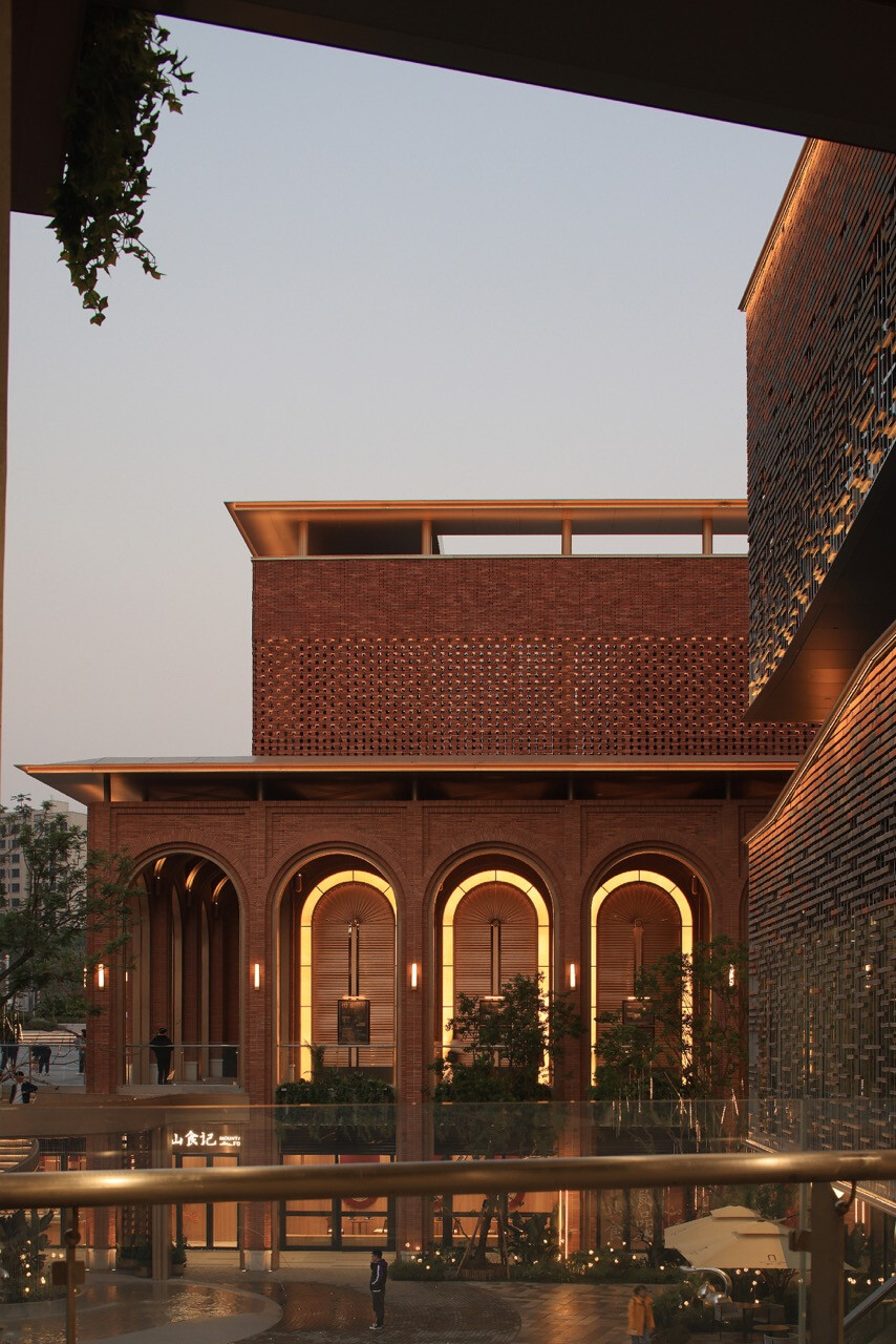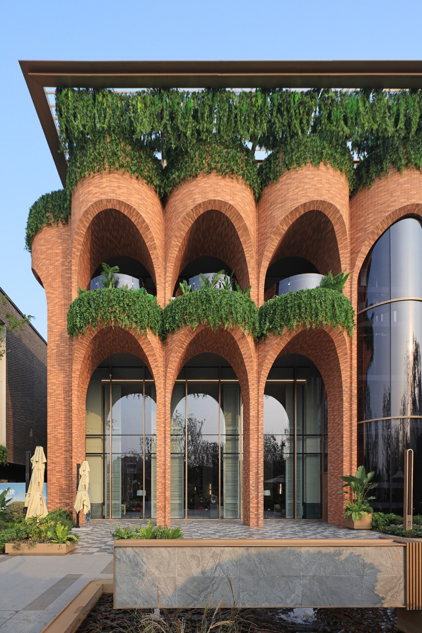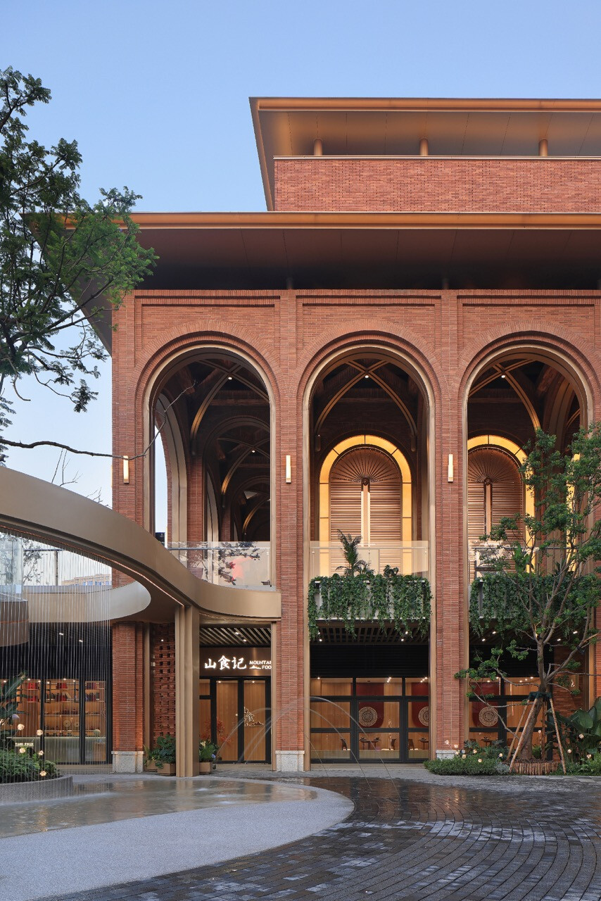 山水縱橫的重慶,總是以坡地延伸出生活的層次感。當「重慶之丘」於悅來海派美學生活街區誕生,它不只是建築的一隅,更是一場以記憶為線索的文化復興。宇合光年深入這座城市的歷史脈絡,以“寓舊於新”的設計語彙,把海派的精緻與重慶的厚度交織成新的城市語言。紅磚的肌理,映照著舊時碼頭的煙火;玻璃與金屬的光澤,則折射出現代城市的節奏。設計師不追求單一的形式,而是讓材質之間的對話成為一種時代的共鳴。沿街外牆的拱形與金屬網交錯,若隱若現,如霧中山影,既延續建築原貌,又注入當代精神。