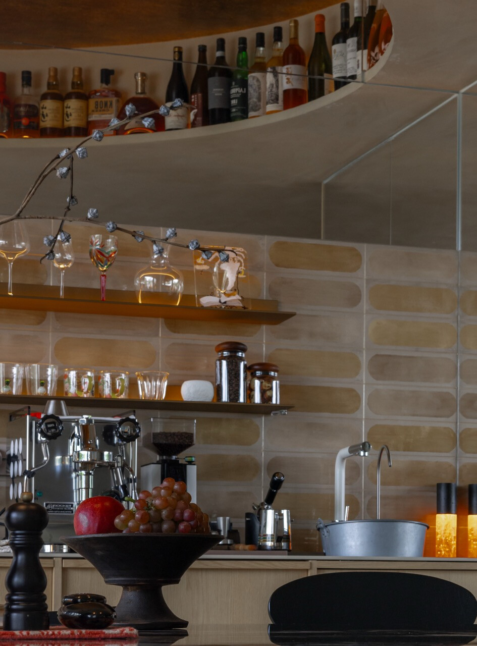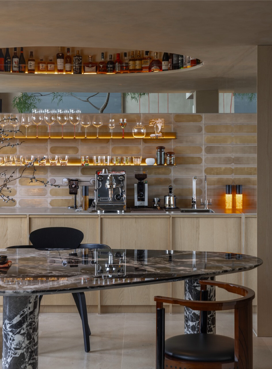 客廳的設計同樣充滿生活的彈性。空間核心並不是傳統的沙發與電視,而是一座寬大的廚房中島。料理、談話、孩子寫作業、朋友聚會,都在這裡自然發生。場景沒有被固定,家庭成員每天都能重新書寫屬於自己的生活劇本。材料的觸感也成為遊戲的一部分。清晨赤腳走過石材地面,感受到微涼與光影的流動;午後陽光在牆面上緩慢移動,空間的氣氛也隨時間改變。這些細微感受,使住宅不再靜止,而是一個隨日常節奏呼吸的環境。