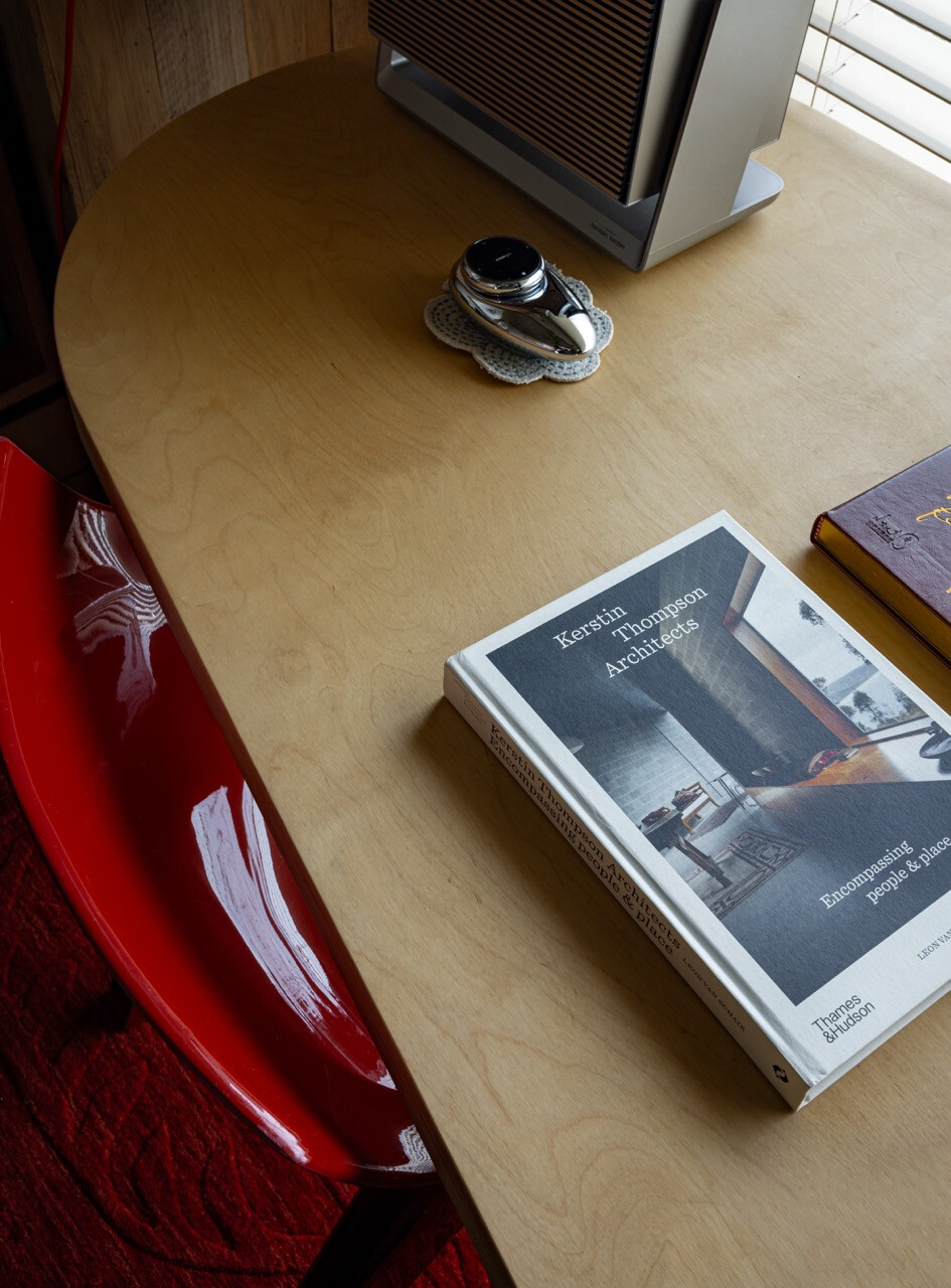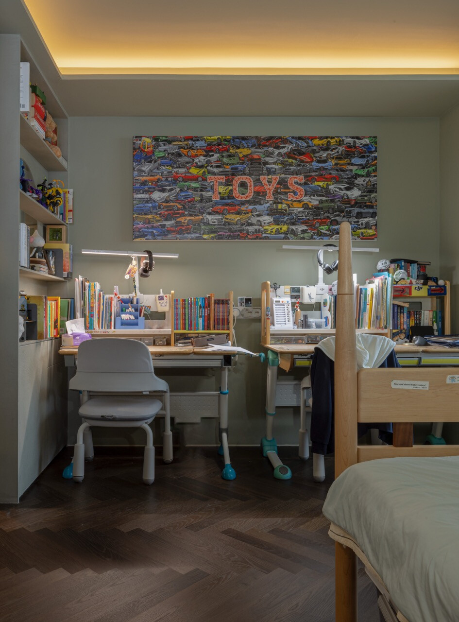 站在窗前,城市的繁忙與室內的靜謐形成對照,人也更容易感受到內心的安定。住宅同時保留大量空白,以容納家人的記憶。廚房收納著太太珍藏的鍋具,牆面留給孩子們的畫作,書房書架擺放著設計師的收藏與閱讀。這些物件像一枚枚生活印章,使空間逐漸累積時間的厚度。因此,這個家很難被複製。它的價值來自於生活本身。