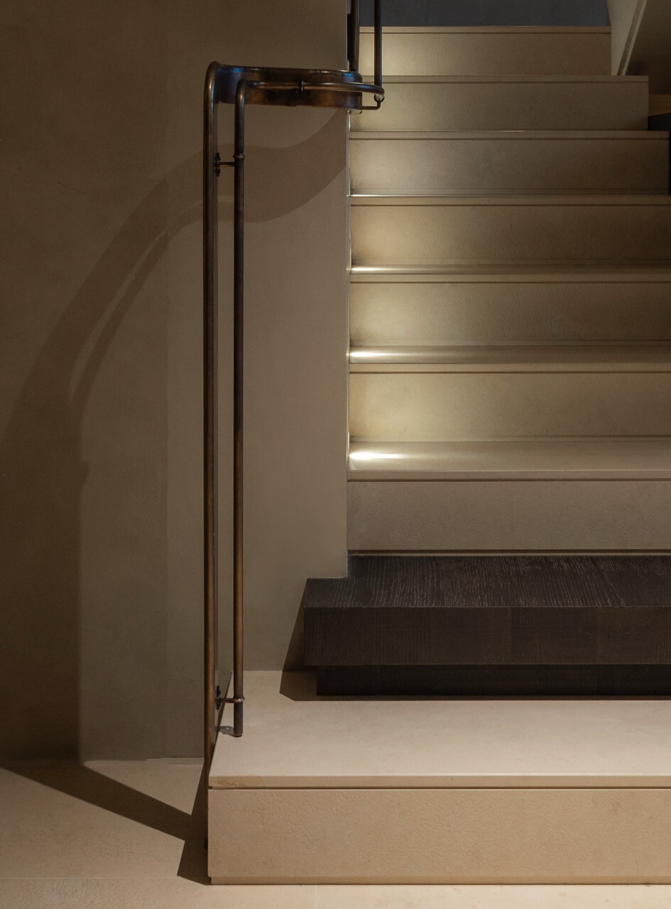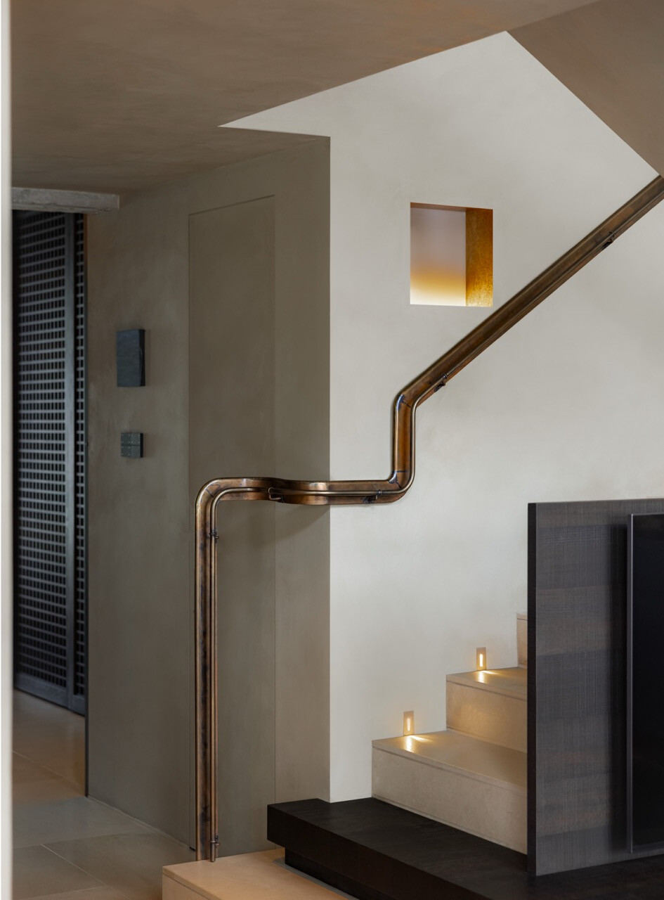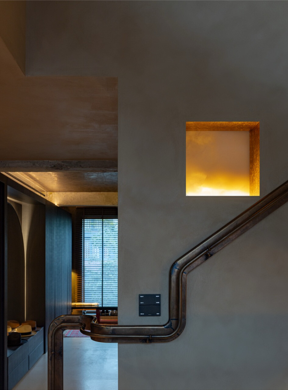 再者,若說「雅」構築了住宅的氣質,那麼「趣」則賦予空間生命。這棟住宅以垂直空間為主要結構。樓梯被視為家的脊椎與動脈,連接三層不同的生活場景。設計團隊調整踏階的比例與平台停留感,使人在上下樓時自然放慢腳步。古銅色的比例與光影交錯,讓這條動線帶有某種儀式感。從玄關進入,視線逐漸延伸至客廳與餐廚空間;再往上,二樓是家人共享的生活區域;三樓則留給更加私密的沉思與休息。在這段垂直旅程中,人的身體在移動,心境也隨之轉換。那是一種從城市喧鬧回到內心寧靜的過程。