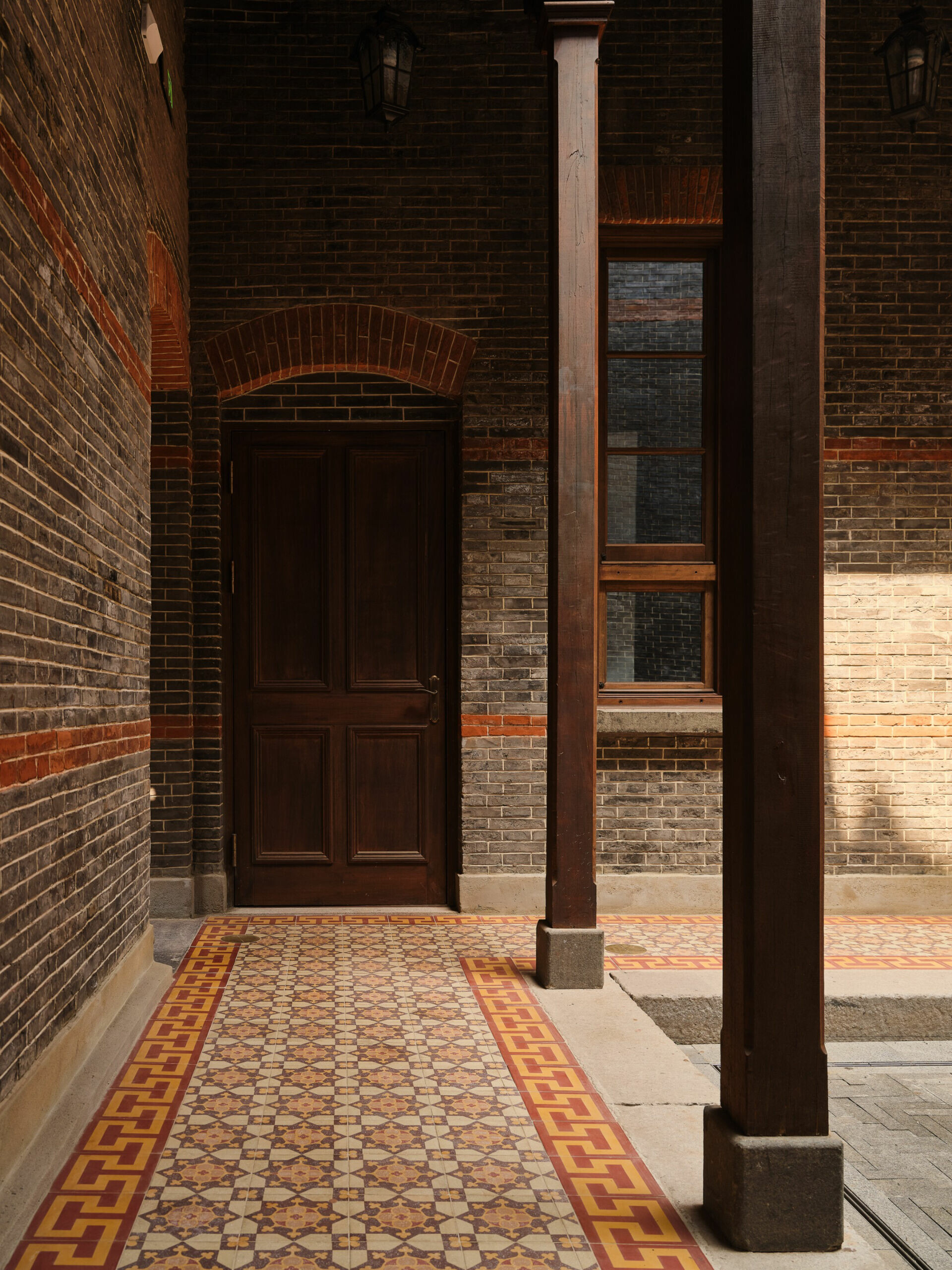 設計團隊以「保護為前提,活化為核心」為出發點,以科學性的建築修繕方式強化結構,讓過去的細節在今日的光線裡重新站立。原有的木質樓梯經過精細修補後,帶著溫潤的光澤重新成為垂直動線的主角;鑲木牆板與雕花線腳在清理與加固後呈現出歲月的深刻紋理;青磚立面則以非破壞性技術修復,使建築外觀得以保留最初的海派韻味。然而,修復並不是停留於回到過去,活化才是讓建築真正重生的語言。設計團隊重新梳理空間邏輯,在尊重原有格局的前提下,使建築能承載當代需求:接待、展示、交流、策展等複合機能在其中自然地生長。