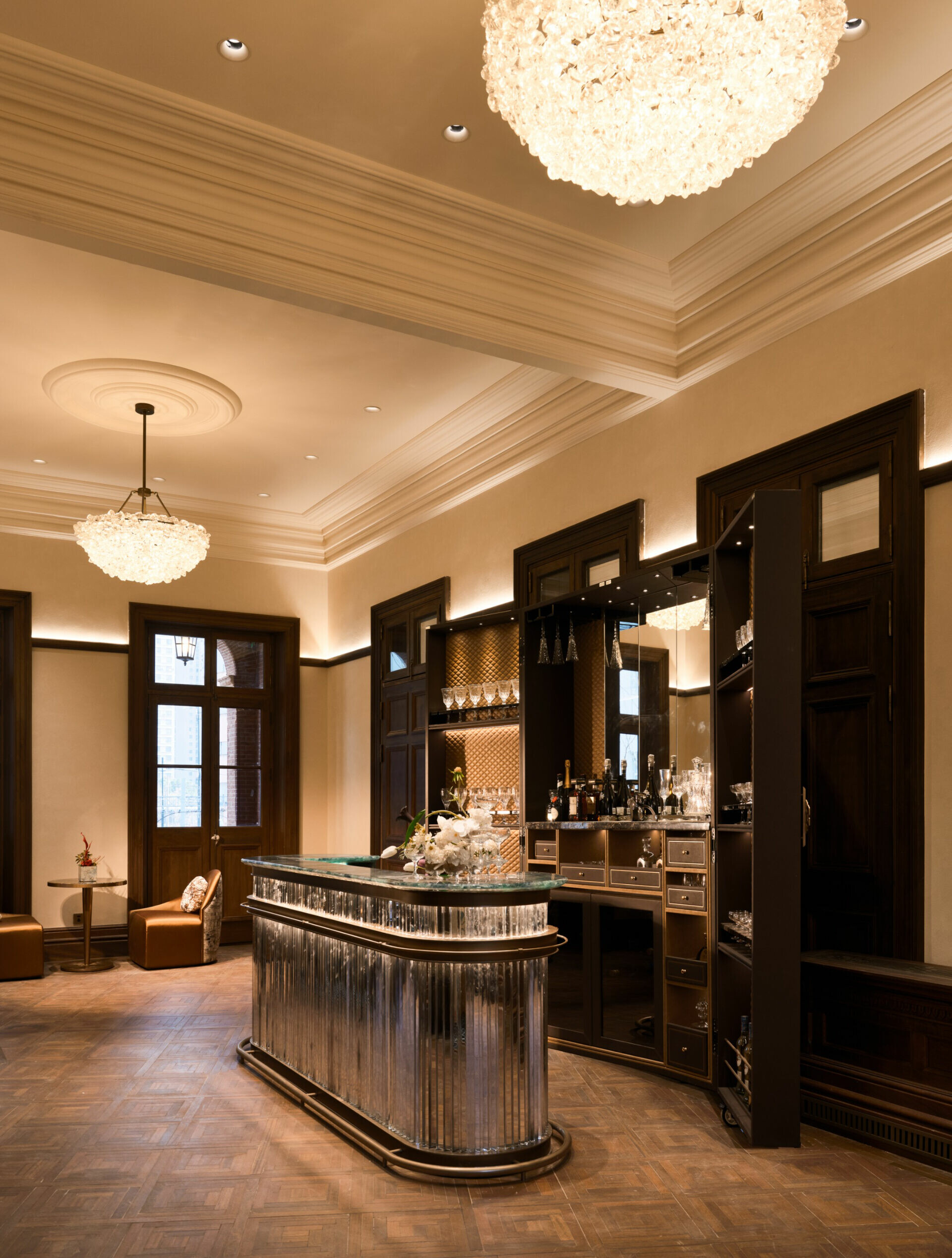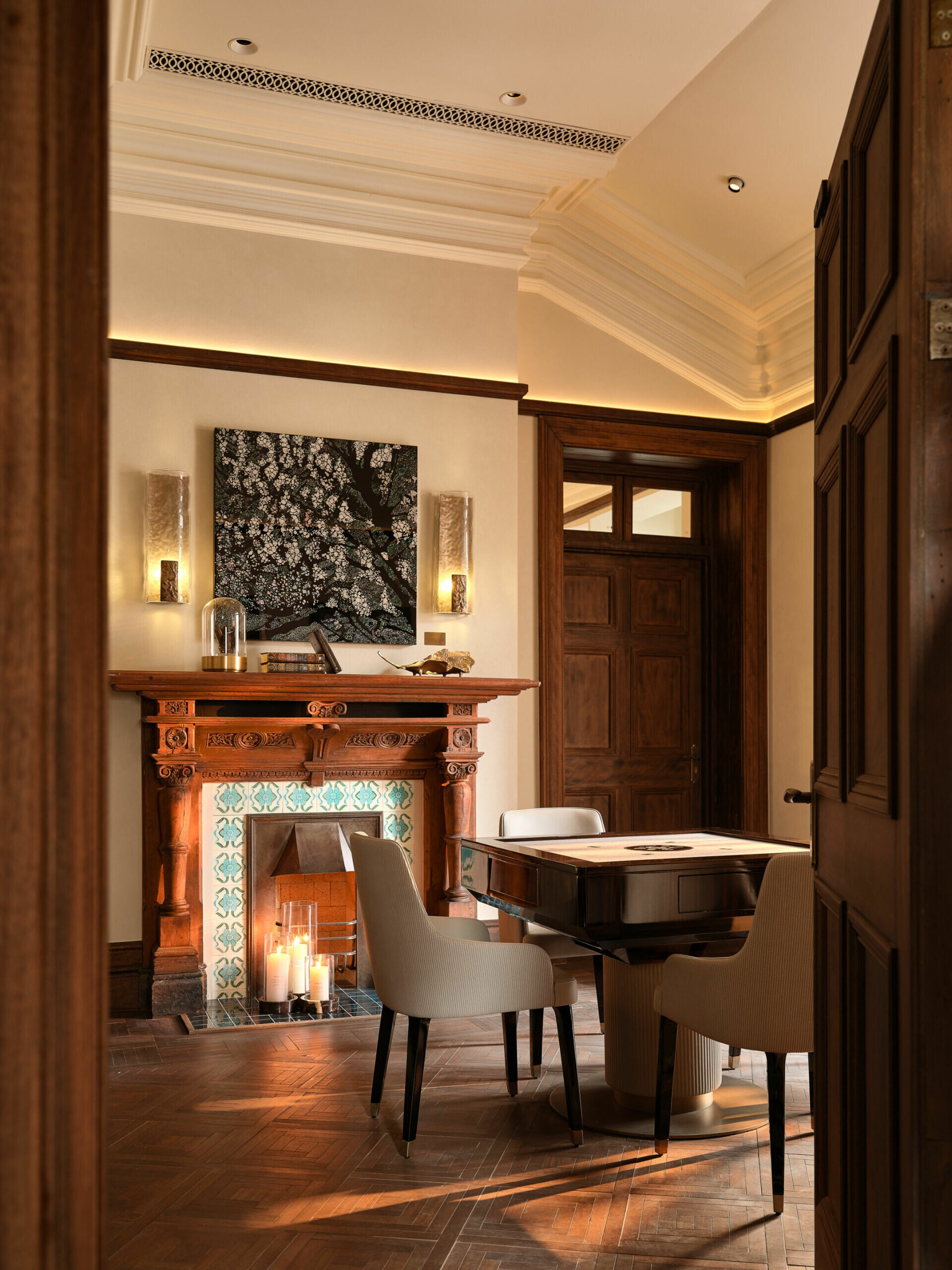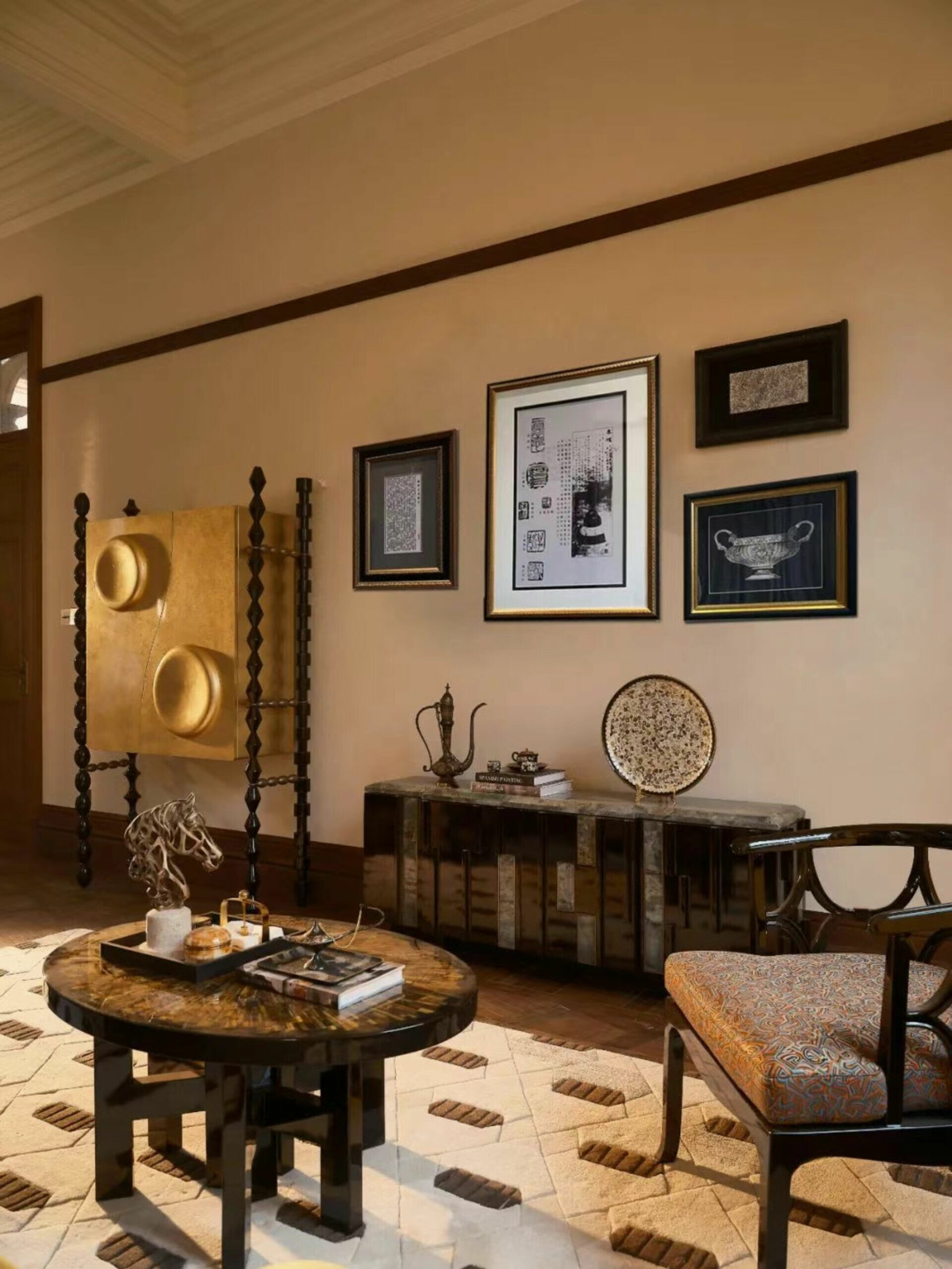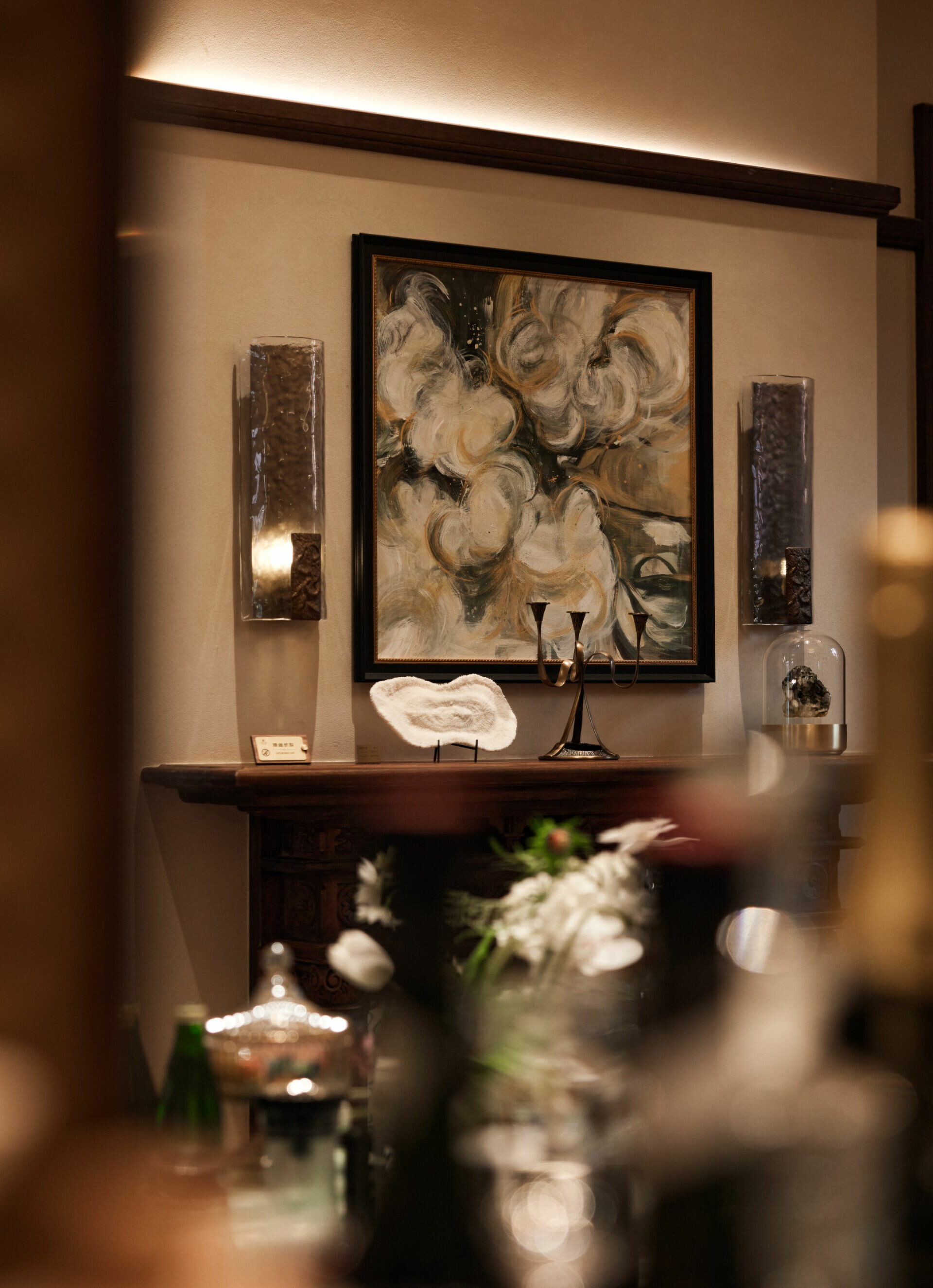 在色彩與材質的選擇上,設計不追求過多裝飾,而是以「低調、高質」為調性,使老宅的沉穩、木材的溫度與光影的柔和交織,形成一種含蓄卻深刻的美學。譬如水吧區選用深色木飾面配合柔和燈光,將典雅與靜謐相融;展陳空間則把歷史氛圍作為底層語彙,與當代藝術裝置共構一個跨越時代的敘事場景。在這裡,歷史不是背景,而是參與者;空間不是容器,而是對話者。