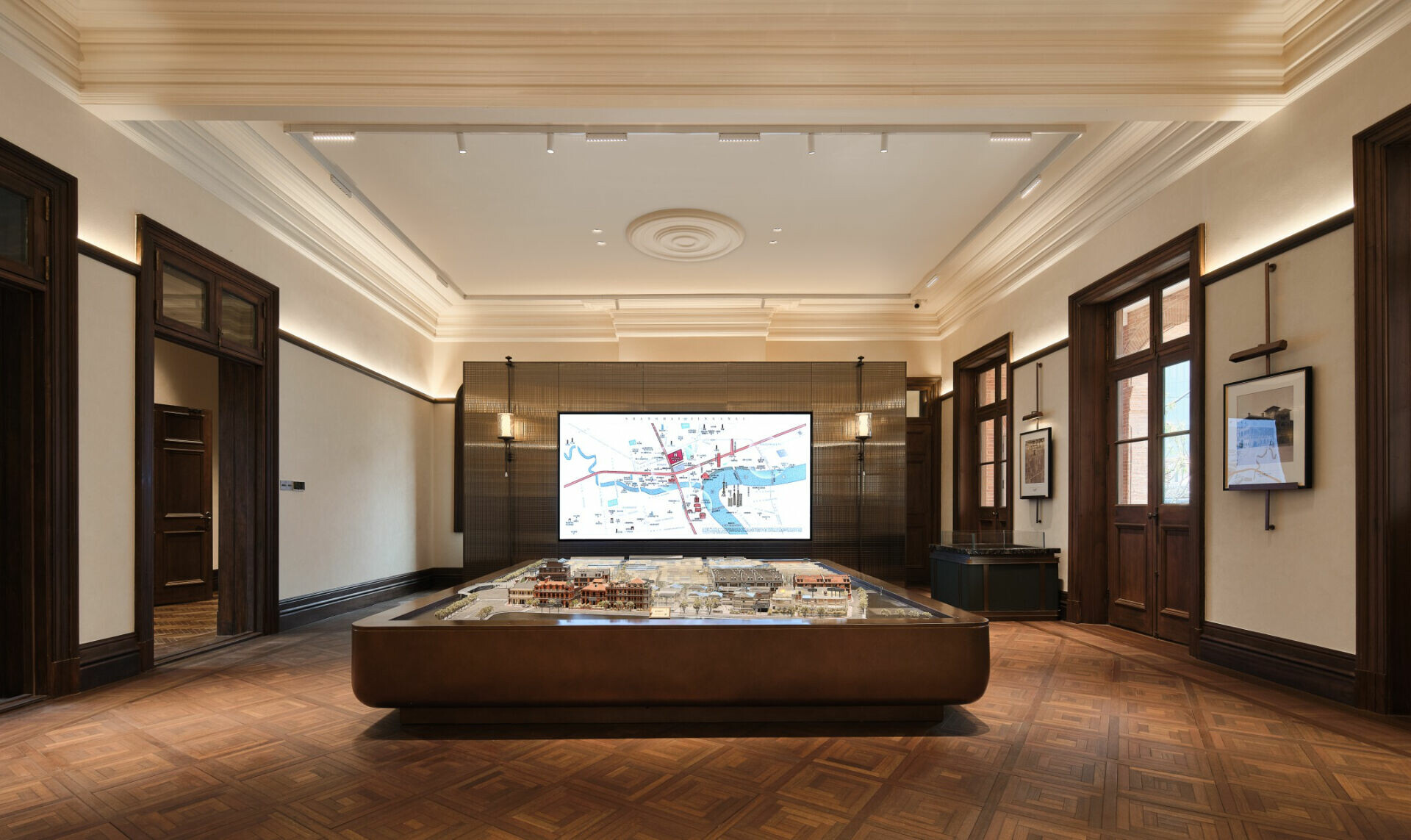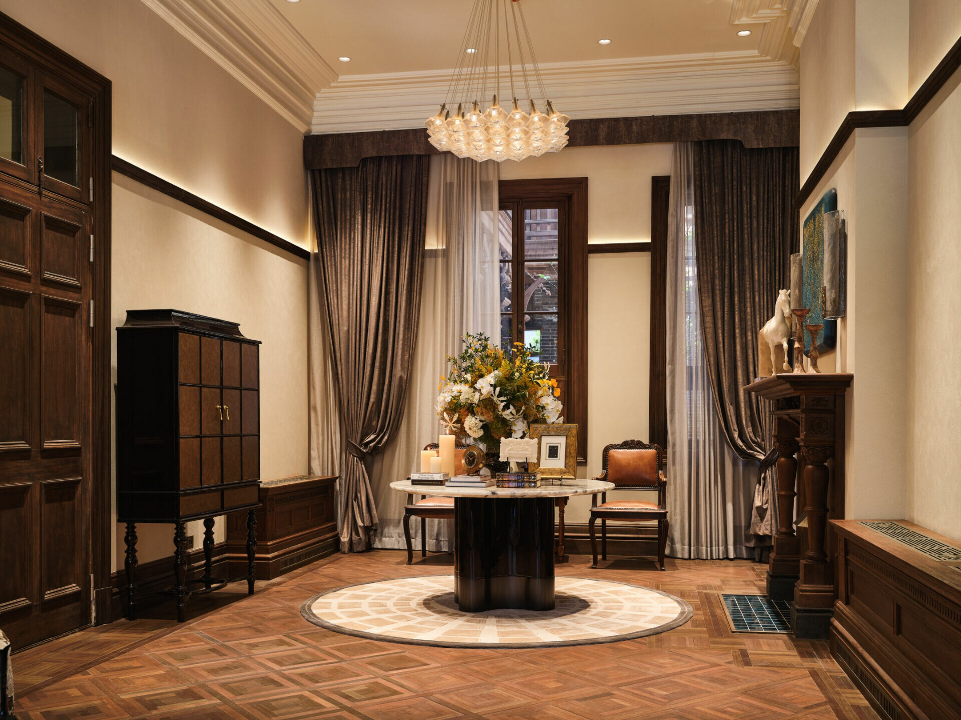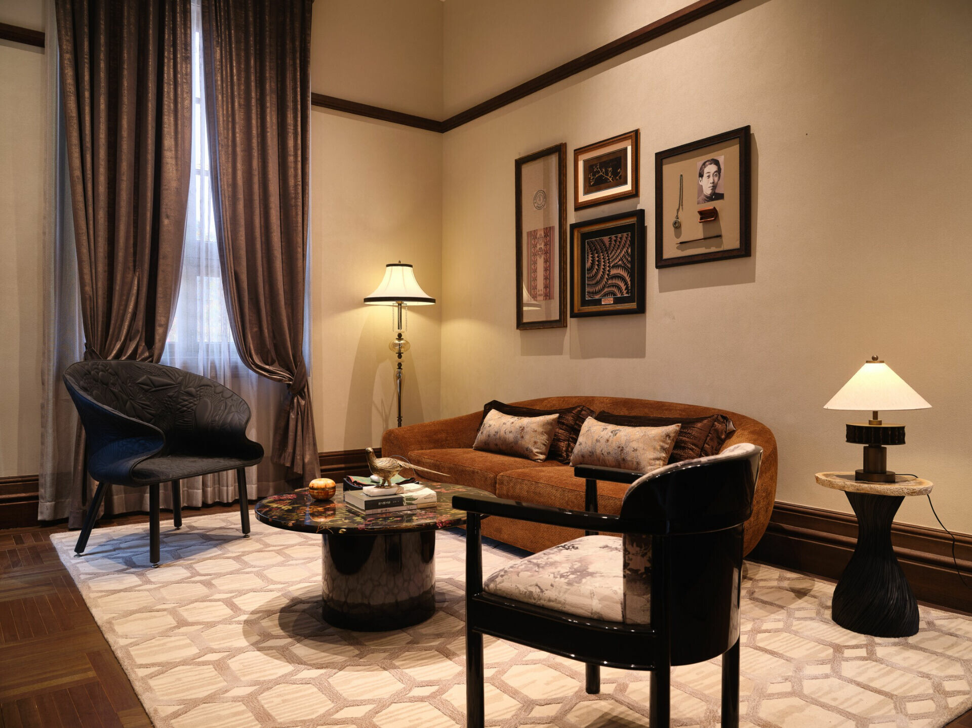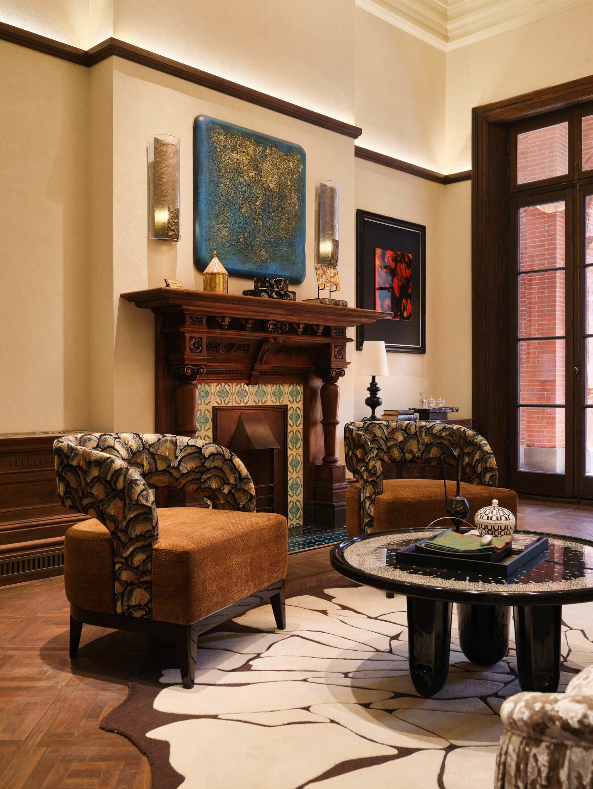 在色彩與材質的選擇上,設計不追求過多裝飾,而是以「低調、高質」為調性,使老宅的沉穩、木材的溫度與光影的柔和交織,形成一種含蓄卻深刻的美學。譬如水吧區選用深色木飾面配合柔和燈光,將典雅與靜謐相融;展陳空間則把歷史氛圍作為底層語彙,與當代藝術裝置共構一個跨越時代的敘事場景。在這裡,歷史不是背景,而是參與者;空間不是容器,而是對話者。