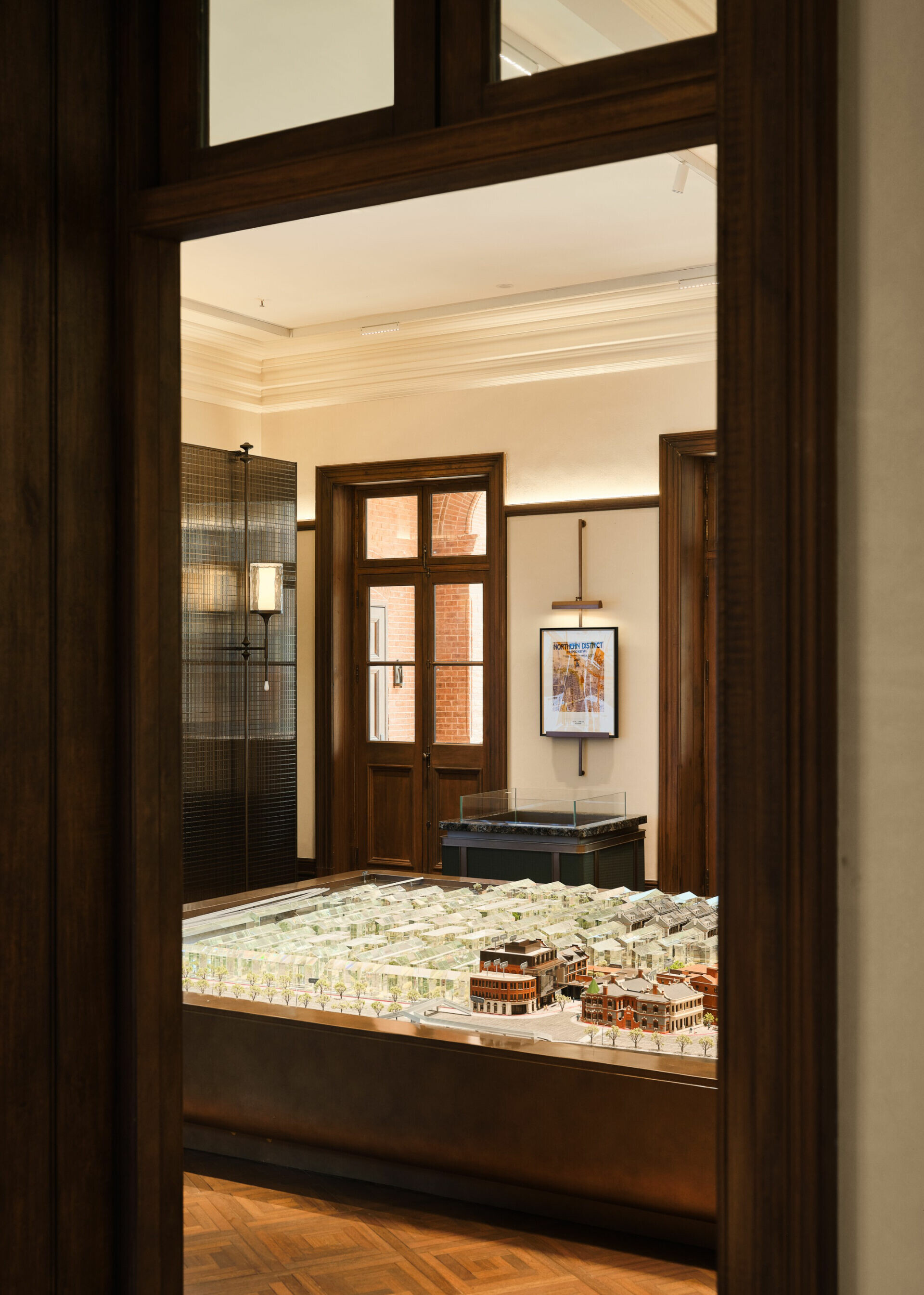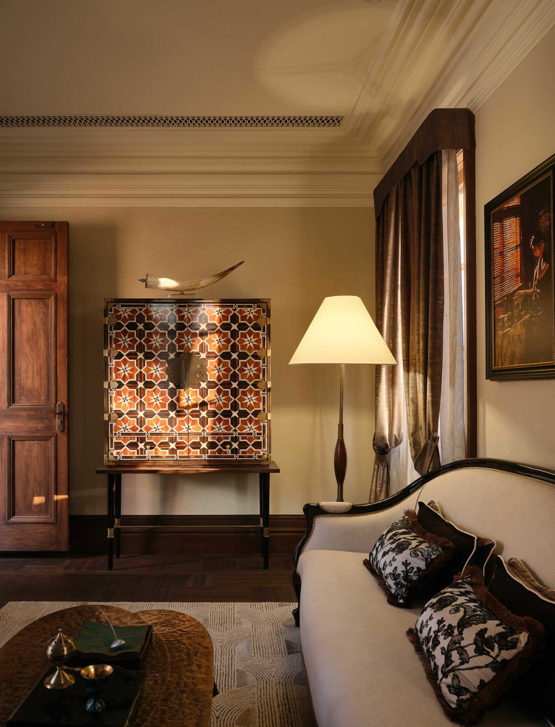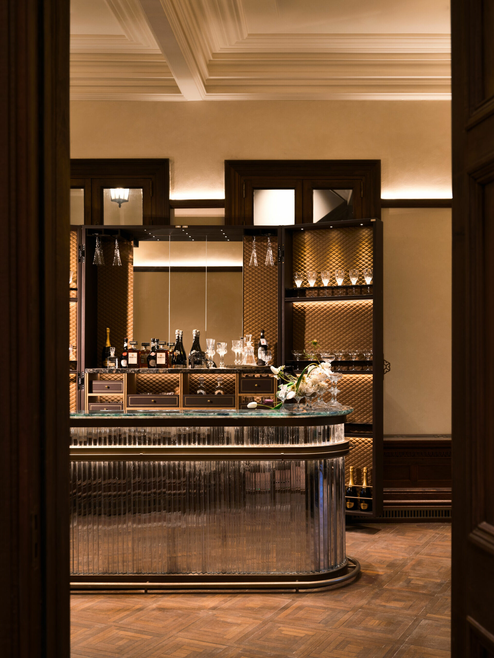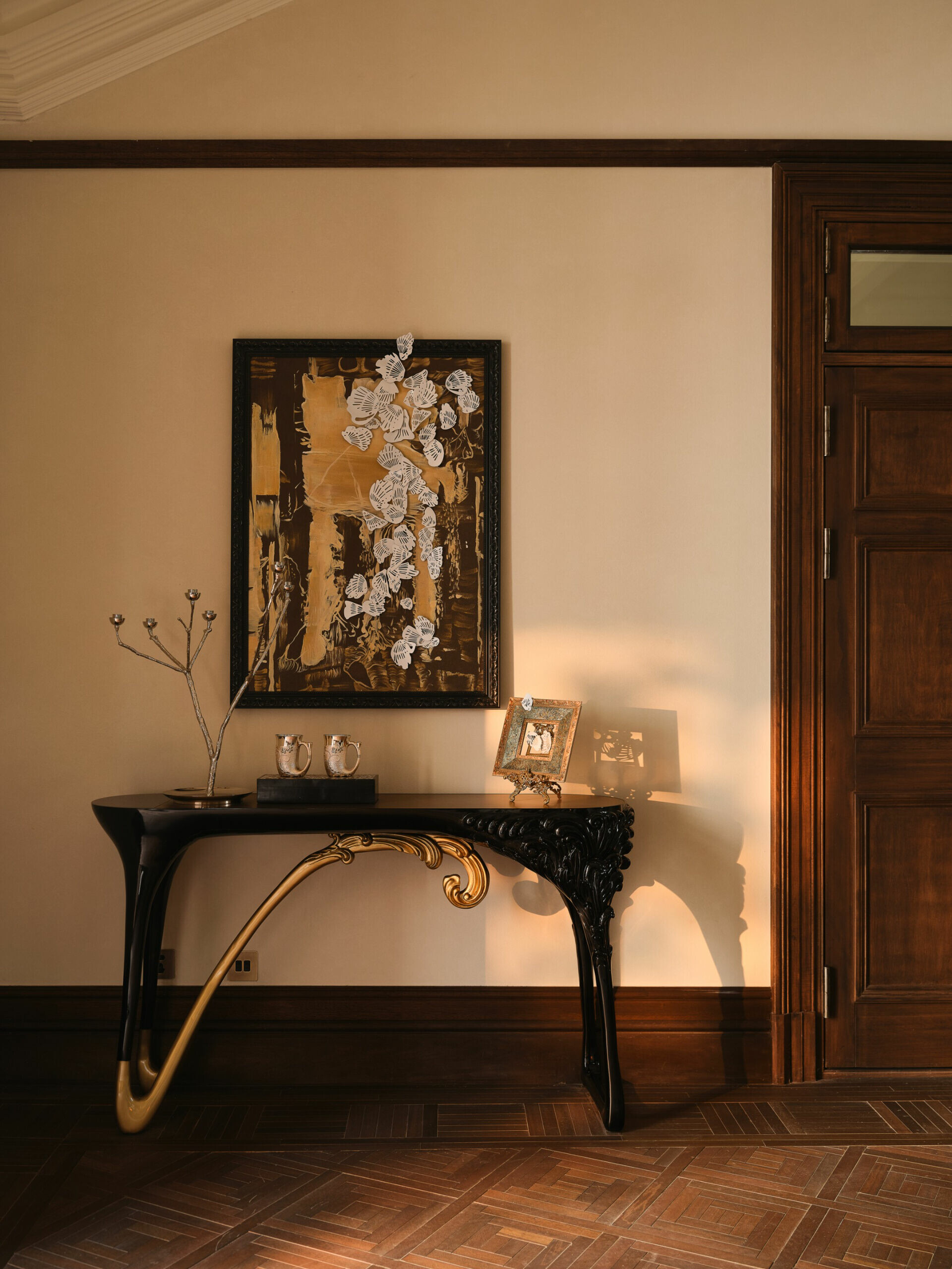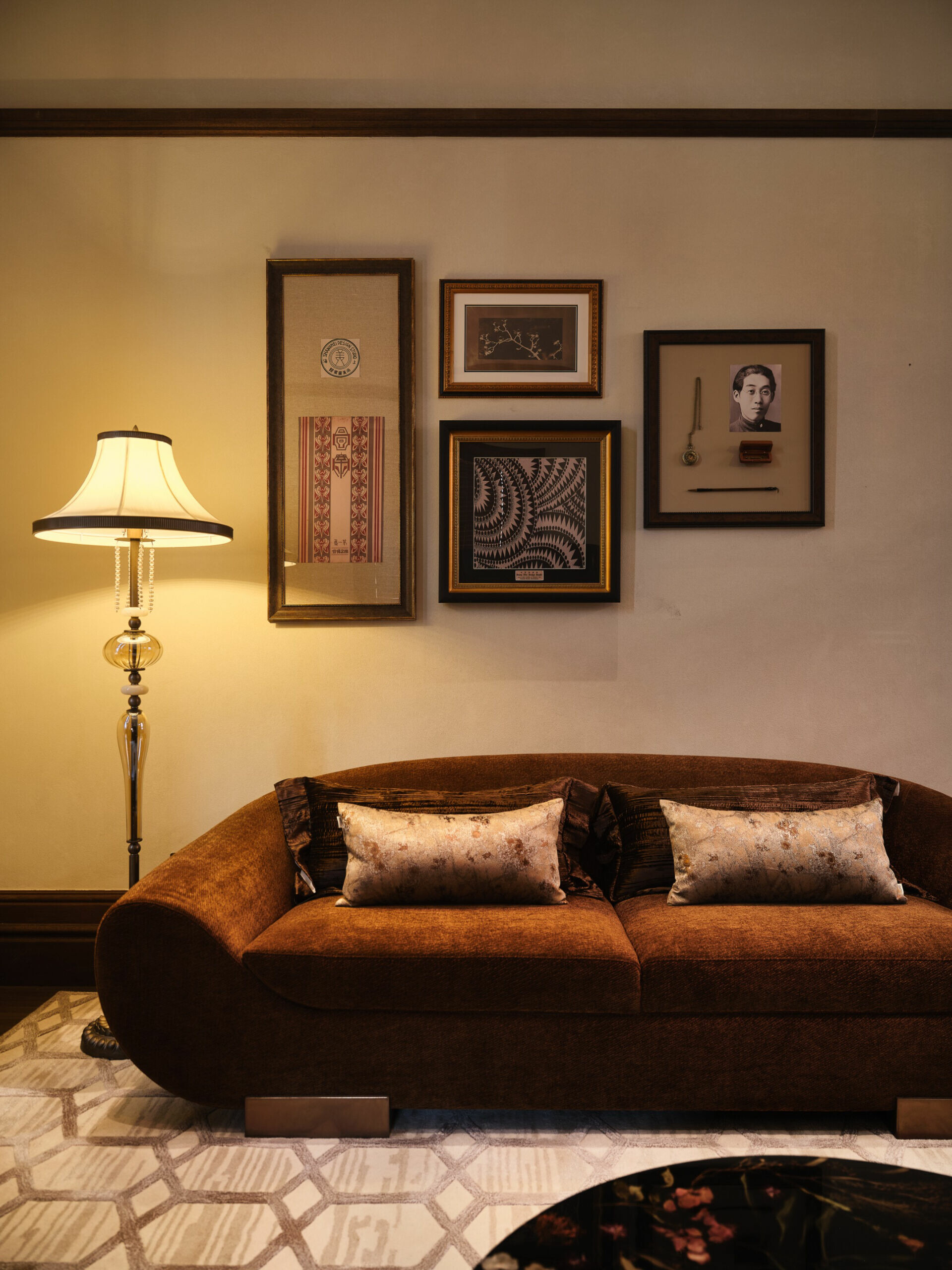 在色彩與材質的選擇上,設計不追求過多裝飾,而是以「低調、高質」為調性,使老宅的沉穩、木材的溫度與光影的柔和交織,形成一種含蓄卻深刻的美學。譬如水吧區選用深色木飾面配合柔和燈光,將典雅與靜謐相融;展陳空間則把歷史氛圍作為底層語彙,與當代藝術裝置共構一個跨越時代的敘事場景。在這裡,歷史不是背景,而是參與者;空間不是容器,而是對話者。