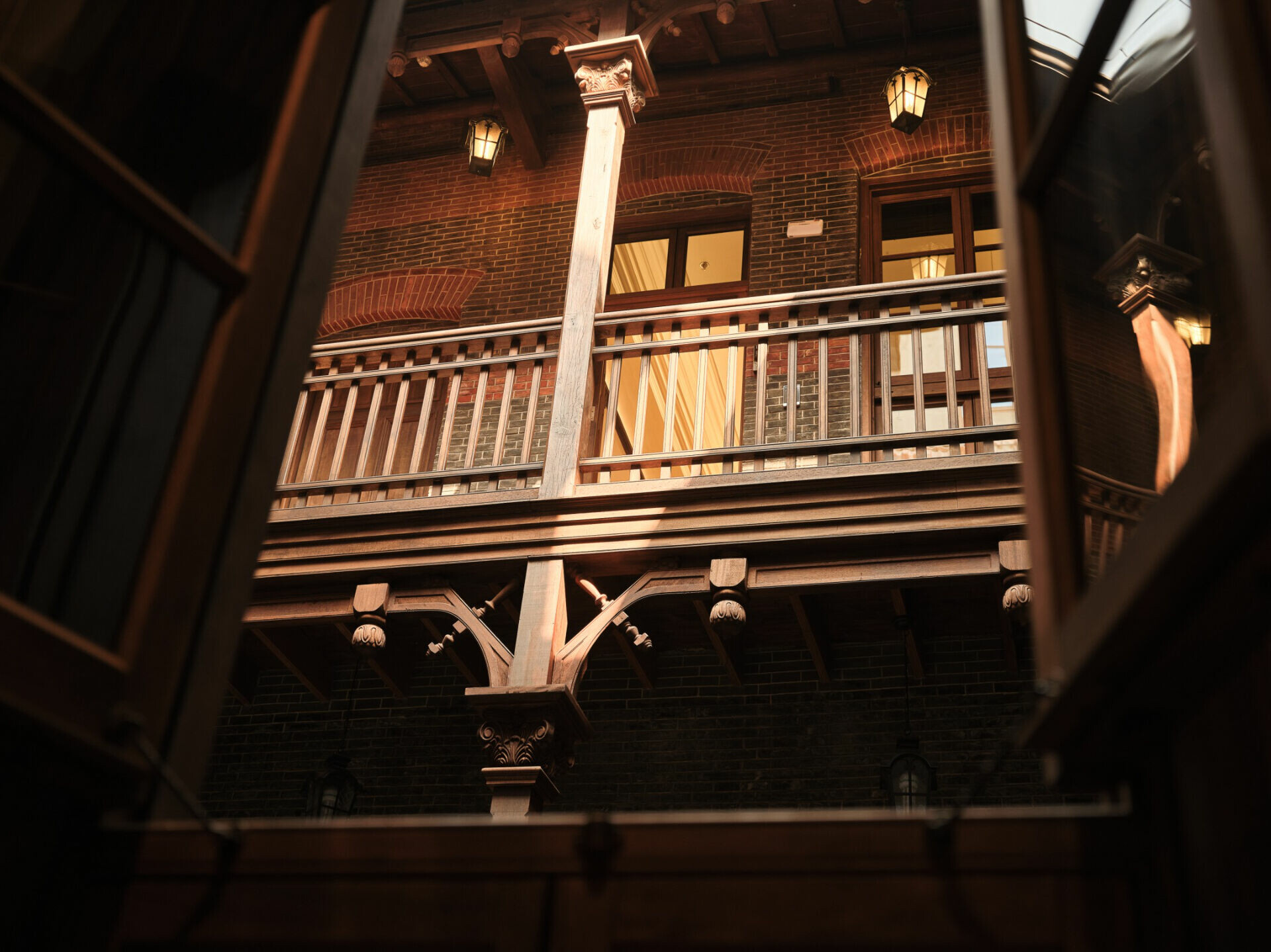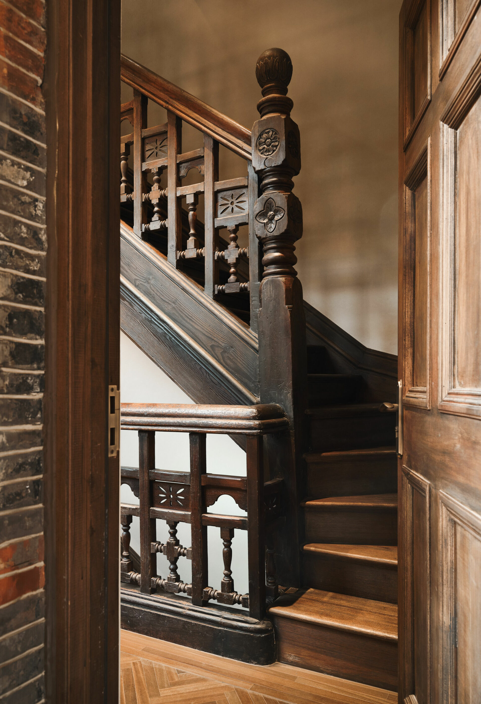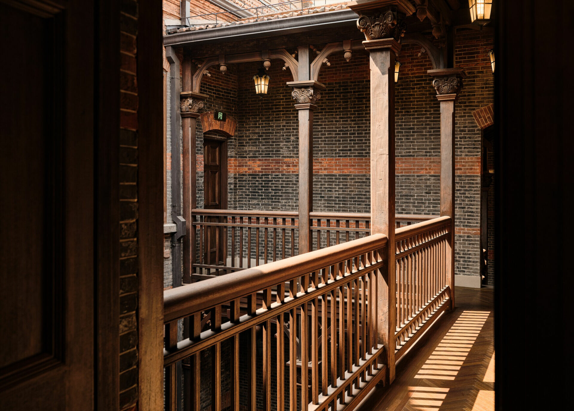 設計團隊以「保護為前提,活化為核心」為出發點,以科學性的建築修繕方式強化結構,讓過去的細節在今日的光線裡重新站立。原有的木質樓梯經過精細修補後,帶著溫潤的光澤重新成為垂直動線的主角;鑲木牆板與雕花線腳在清理與加固後呈現出歲月的深刻紋理;青磚立面則以非破壞性技術修復,使建築外觀得以保留最初的海派韻味。然而,修復並不是停留於回到過去,活化才是讓建築真正重生的語言。設計團隊重新梳理空間邏輯,在尊重原有格局的前提下,使建築能承載當代需求:接待、展示、交流、策展等複合機能在其中自然地生長。