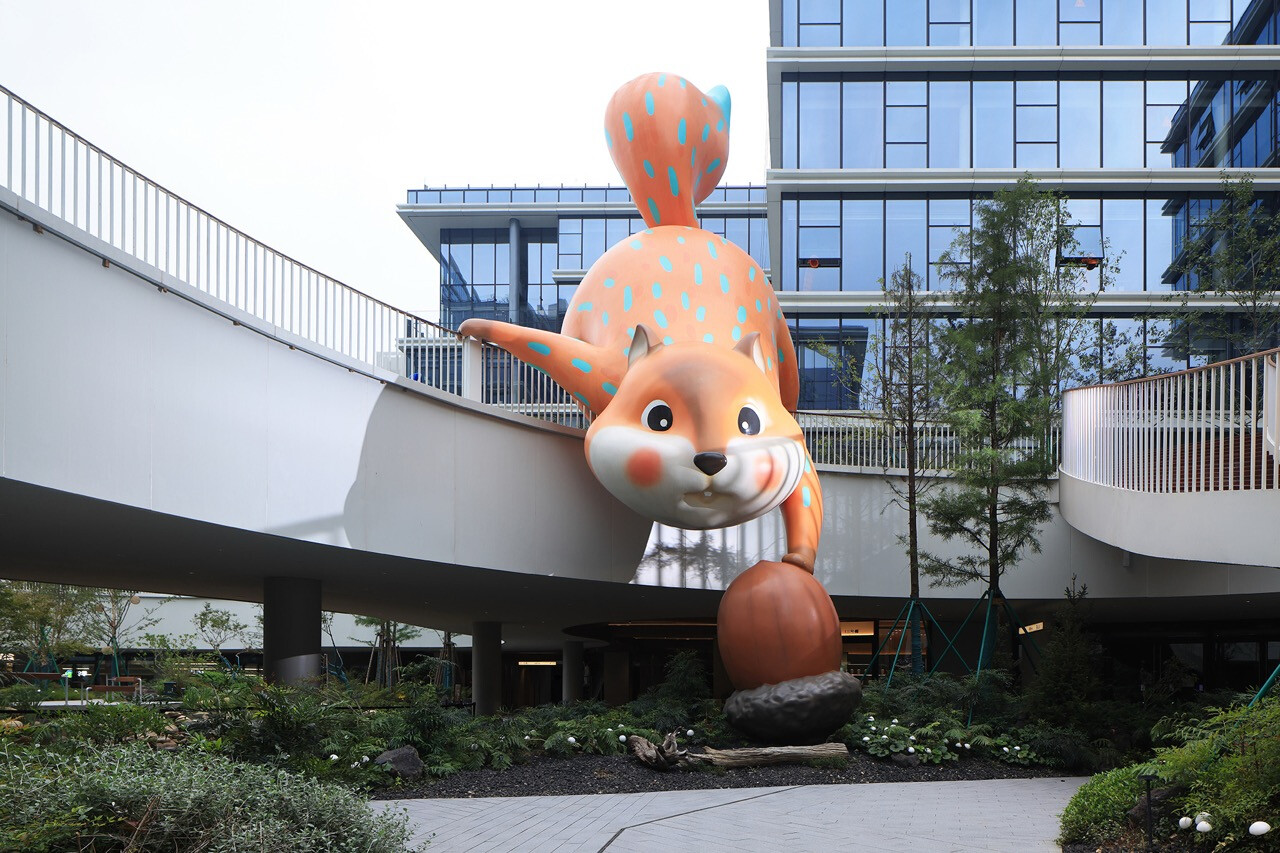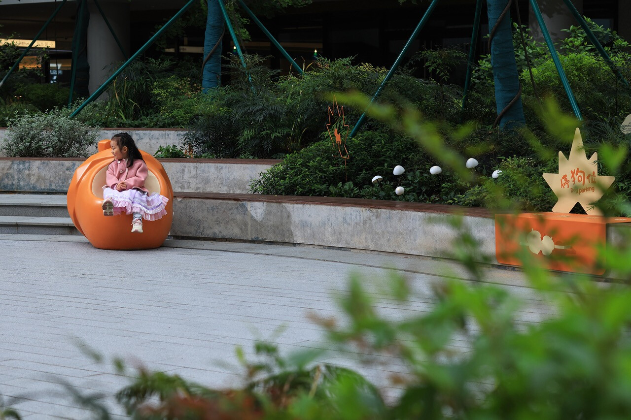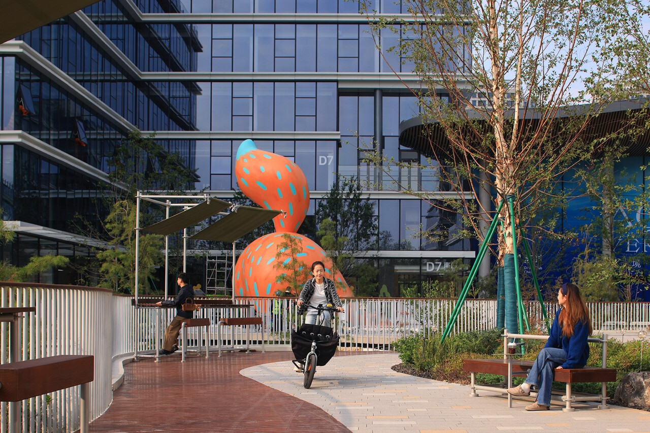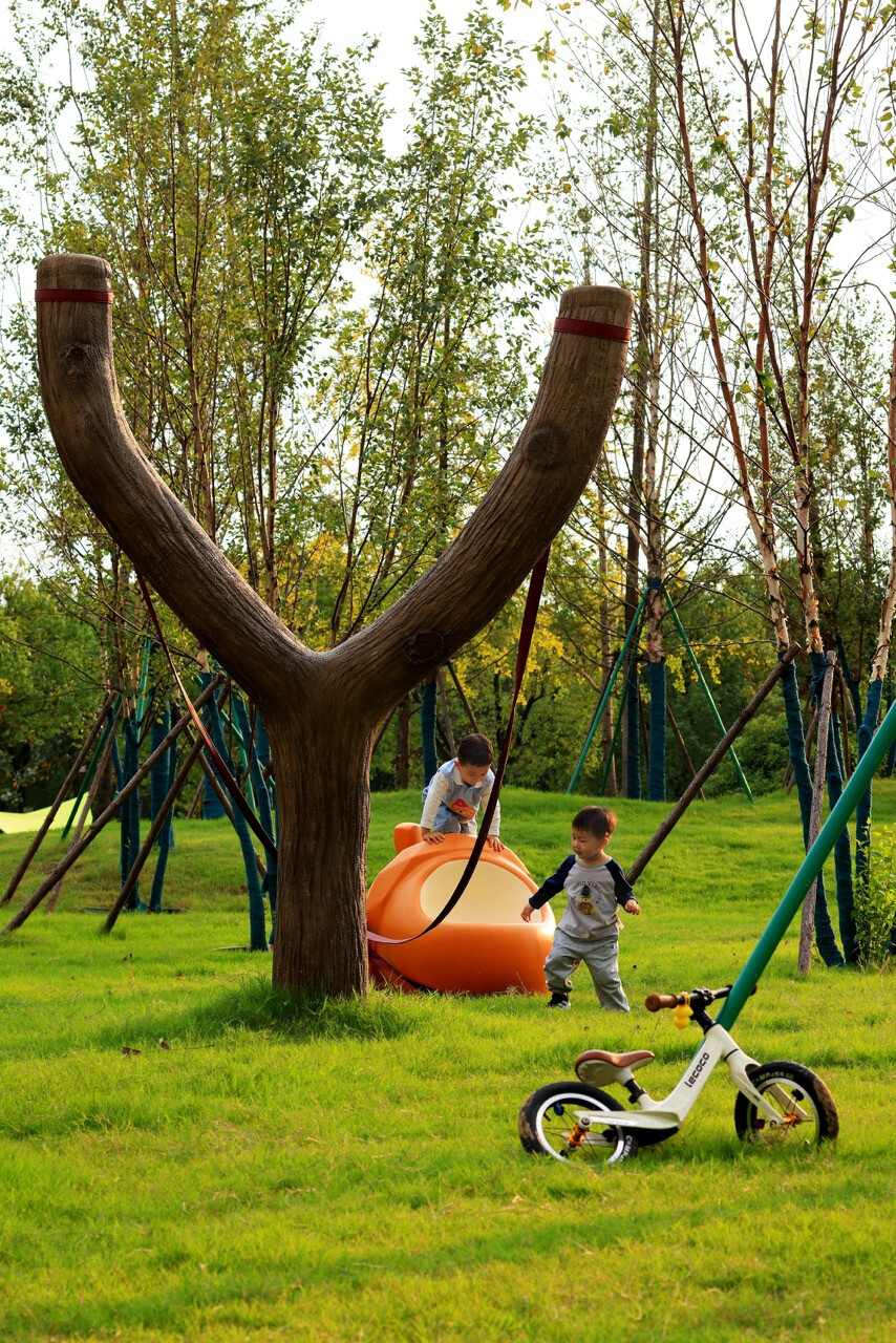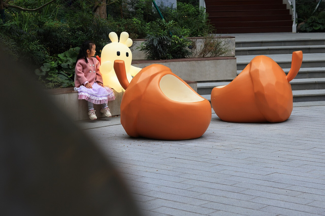 作為杭州「親橙 Park」的核心敘事,「森嶼精靈」並未被處理成強烈的視覺符號。設計團隊刻意降低它的存在感,讓它藏在轉角、草叢與休憩節點之中。有時你會突然發現它從地面探出頭來,有時又幾乎與自然融為一體。這樣的安排,使空間不再需要被不斷解說。精靈的存在像是一種低聲細語,只在你願意慢下來時才會被聽見。它們不要求被觀看,而是陪伴,讓自然與想像力在日常之中持續發酵。