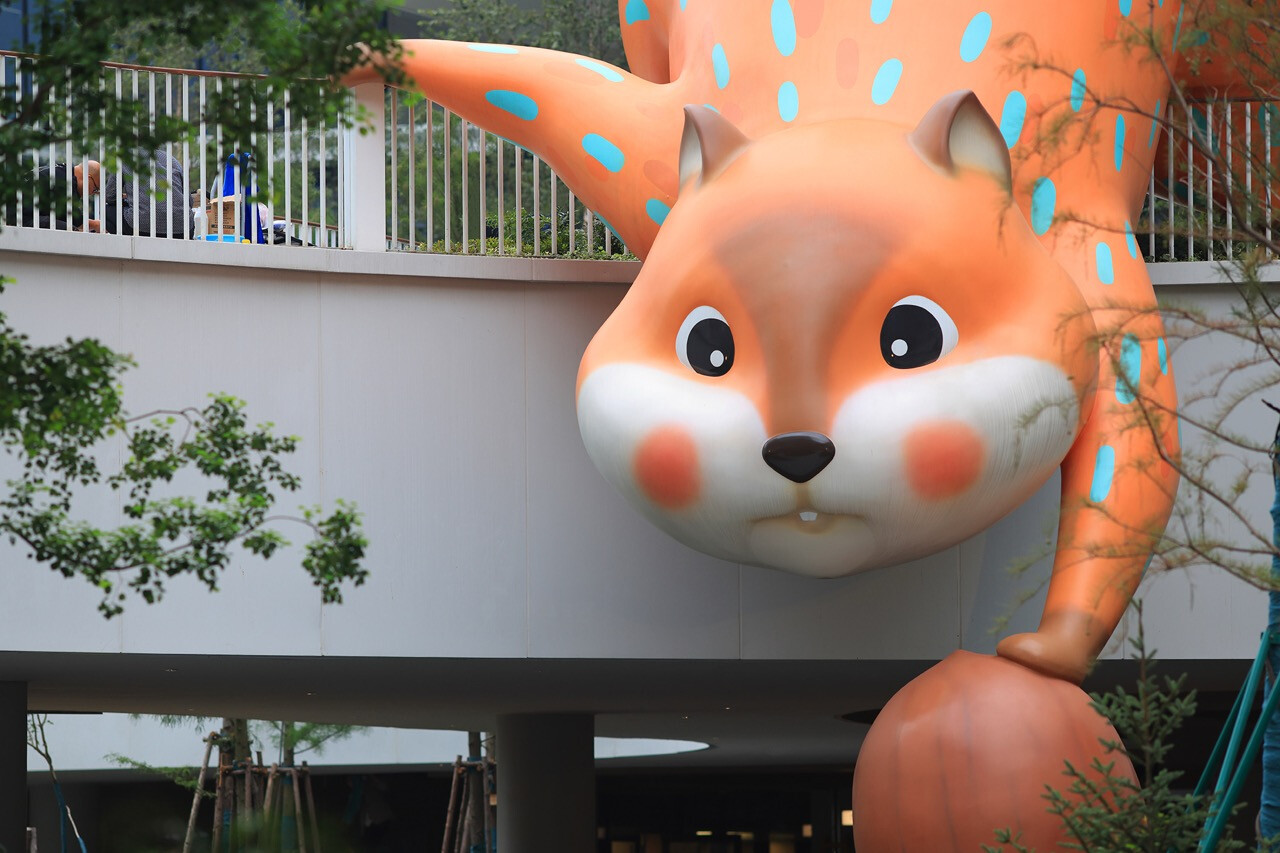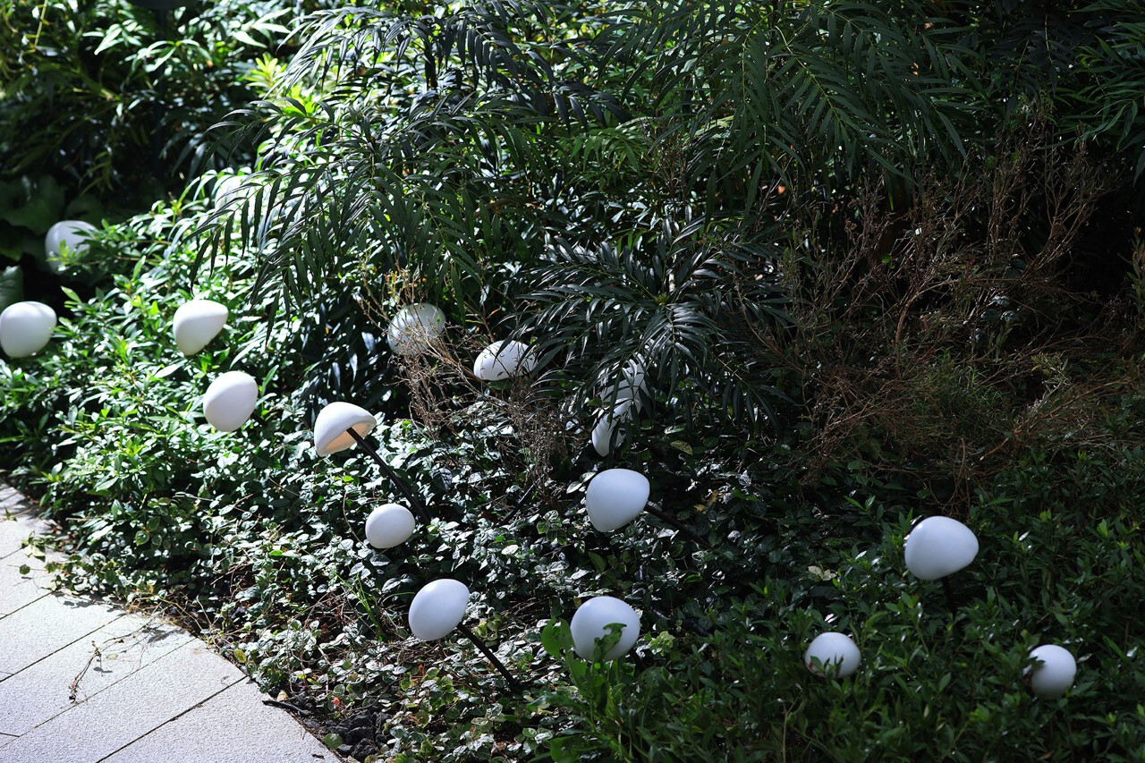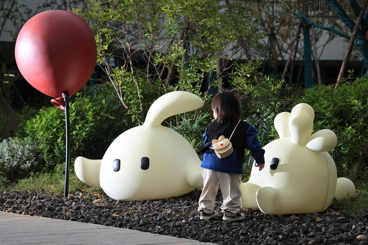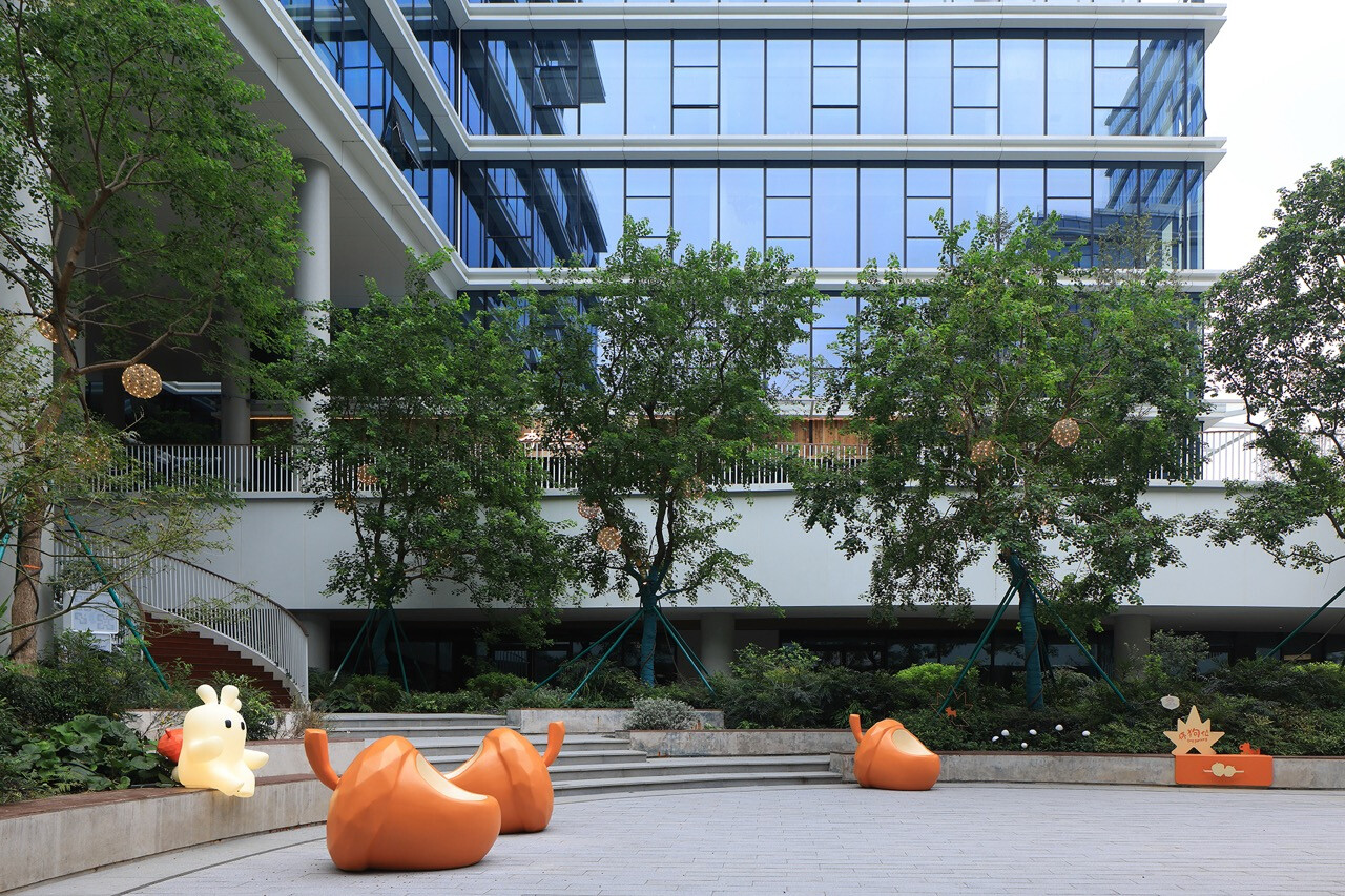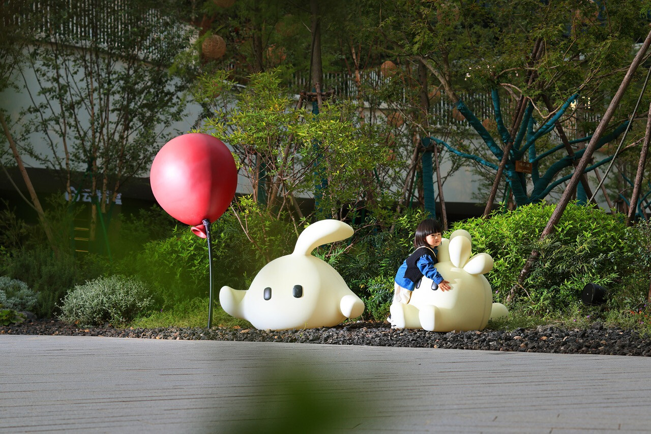 作為杭州「親橙 Park」的核心敘事,「森嶼精靈」並未被處理成強烈的視覺符號。設計團隊刻意降低它的存在感,讓它藏在轉角、草叢與休憩節點之中。有時你會突然發現它從地面探出頭來,有時又幾乎與自然融為一體。這樣的安排,使空間不再需要被不斷解說。精靈的存在像是一種低聲細語,只在你願意慢下來時才會被聽見。它們不要求被觀看,而是陪伴,讓自然與想像力在日常之中持續發酵。