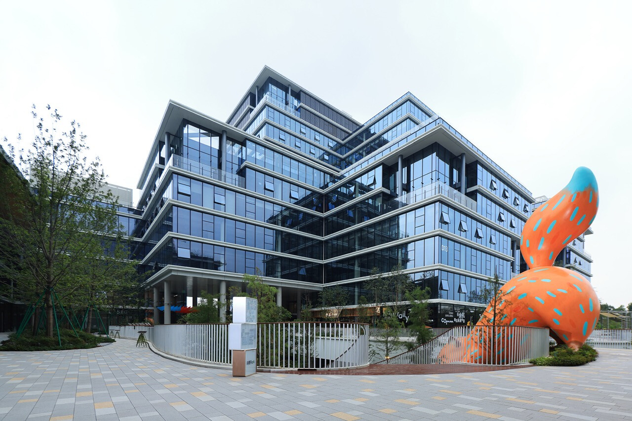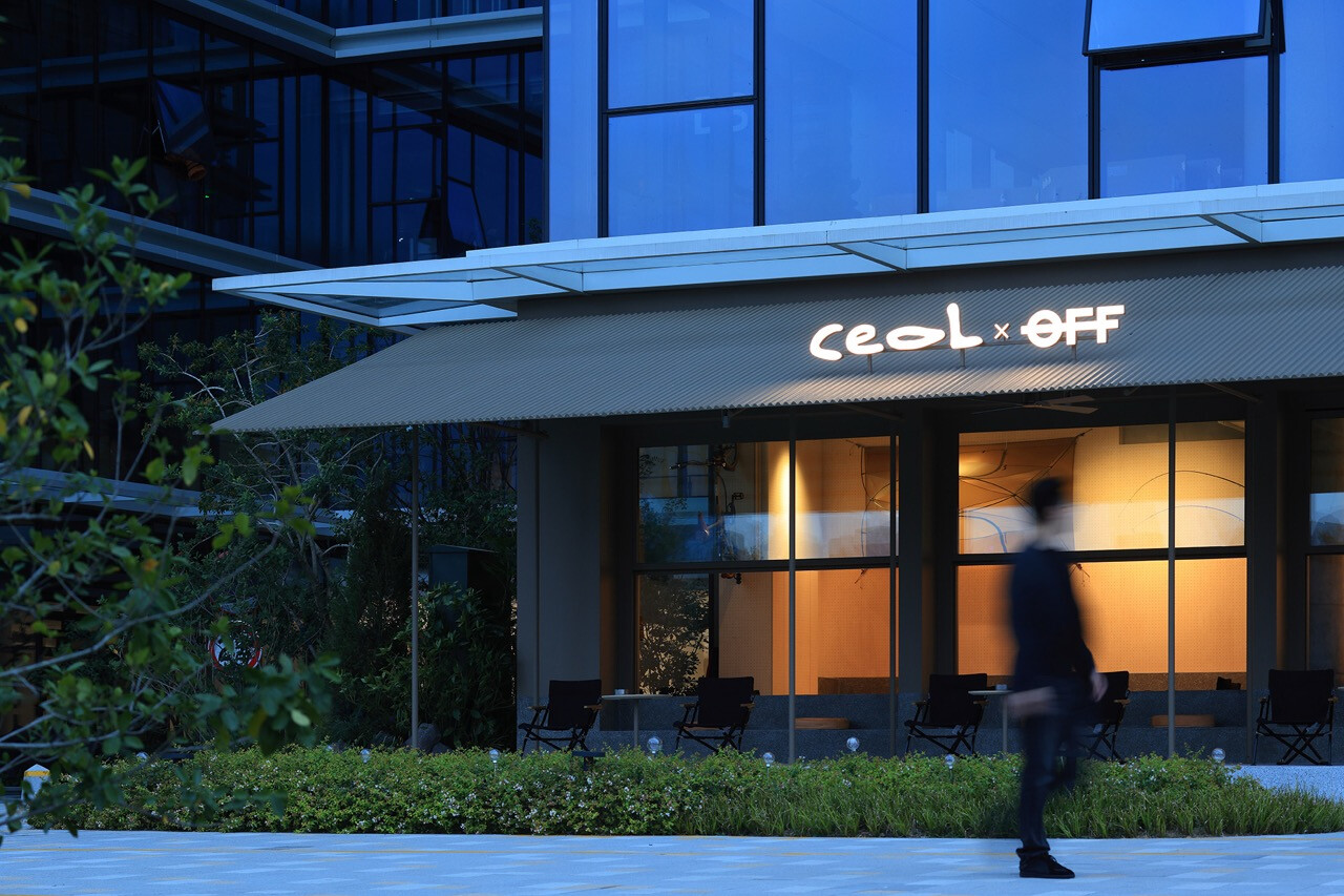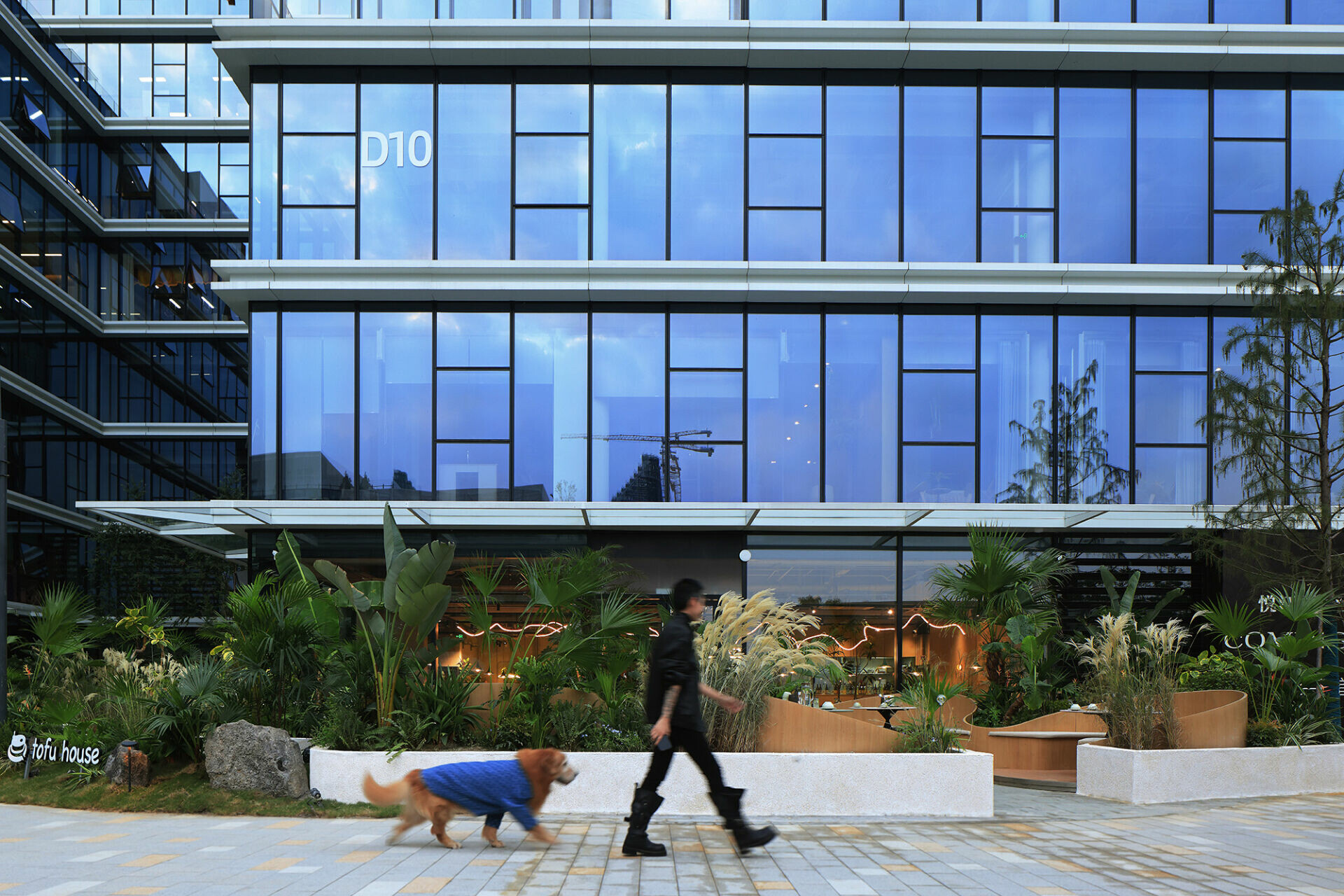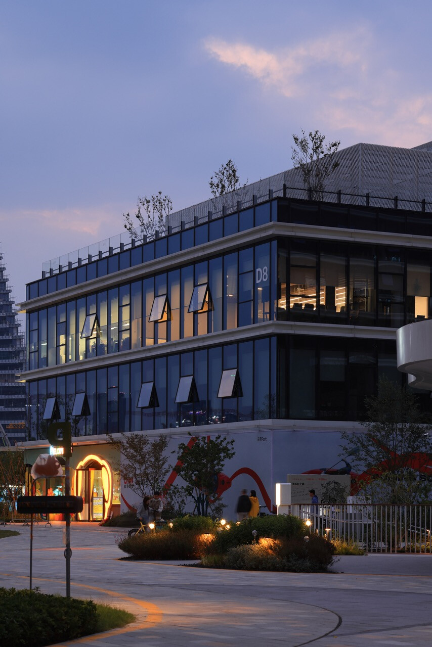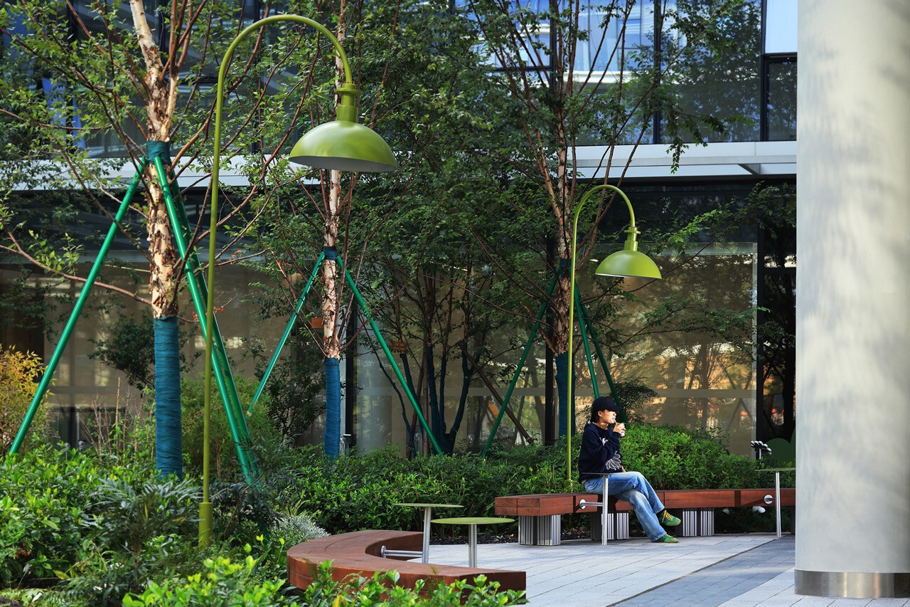 起初,在當代城市語境裡,商業空間經常被視為一種過渡系統。人被引導進入、完成消費、迅速離場,一切清楚而高效。然而,杭州「親橙 Park」的設計起點,並不在於如何放大消費行為,而是回到更基本的問題:在以辦公人群為主的城市片區,是否可能出現一個願意被反覆使用、甚至只是被單純停留的公共場域?於是,商業被放在一個更安靜的位置。它沒有消失,而是像背景音一樣存在於生活之中。人們可以在這裡坐下來接一通電話、帶著寵物曬太陽,或只是什麼也不做。空間不急著回應需求,而是容許各種狀態自然發生。