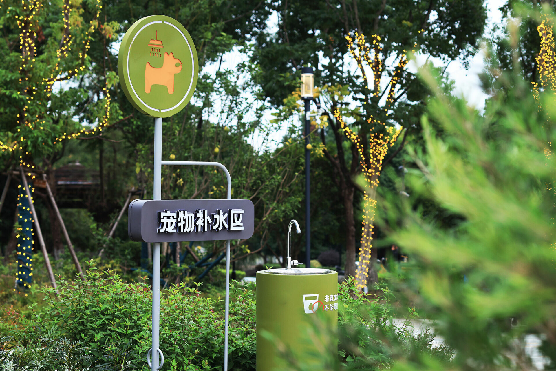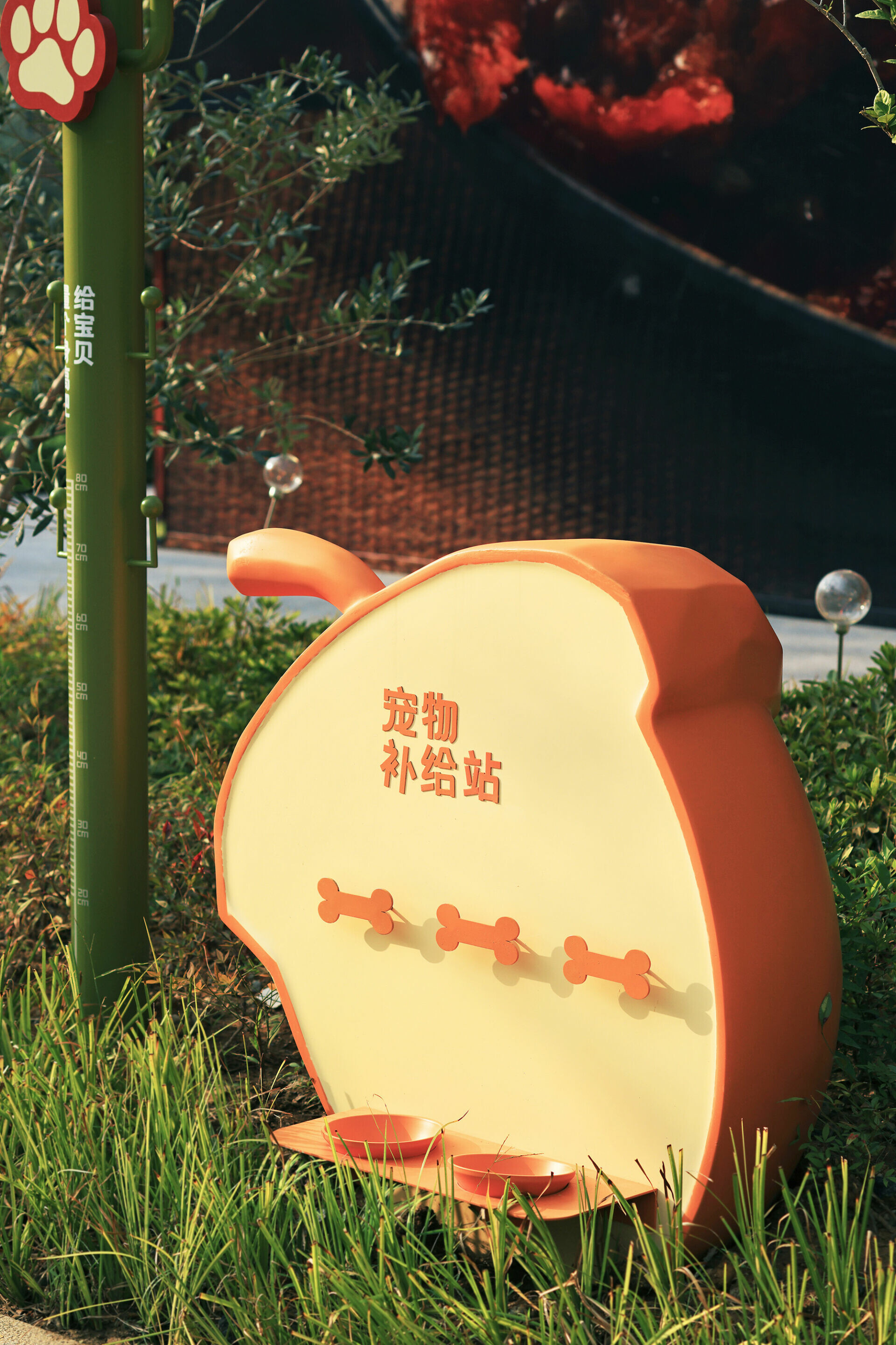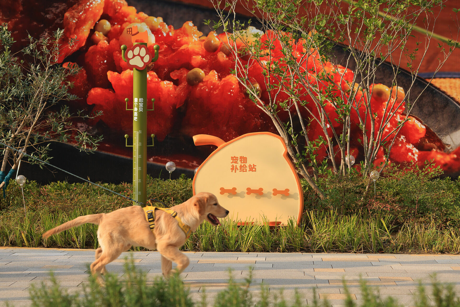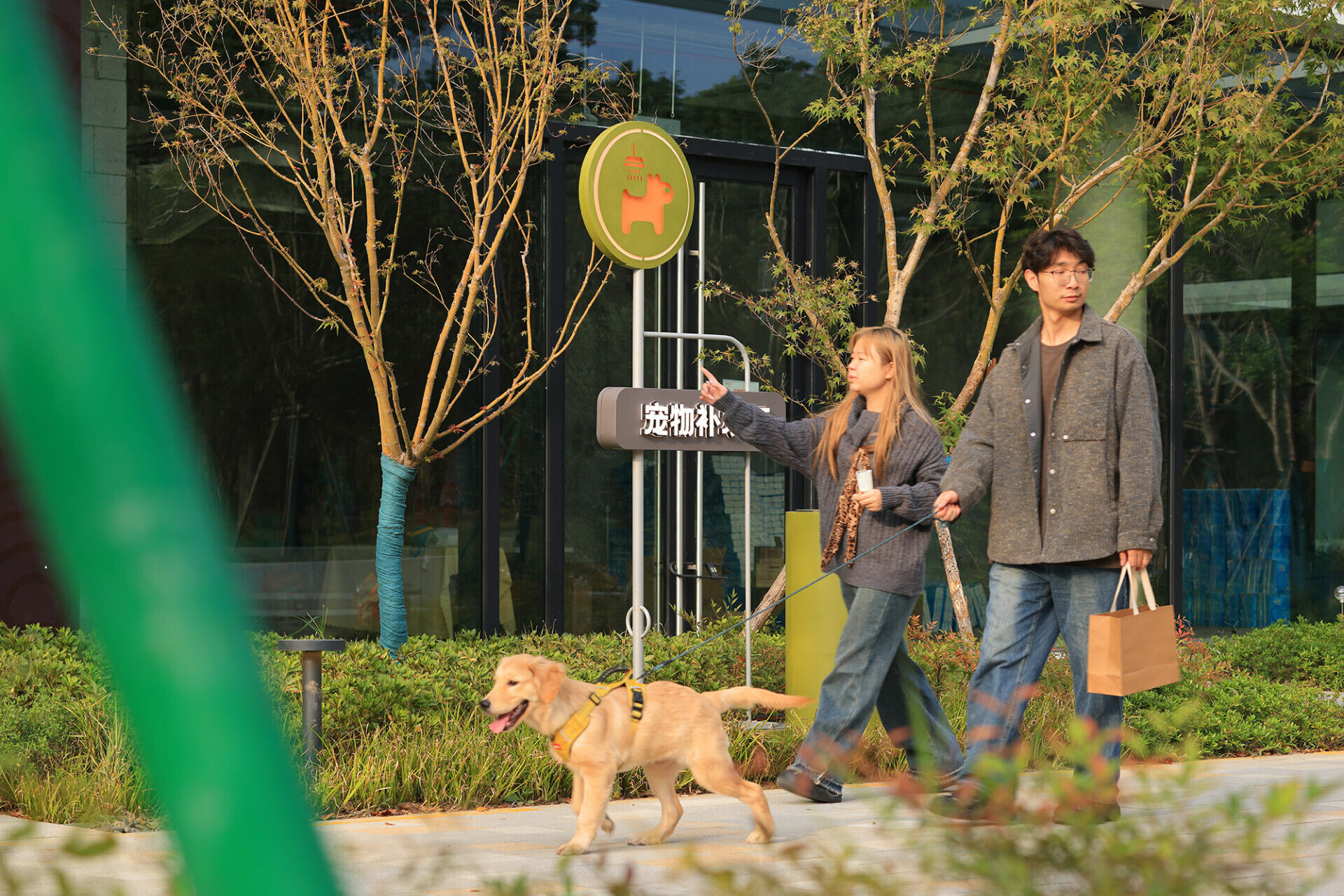 此外,杭州「親橙 Park」的草坪與舞台,被設計為一個可重複使用的彈性場域。在需要的時候,它可以承載活動、展演與社群聚集;在沒有活動的日子裡,它又自然退回風景之中,成為城市的一部分背景。這樣的設計,讓空間不必時時保持高張力狀態。它允許時間的介入,讓不同階段、不同使用方式在同一個場域中共存。商業、文化與社群的界線因此變得模糊,也更加真實。寵物友善並未被當成附加條件,而是自然地融入場景之中。座椅旁的牽引設計、專屬於毛孩的活動島嶼,以及藏在綠意裡的溫柔提醒,都讓空間多了一層關係的可能。