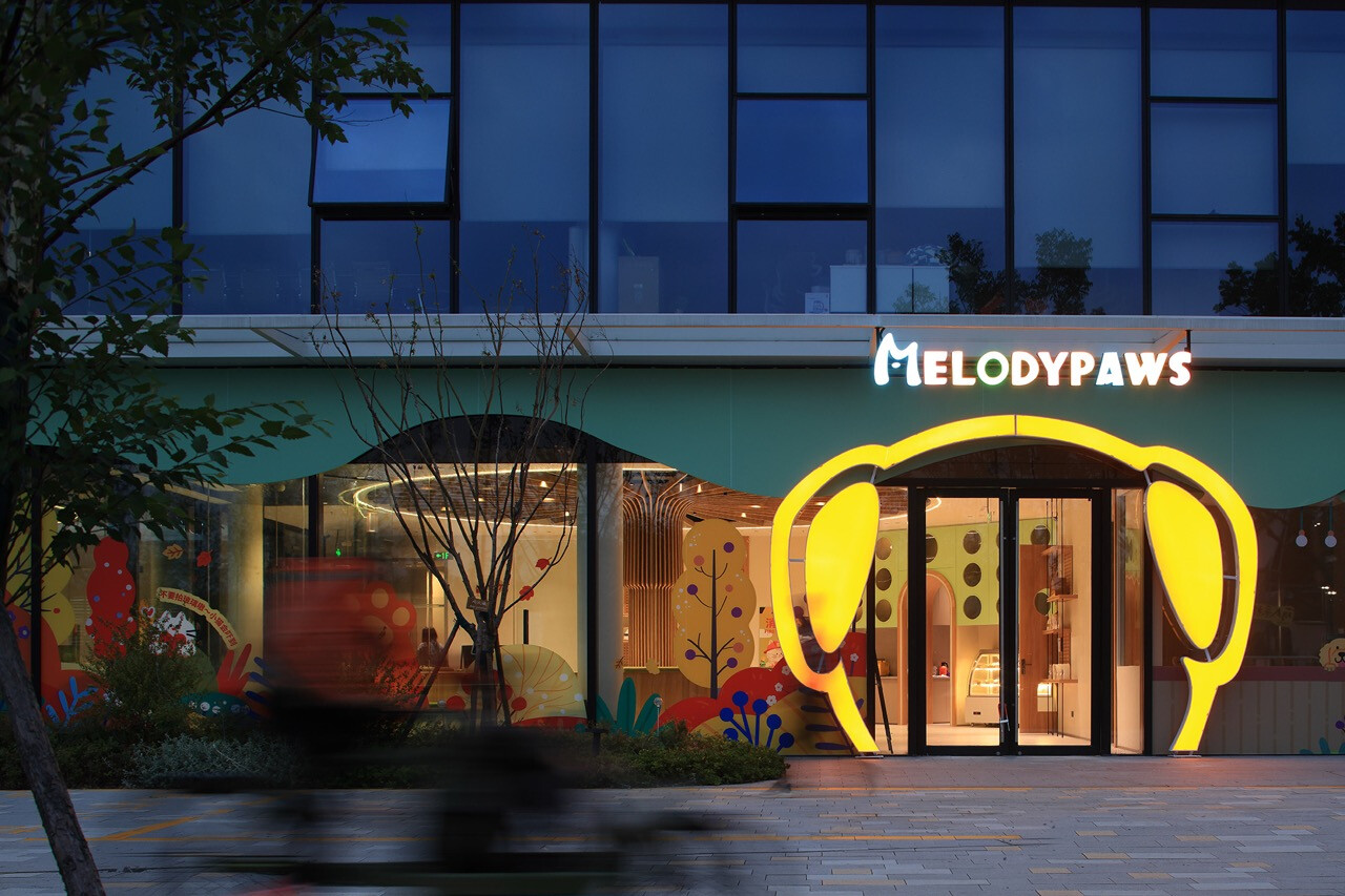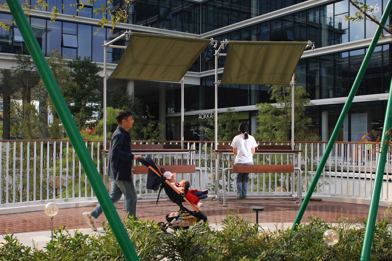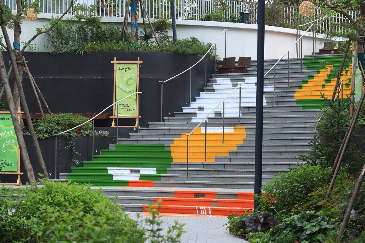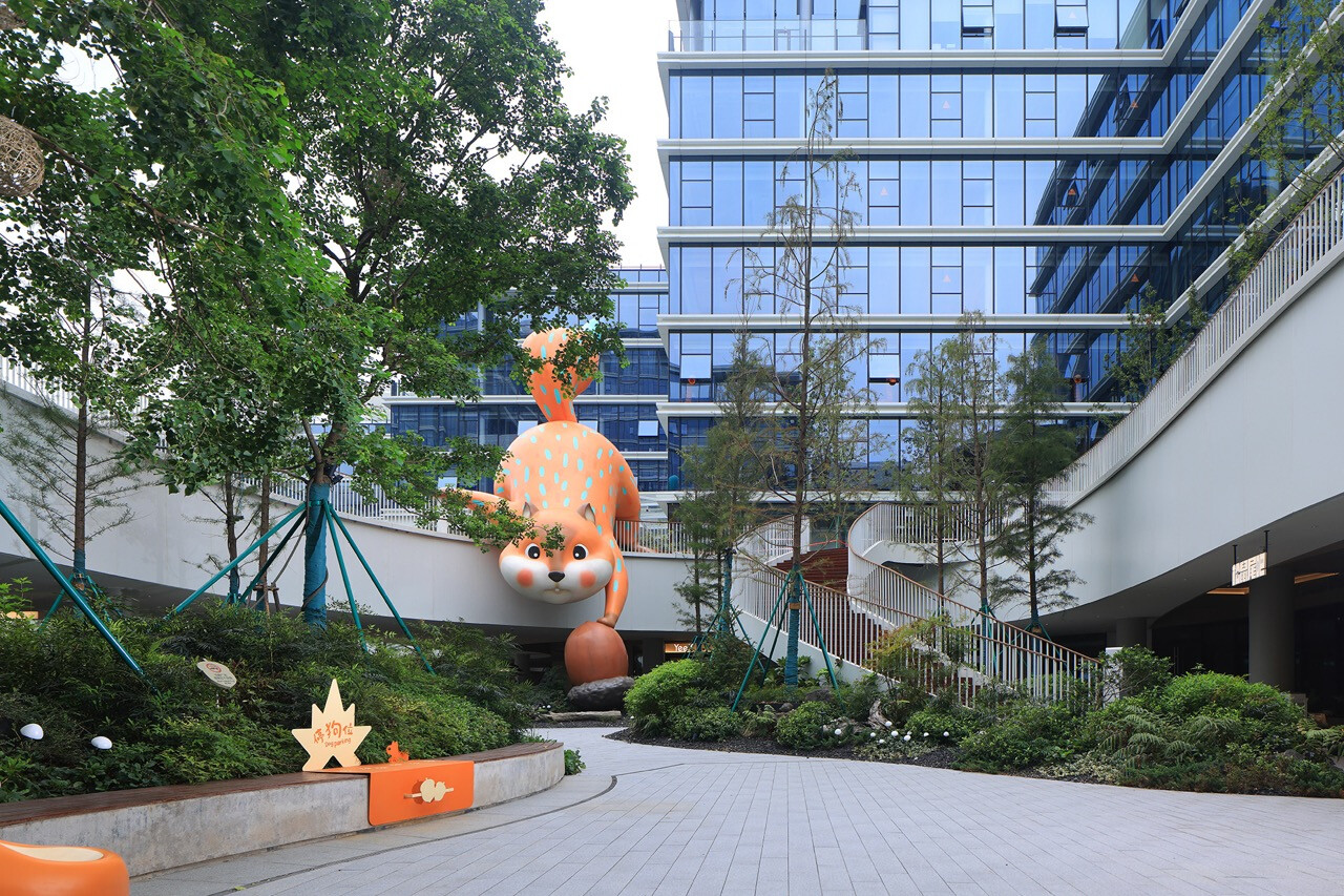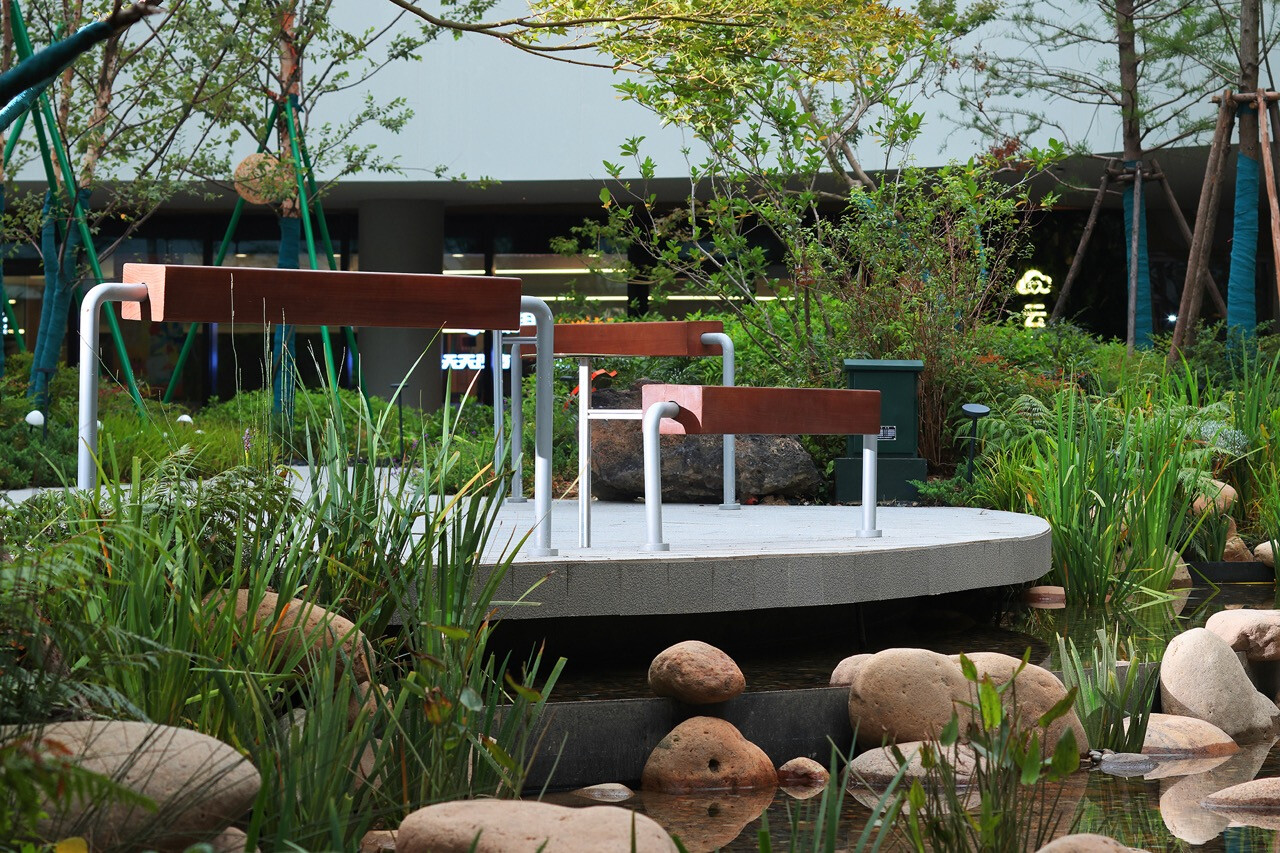 此外,杭州「親橙 Park」的草坪與舞台,被設計為一個可重複使用的彈性場域。在需要的時候,它可以承載活動、展演與社群聚集;在沒有活動的日子裡,它又自然退回風景之中,成為城市的一部分背景。這樣的設計,讓空間不必時時保持高張力狀態。它允許時間的介入,讓不同階段、不同使用方式在同一個場域中共存。商業、文化與社群的界線因此變得模糊,也更加真實。寵物友善並未被當成附加條件,而是自然地融入場景之中。座椅旁的牽引設計、專屬於毛孩的活動島嶼,以及藏在綠意裡的溫柔提醒,都讓空間多了一層關係的可能。