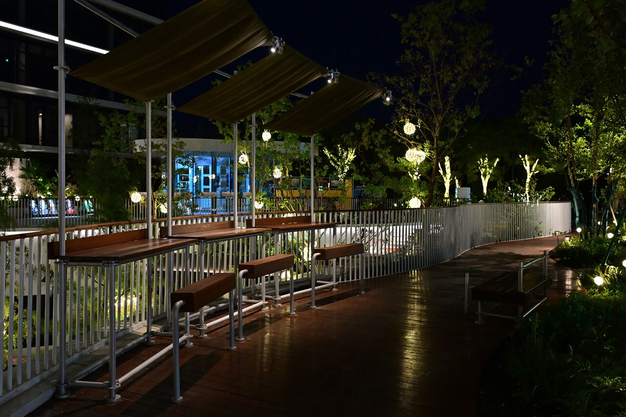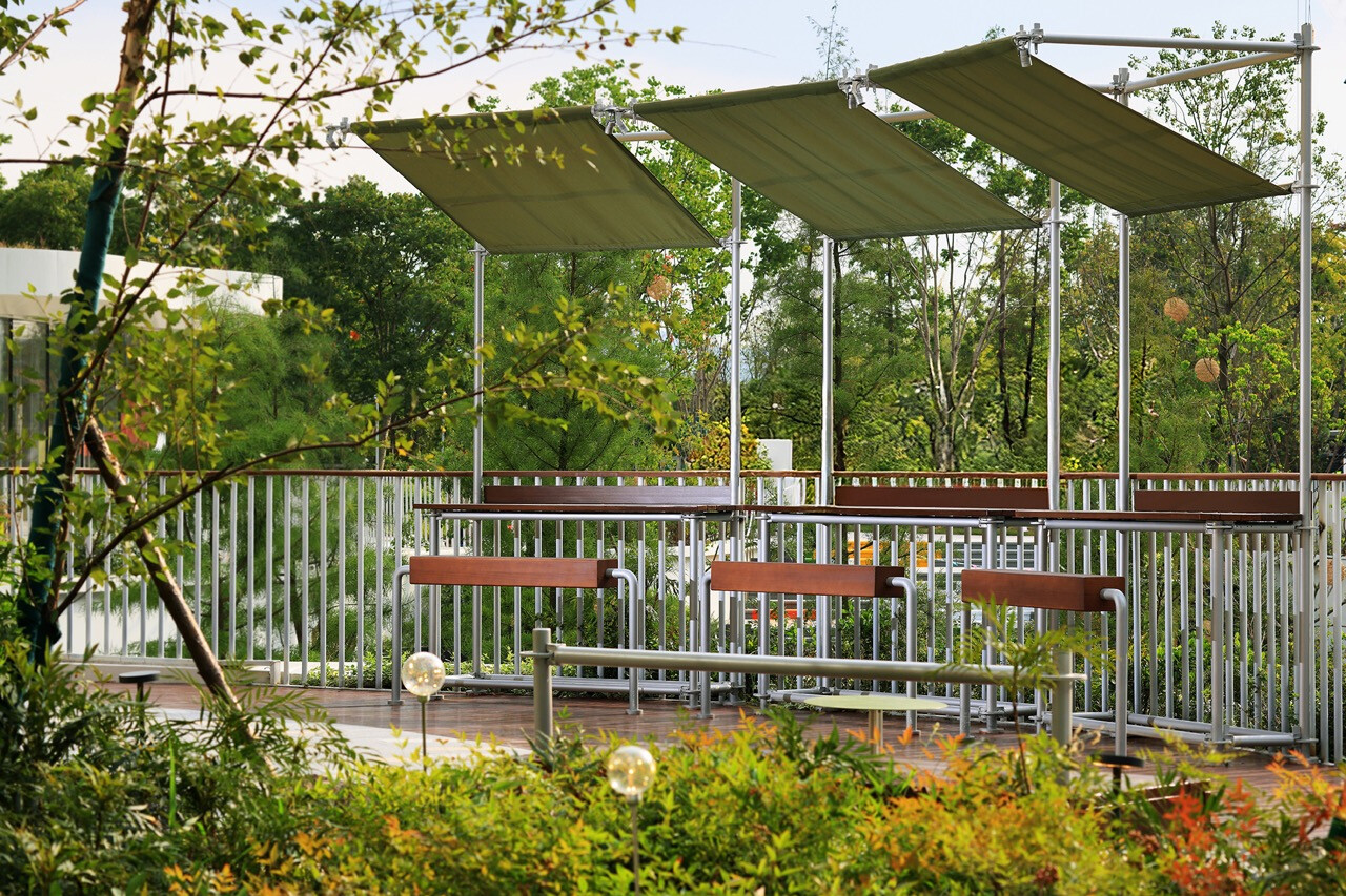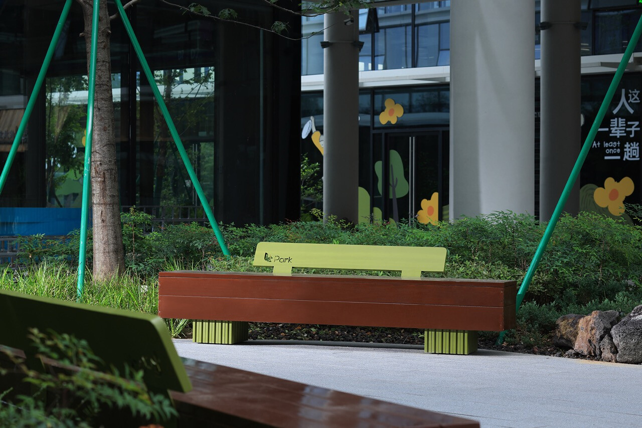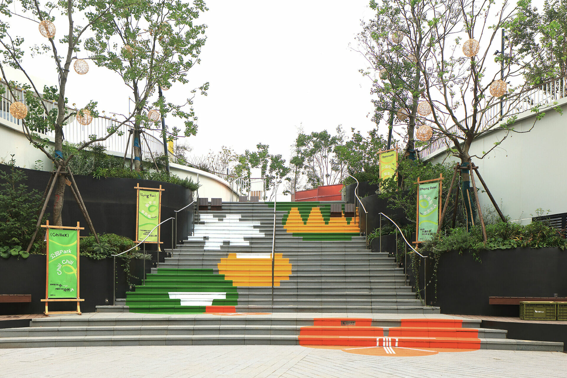 此外,杭州「親橙 Park」的草坪與舞台,被設計為一個可重複使用的彈性場域。在需要的時候,它可以承載活動、展演與社群聚集;在沒有活動的日子裡,它又自然退回風景之中,成為城市的一部分背景。這樣的設計,讓空間不必時時保持高張力狀態。它允許時間的介入,讓不同階段、不同使用方式在同一個場域中共存。商業、文化與社群的界線因此變得模糊,也更加真實。寵物友善並未被當成附加條件,而是自然地融入場景之中。座椅旁的牽引設計、專屬於毛孩的活動島嶼,以及藏在綠意裡的溫柔提醒,都讓空間多了一層關係的可能。