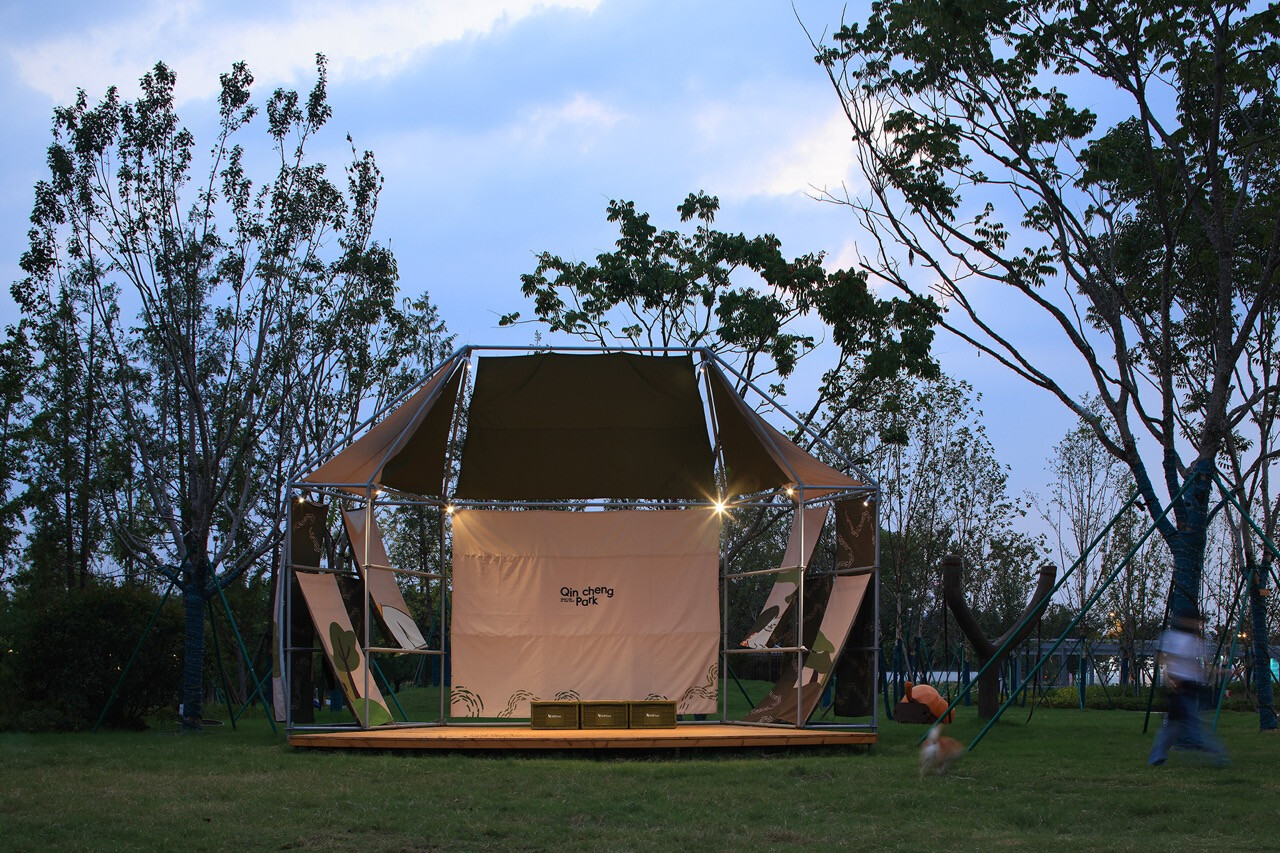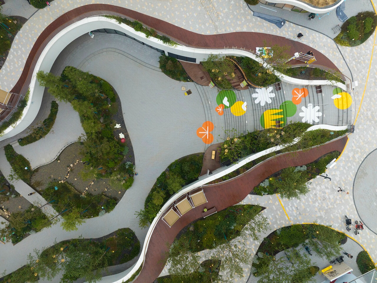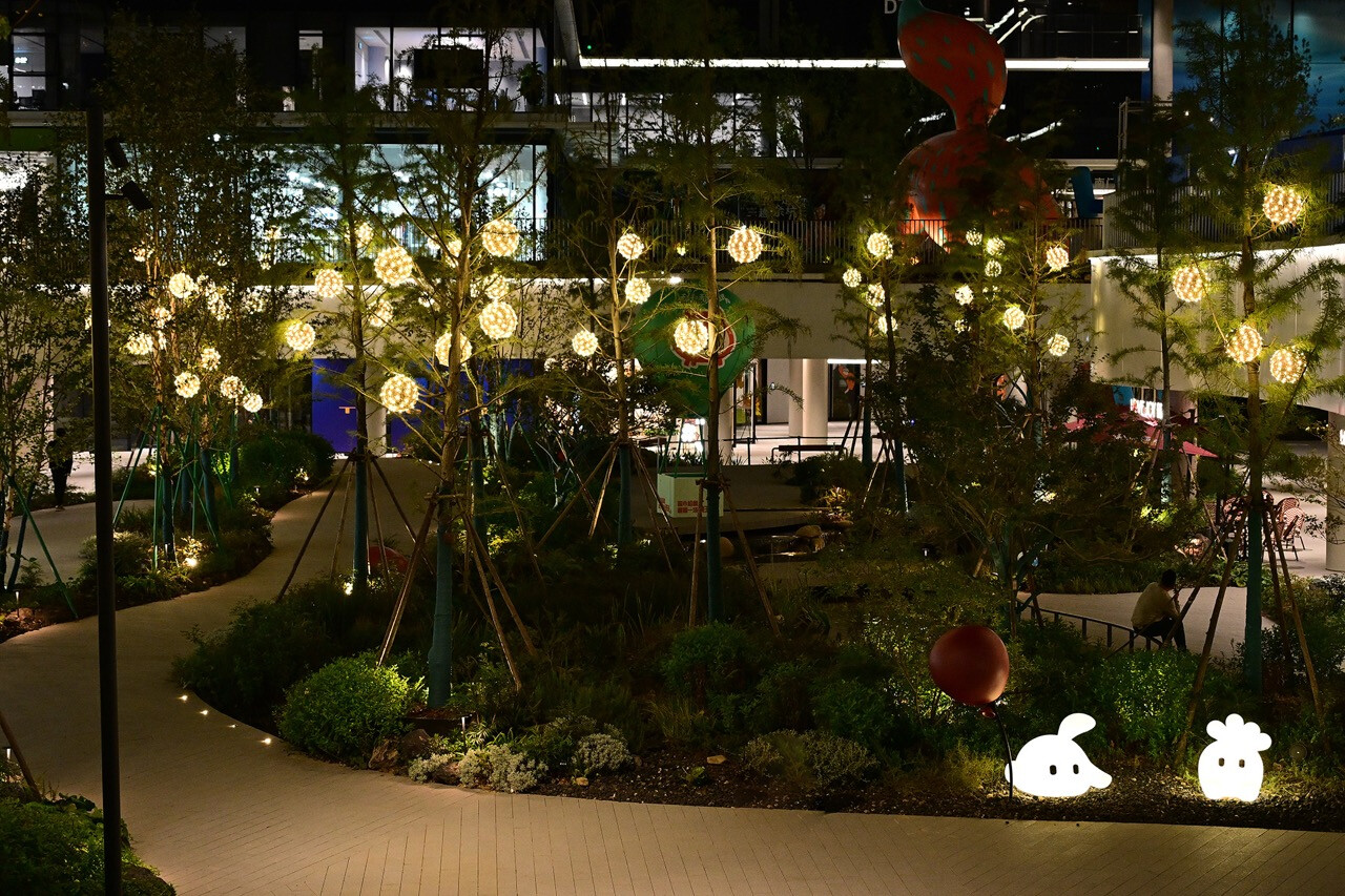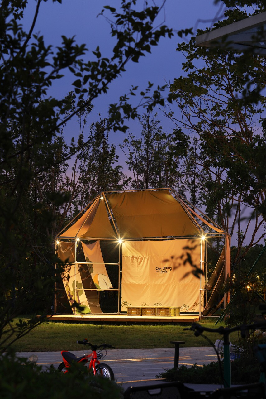 然而,在非尖峰的平日時段,杭州「親橙 Park」呈現出的畫面往往十分安靜。有人坐在樹蔭下等時間流過,有人牽著狗慢慢繞行,也有人短暫停留後再回到城市節奏裡。這些行為沒有被事先設定成「場景」,卻被空間溫柔地接住。自然在這裡並非裝飾,而是一位真正的參與者。下沉庭院中散落的松果造型座椅,像是自然掉落後留下的痕跡,提醒人們注意腳下與身旁的細節。在編織般的樹維結構之間,兩棵樹透過蘑菇彼此「交談」,微光閃爍,彷彿將自然的節奏轉譯為可被感知的語言。