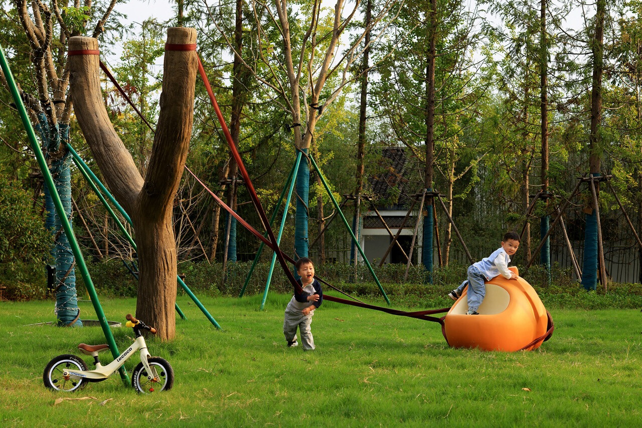 城市的速度,往往快得令人無從選擇。人們在明確的入口與出口之間穿行,在被設計好的動線裡完成目的,然後離開。久而久之,「停留」變成一種奢侈的行為,也逐漸從城市生活中被抹去。杭州「親橙 Park」的出現,像是一個溫和卻堅定的提問。當你離開杭州繁忙的工作節奏,跨進這片場域時,空氣的密度似乎改變了。樹影被拉長,聲音變得柔軟,時間不再被分割成效率單位,而開始回到感知本身。這裡沒有急著迎接你,也不催促你離開,它只是靜靜地存在,等待人們重新發現「停下來」的價值。